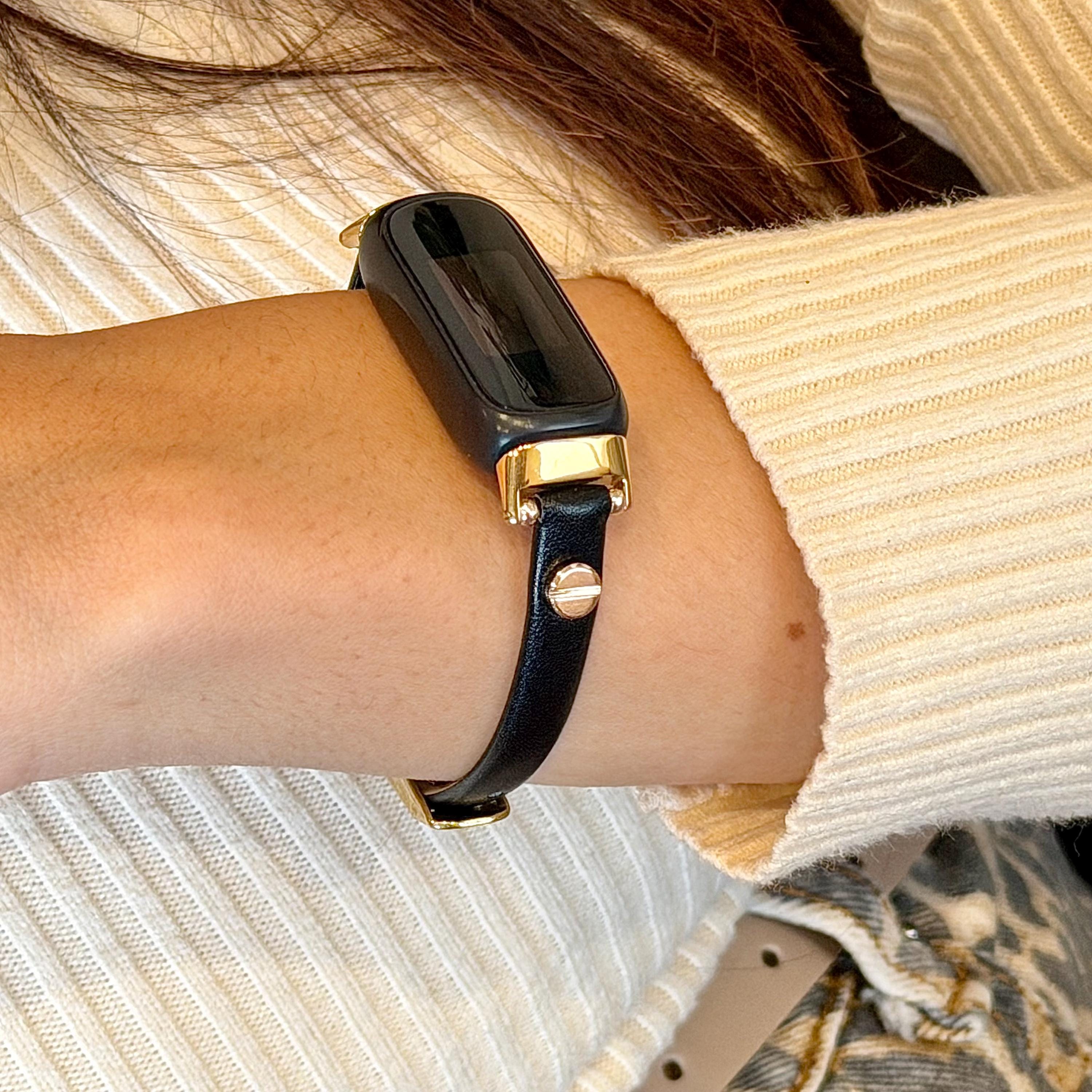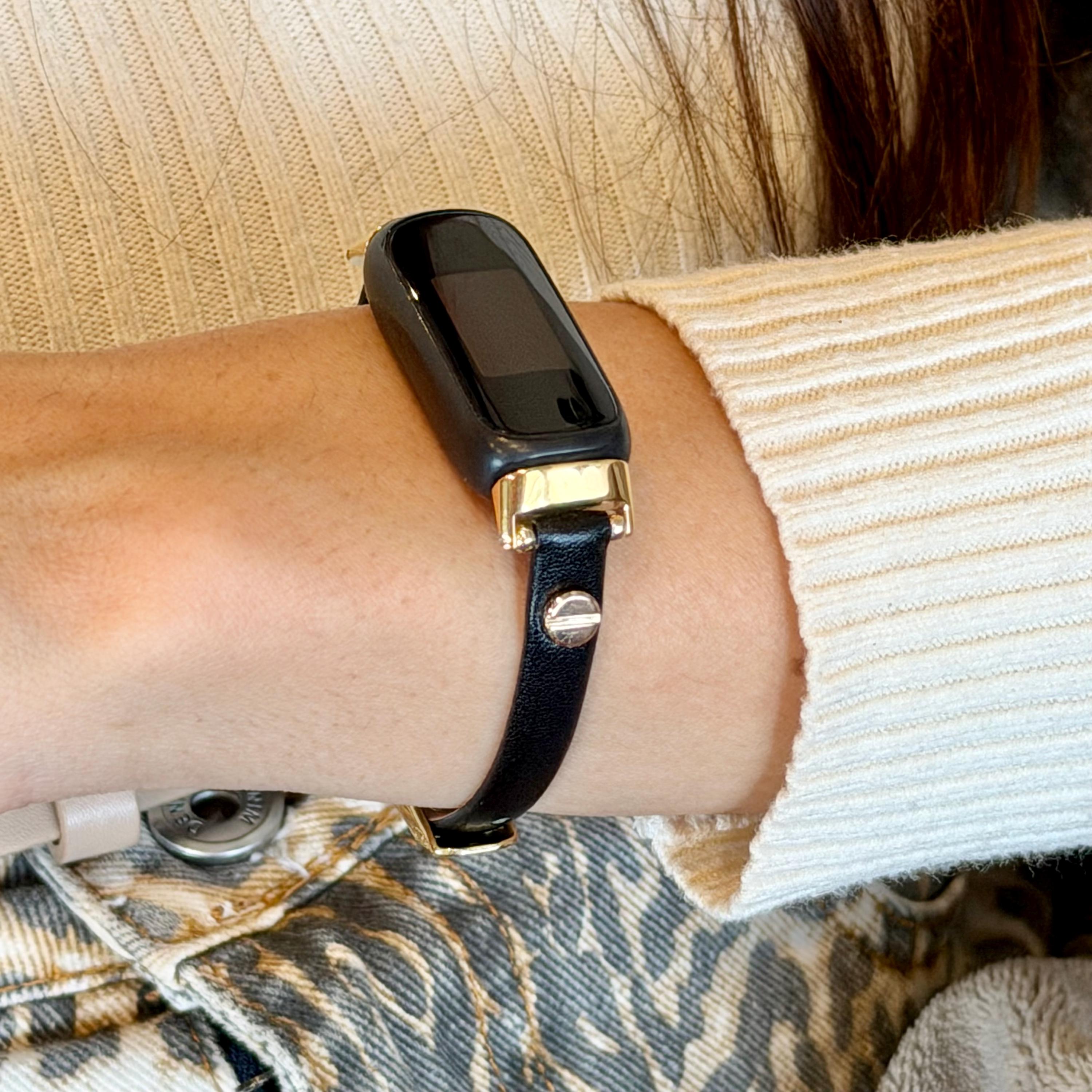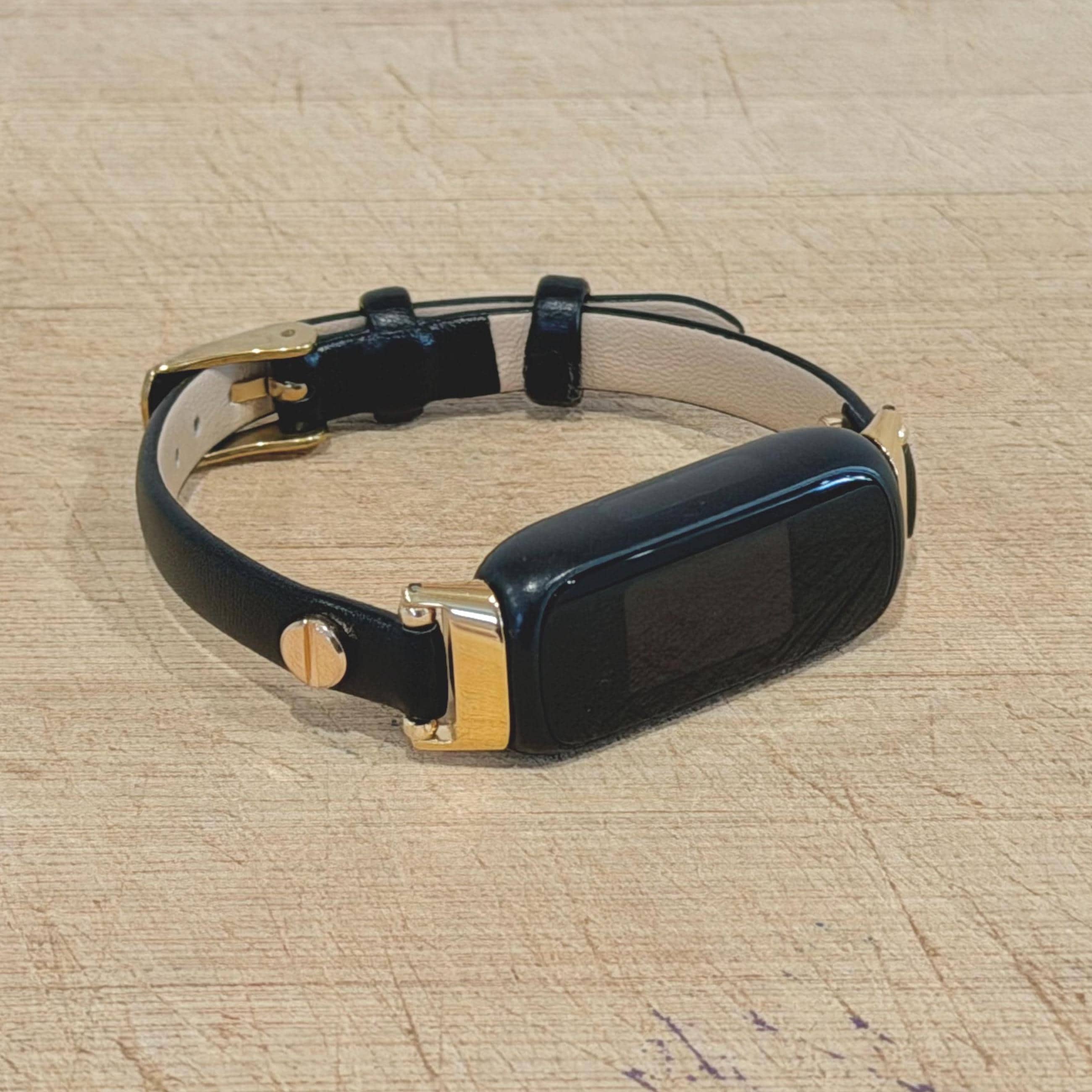 Slim Black Leather Fitbit Luxe Band Gold Accent Adjustable Bracelet
