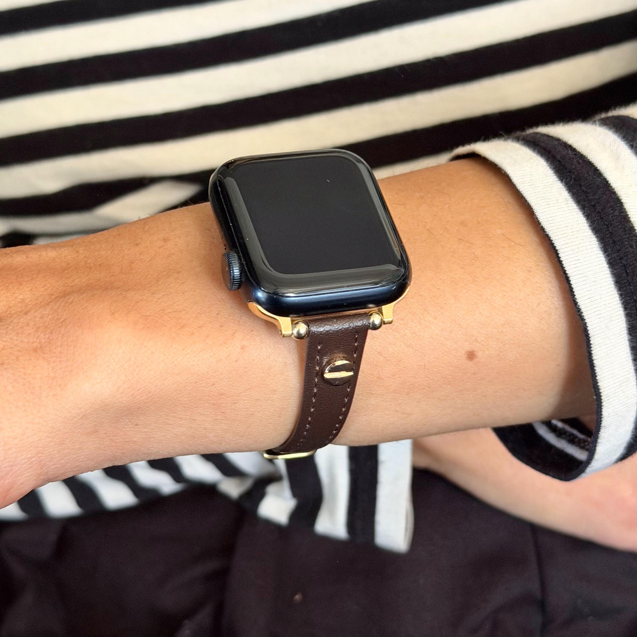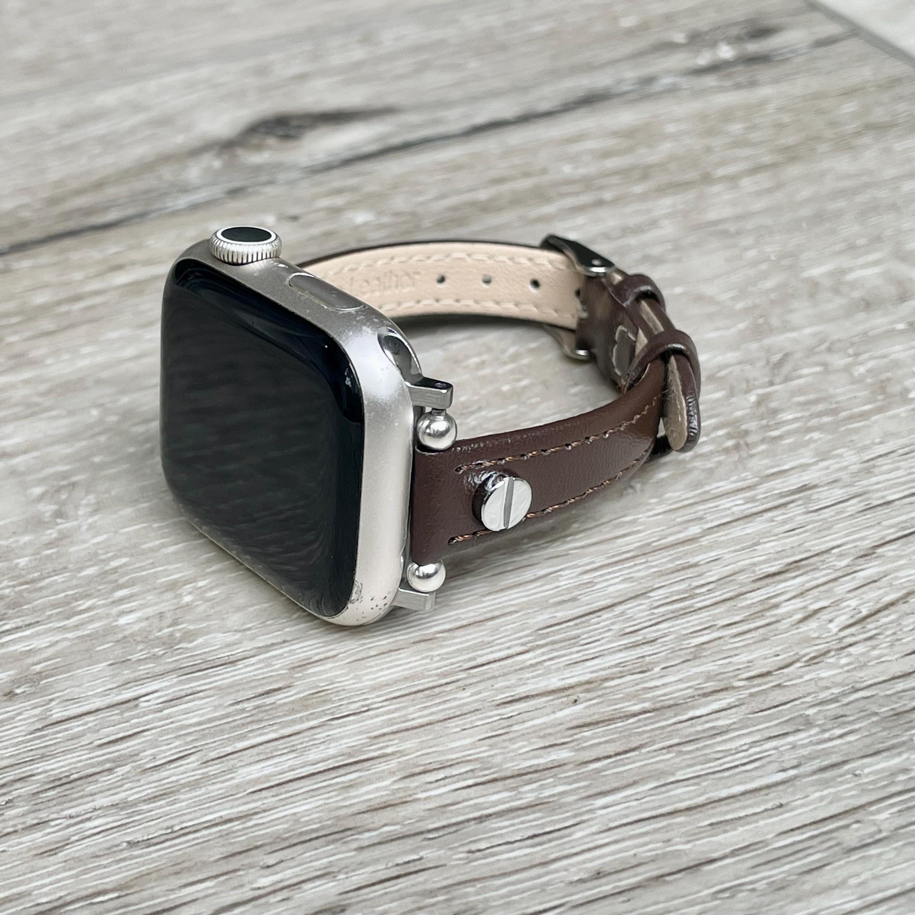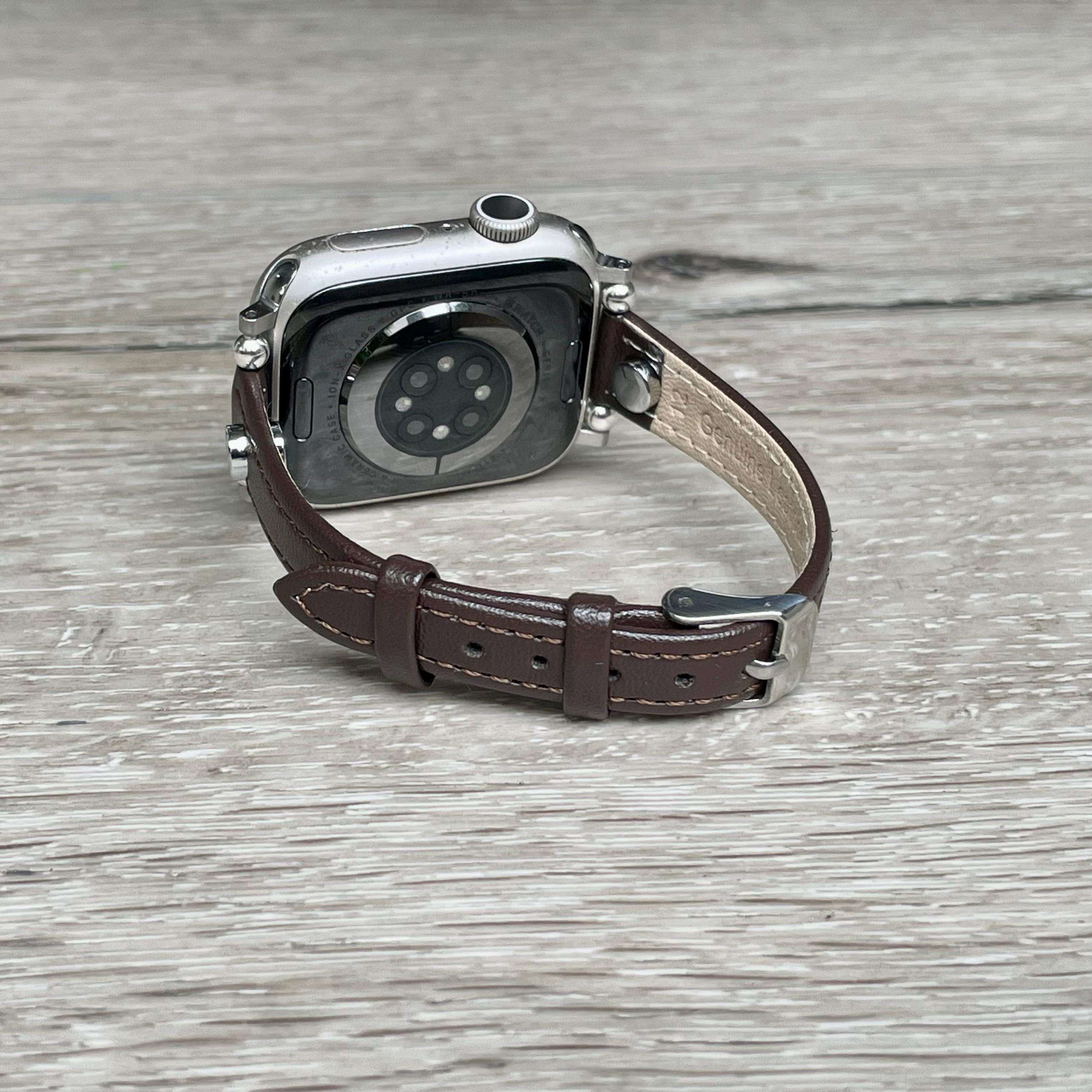 Elevate your Apple Watch experience with this slim dark brown leather Apple Watch band, perfectly designed to complement 38mm, 41mm, 42mm, 44mm, 45mm, and 46mm models including Ultra 2. Featuring a sleek, graceful design visible in the rich leather texture and fine stitching, this adjustable strap blends classic elegance with modern versatility, making it a standout accessory for any outfit.