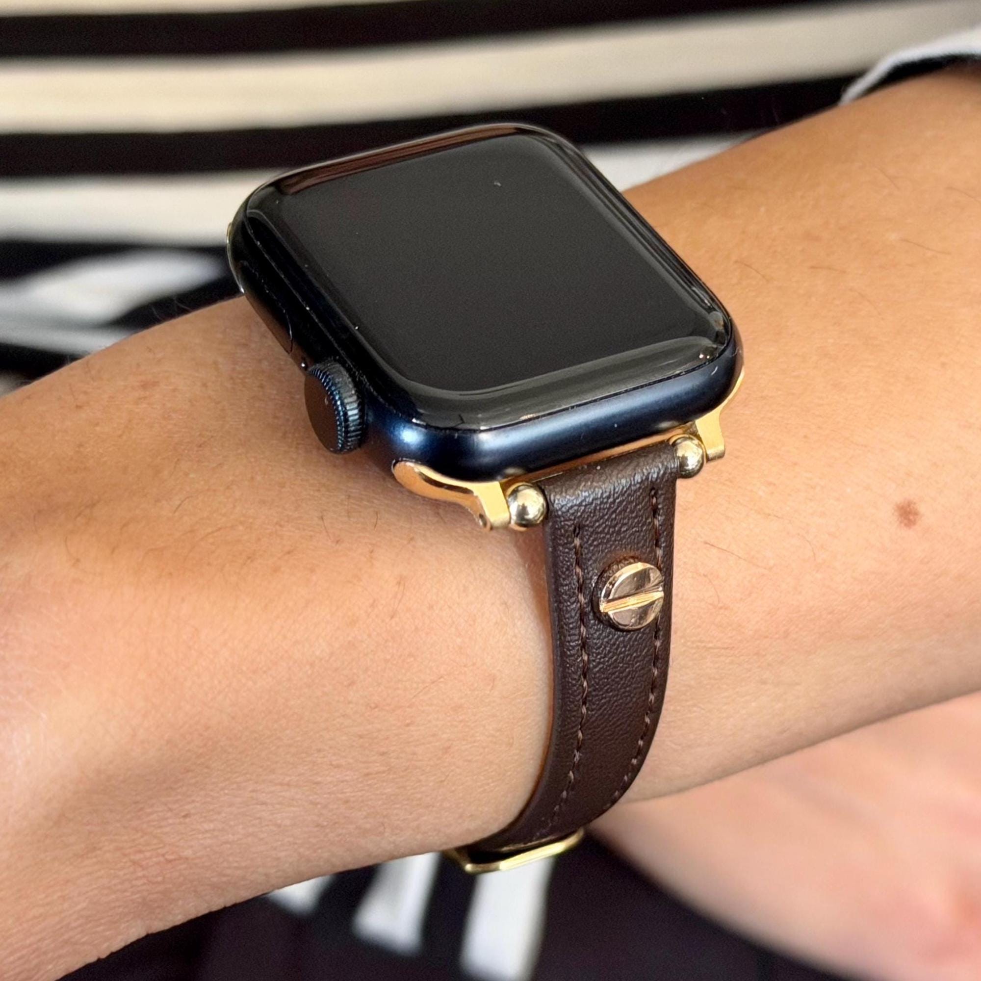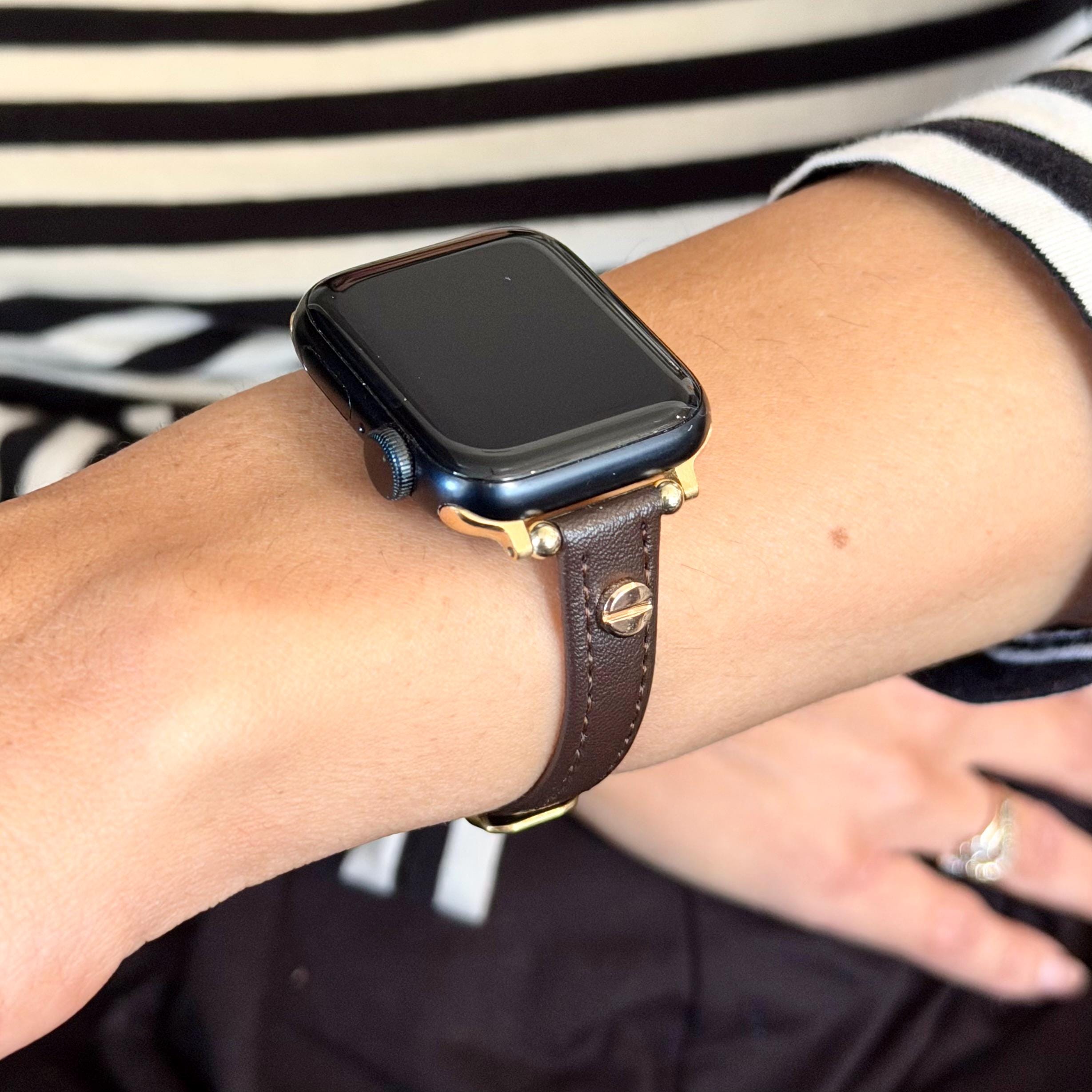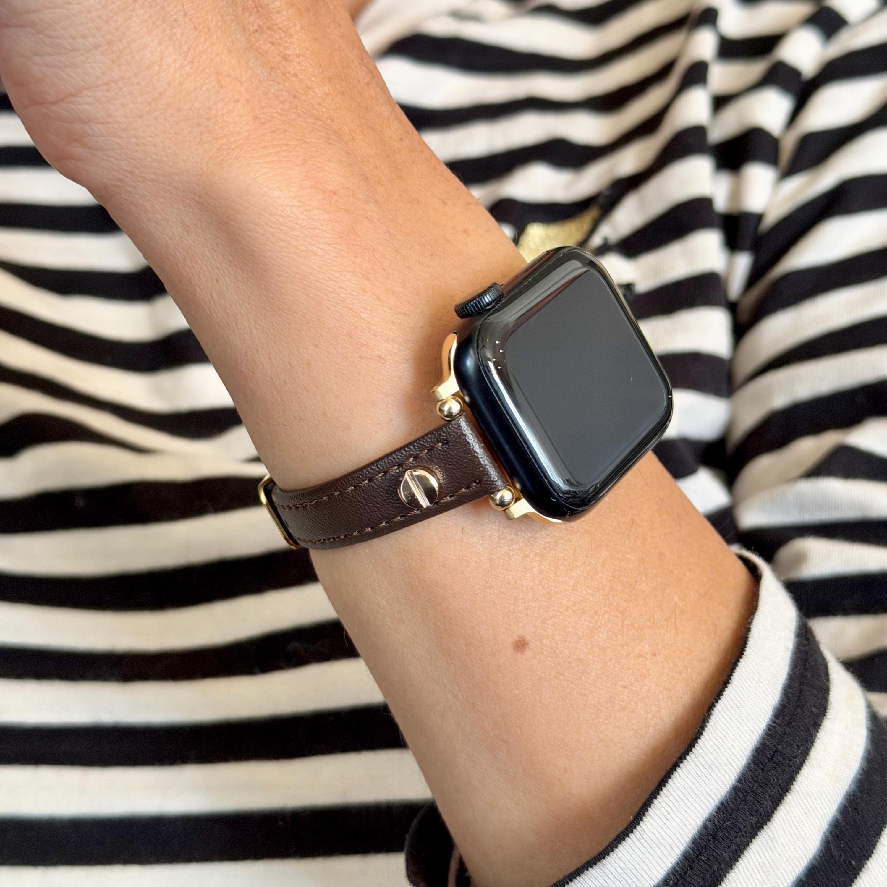 Elevate your Apple Watch experience with this slim dark brown leather Apple Watch band, perfectly designed to complement 38mm, 41mm, 42mm, 44mm, 45mm, and 46mm models including Ultra 2. Featuring a sleek, graceful design visible in the rich leather texture and fine stitching, this adjustable strap blends classic elegance with modern versatility, making it a standout accessory for any outfit.