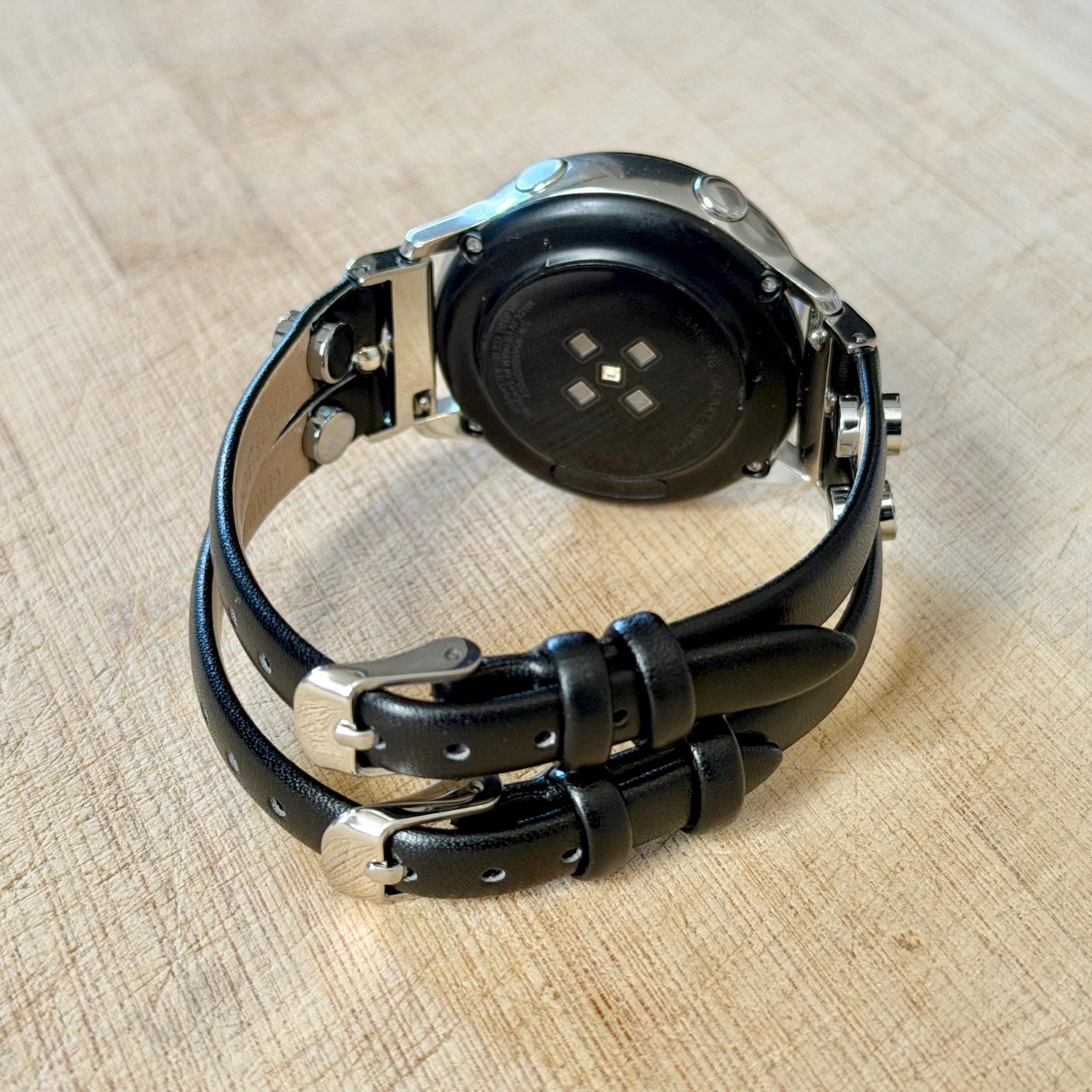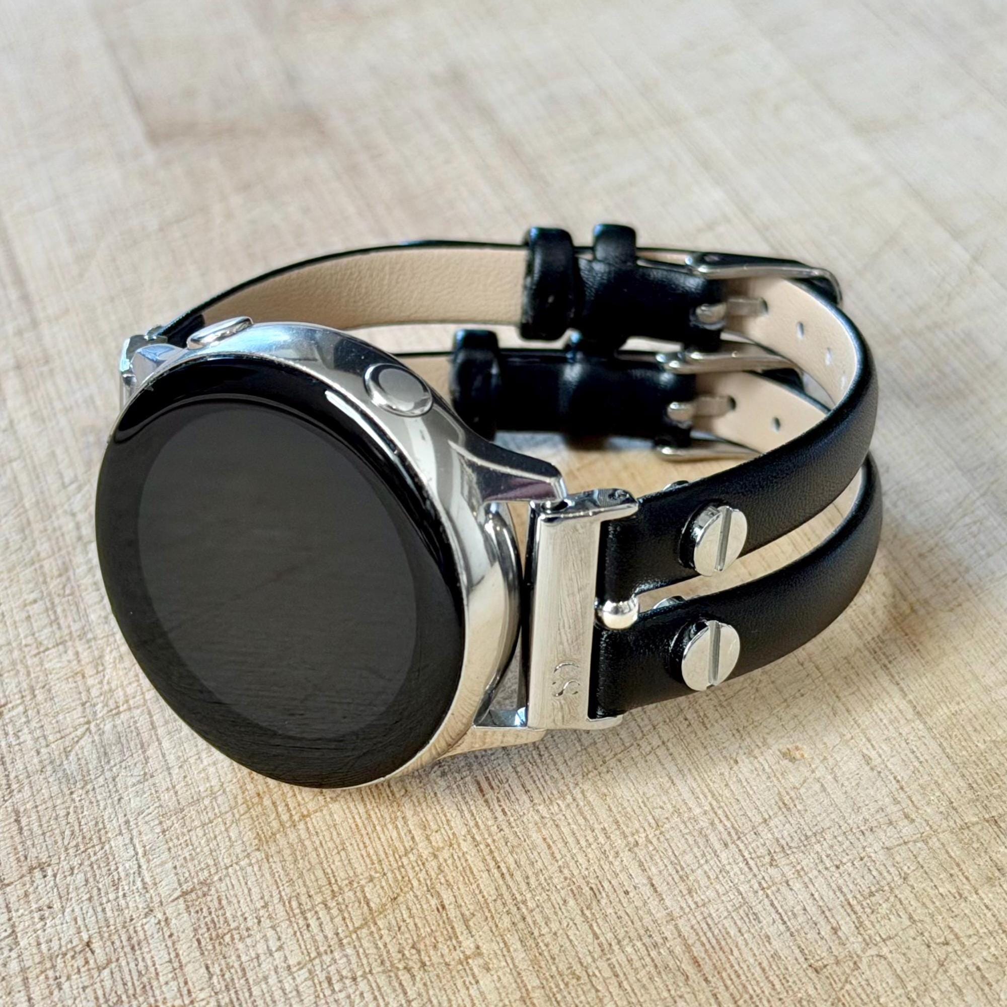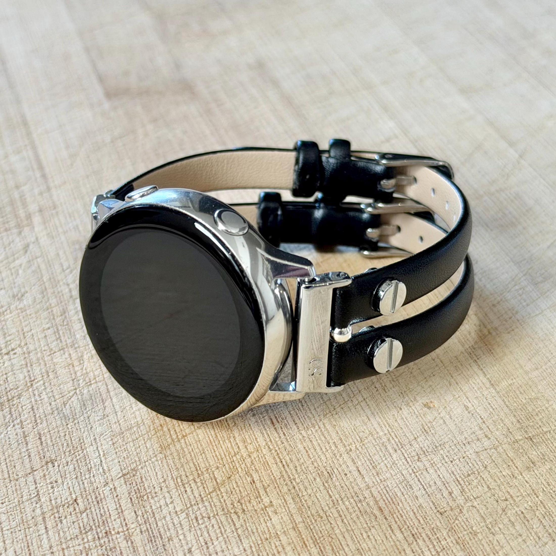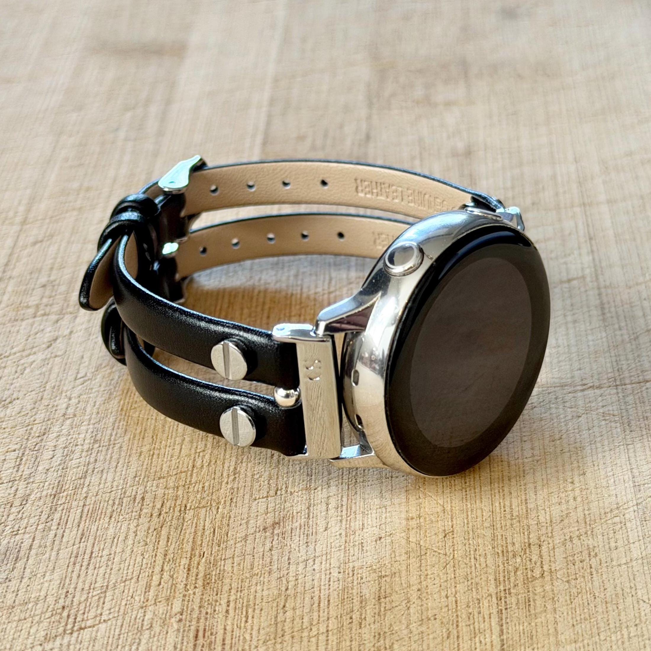 Black Leather Bracelet for Galaxy Watch: Adjustable Women's Wristband, Silver Accents Strap