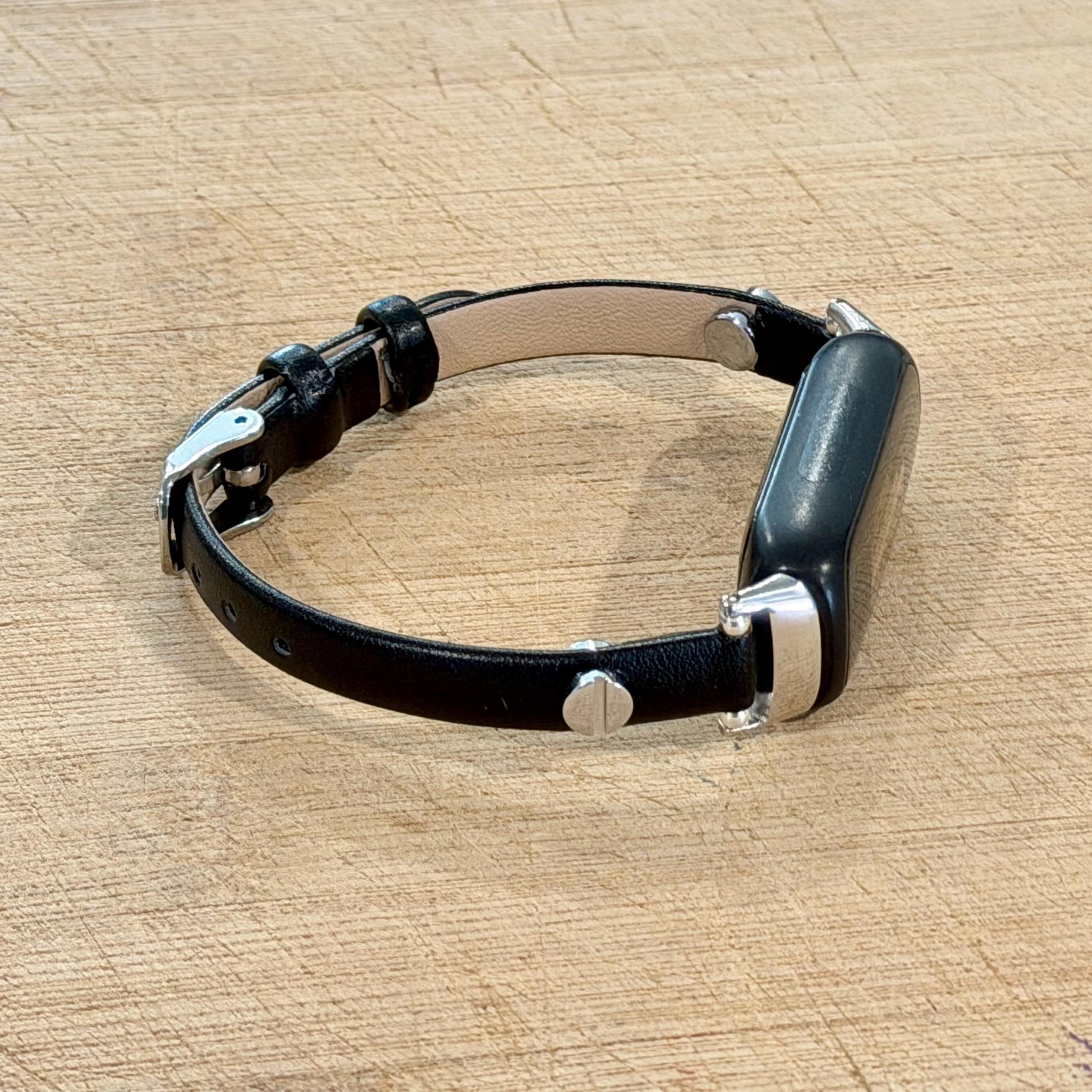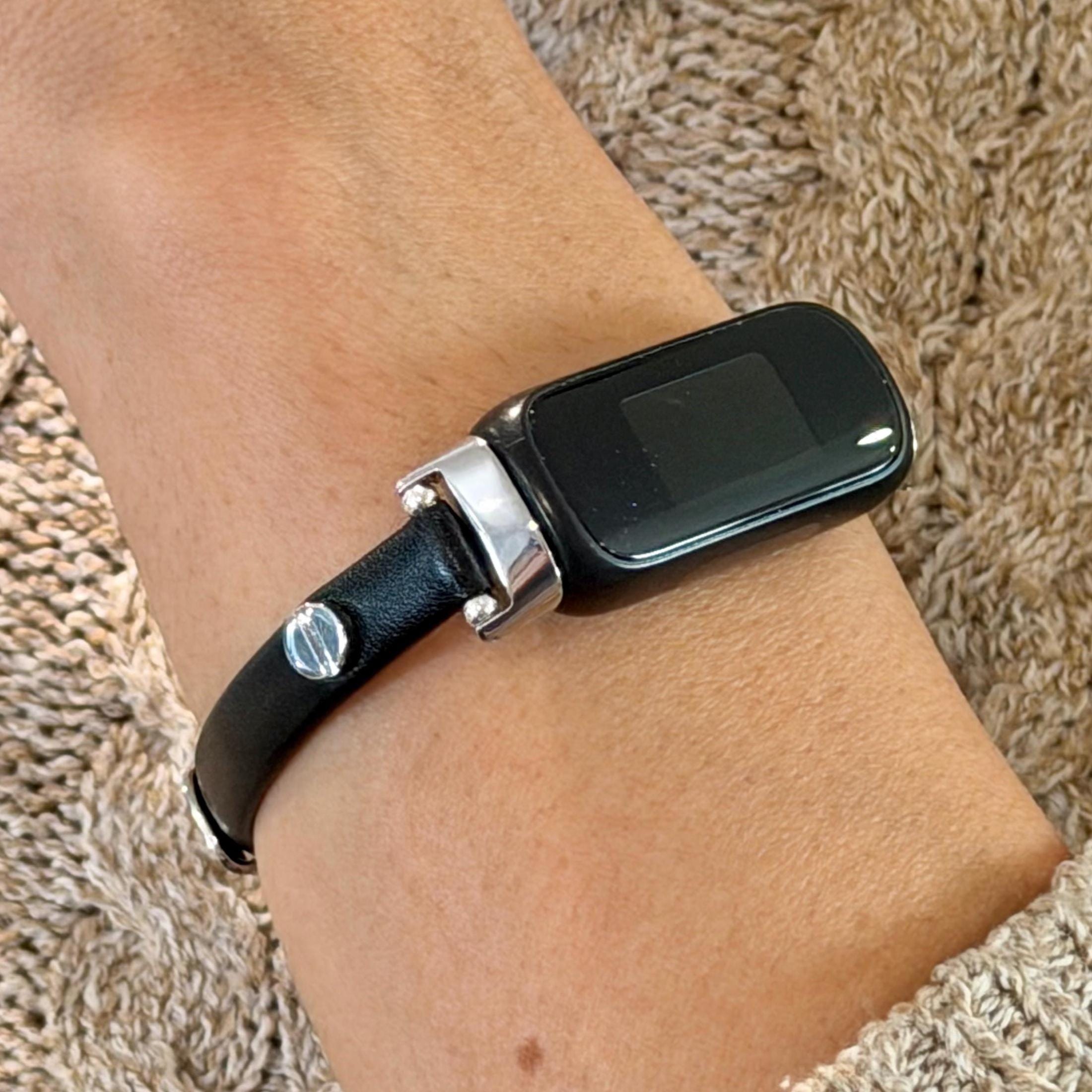 Slim Black Leather Fitbit Luxe Band, Silver Accents Strap for Women!