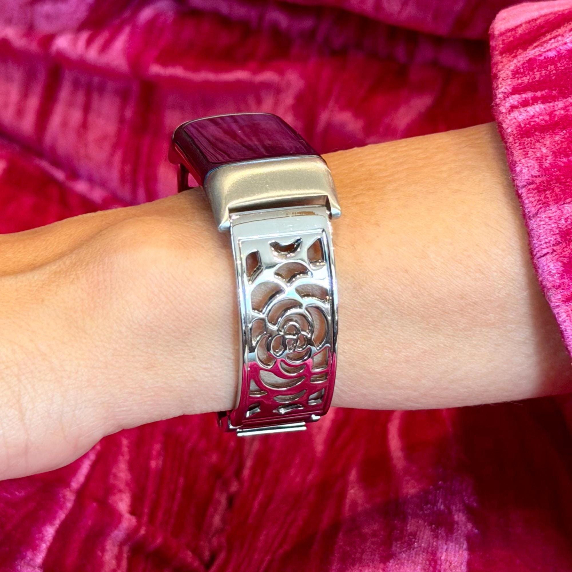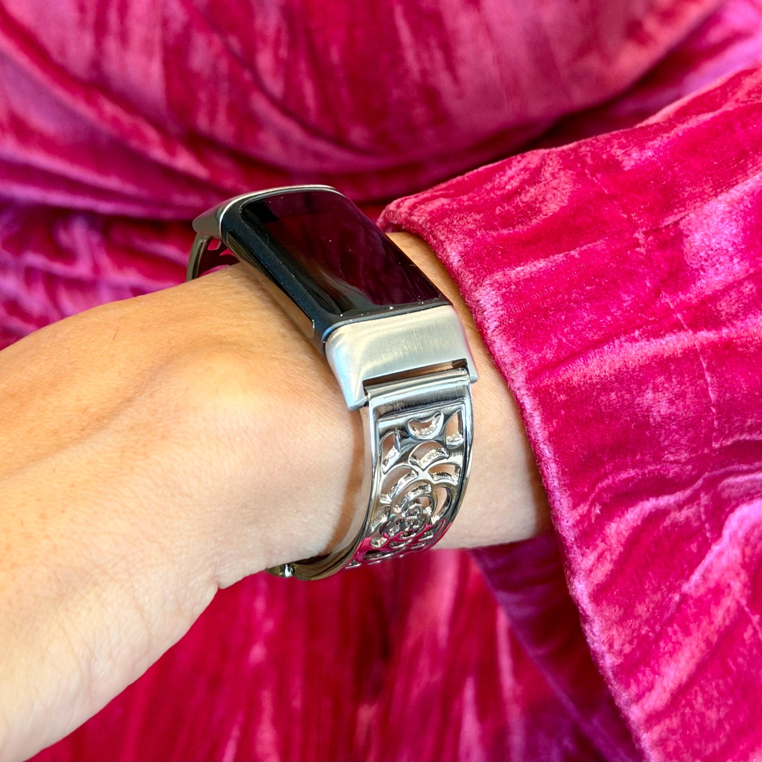 Silver Fitbit Charge 6 Band Women Floral Bracelet Adjustable Links Bangle