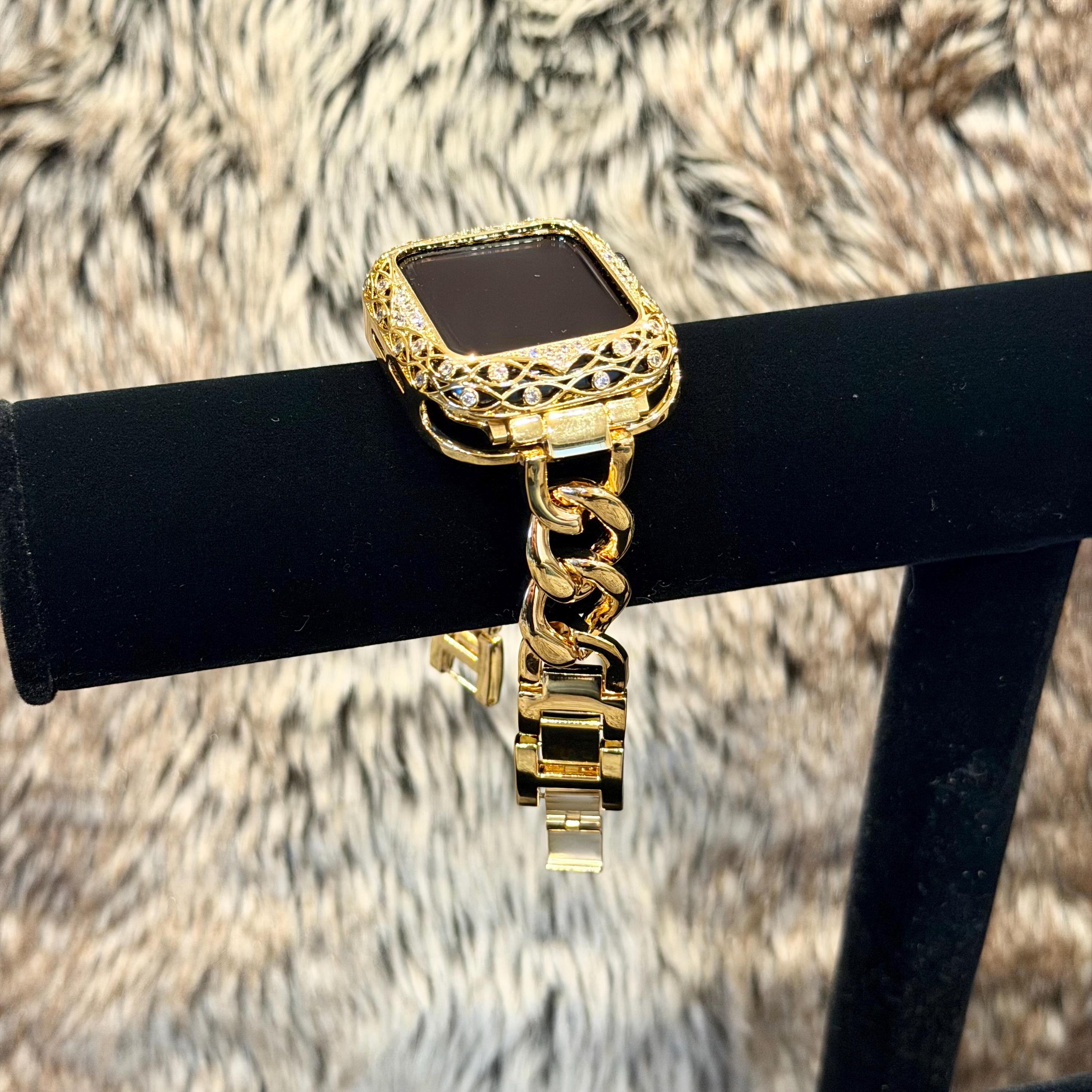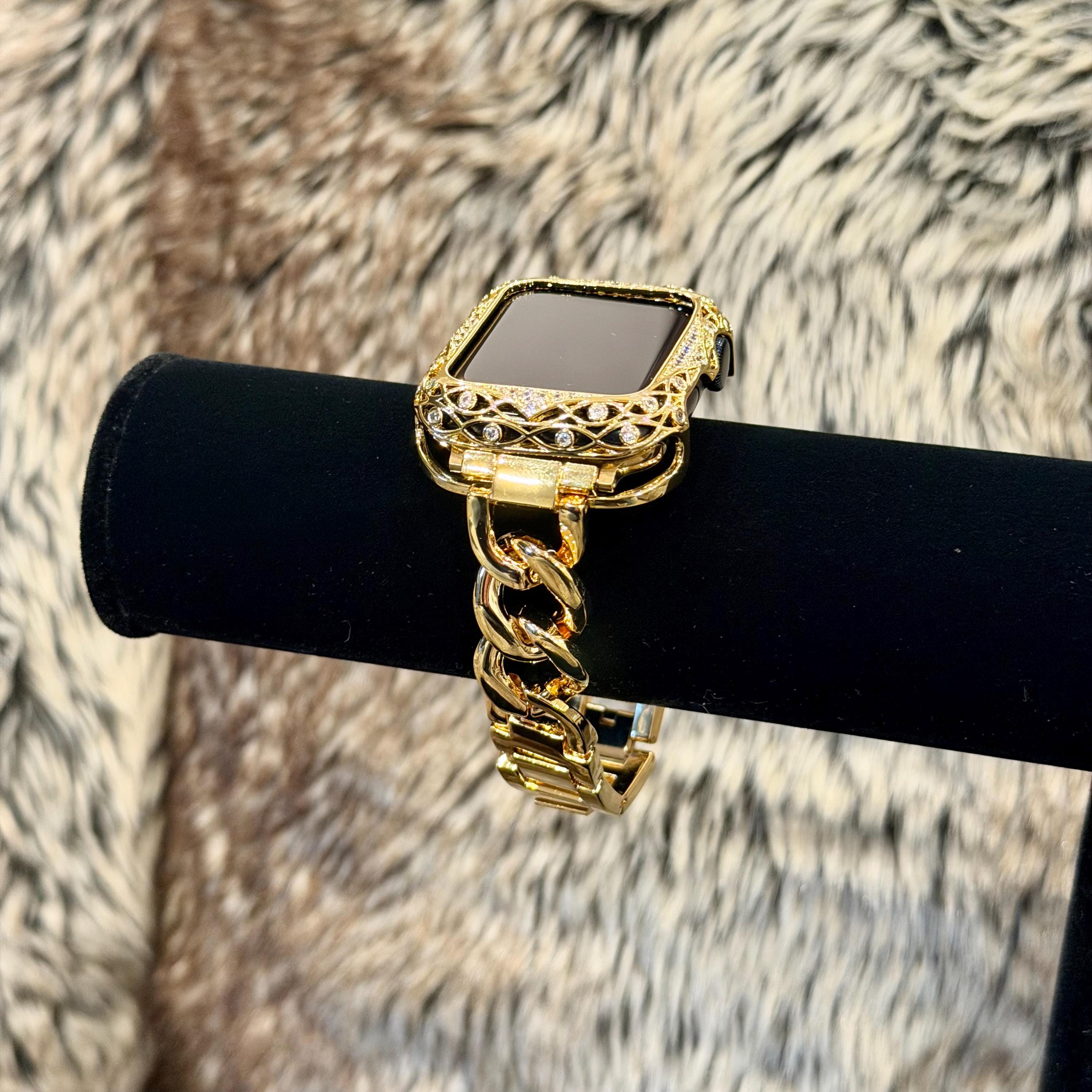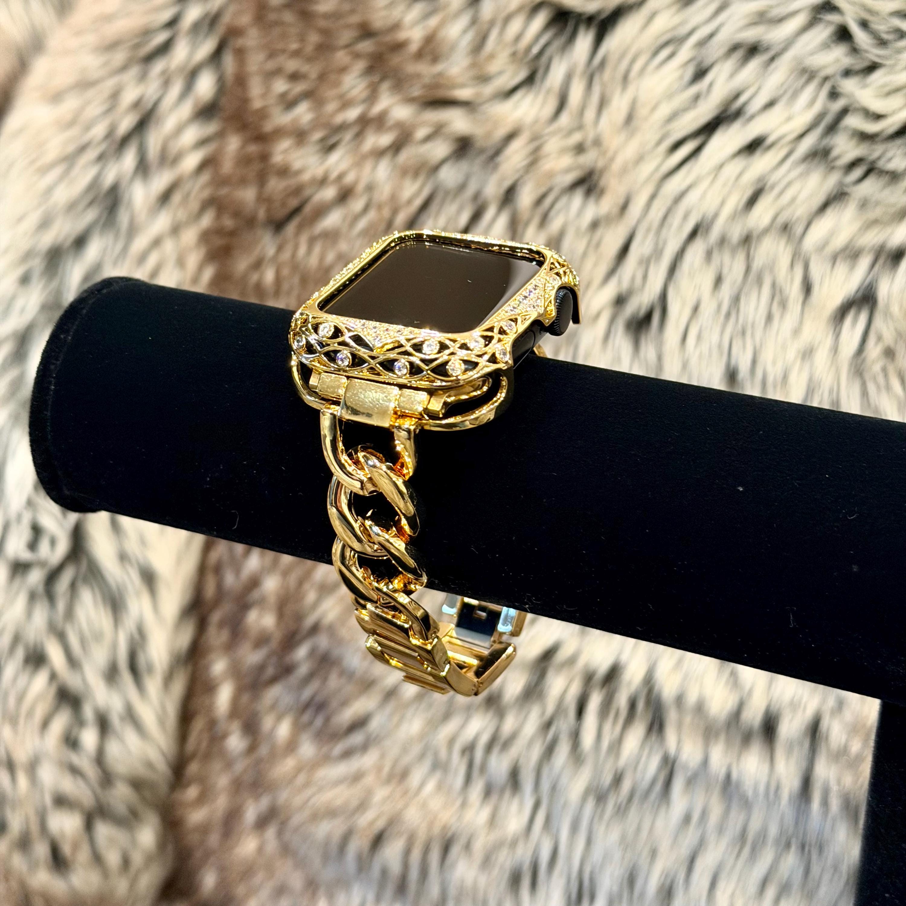 Elevate your style game with the stunning gold Apple Watch band with rhinestones .