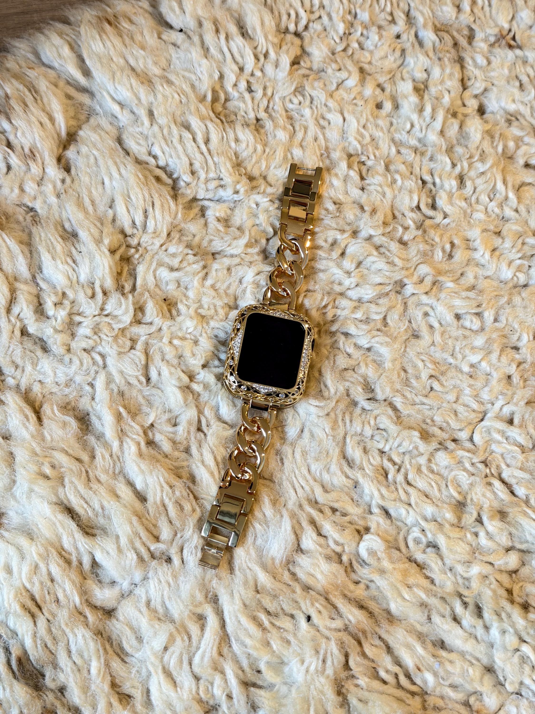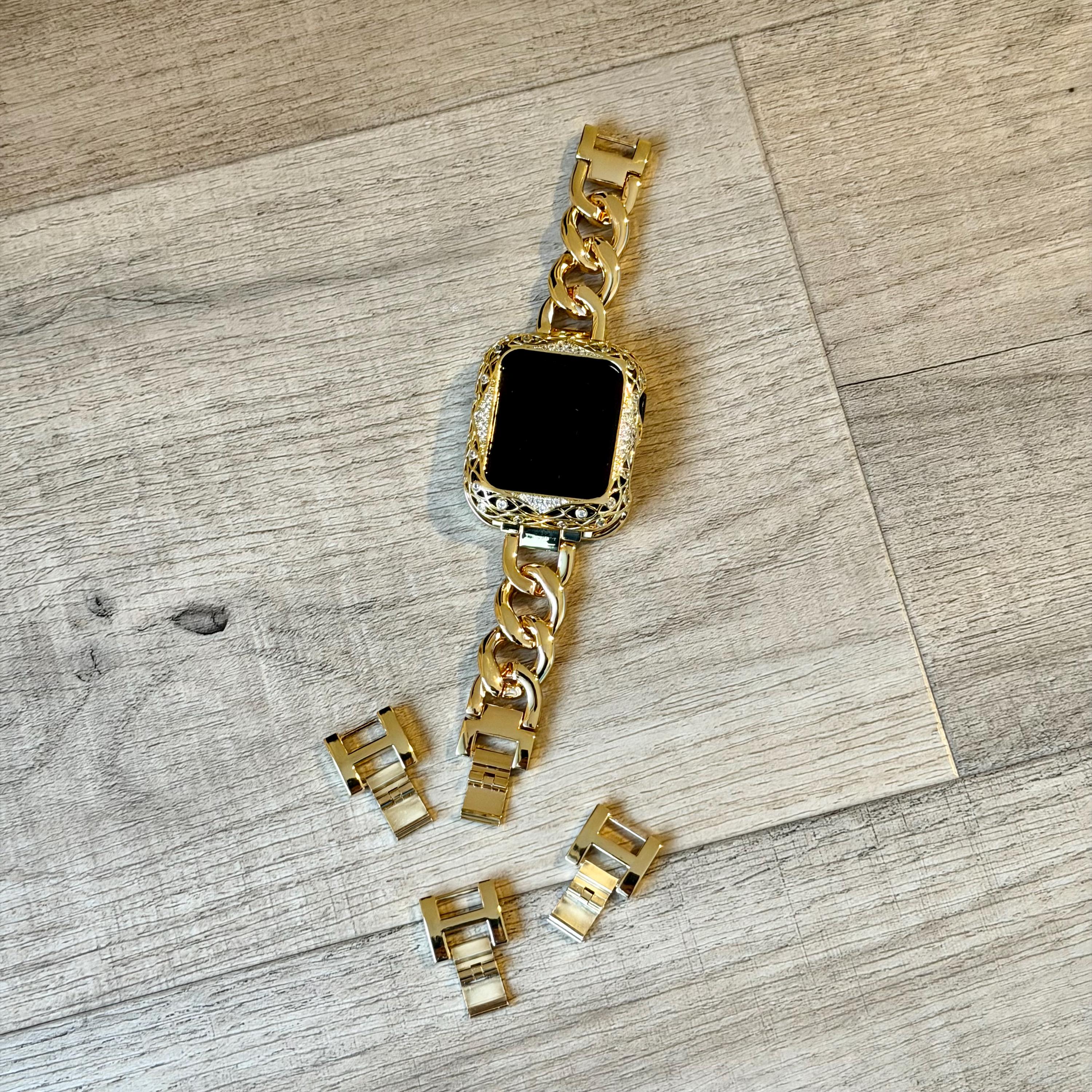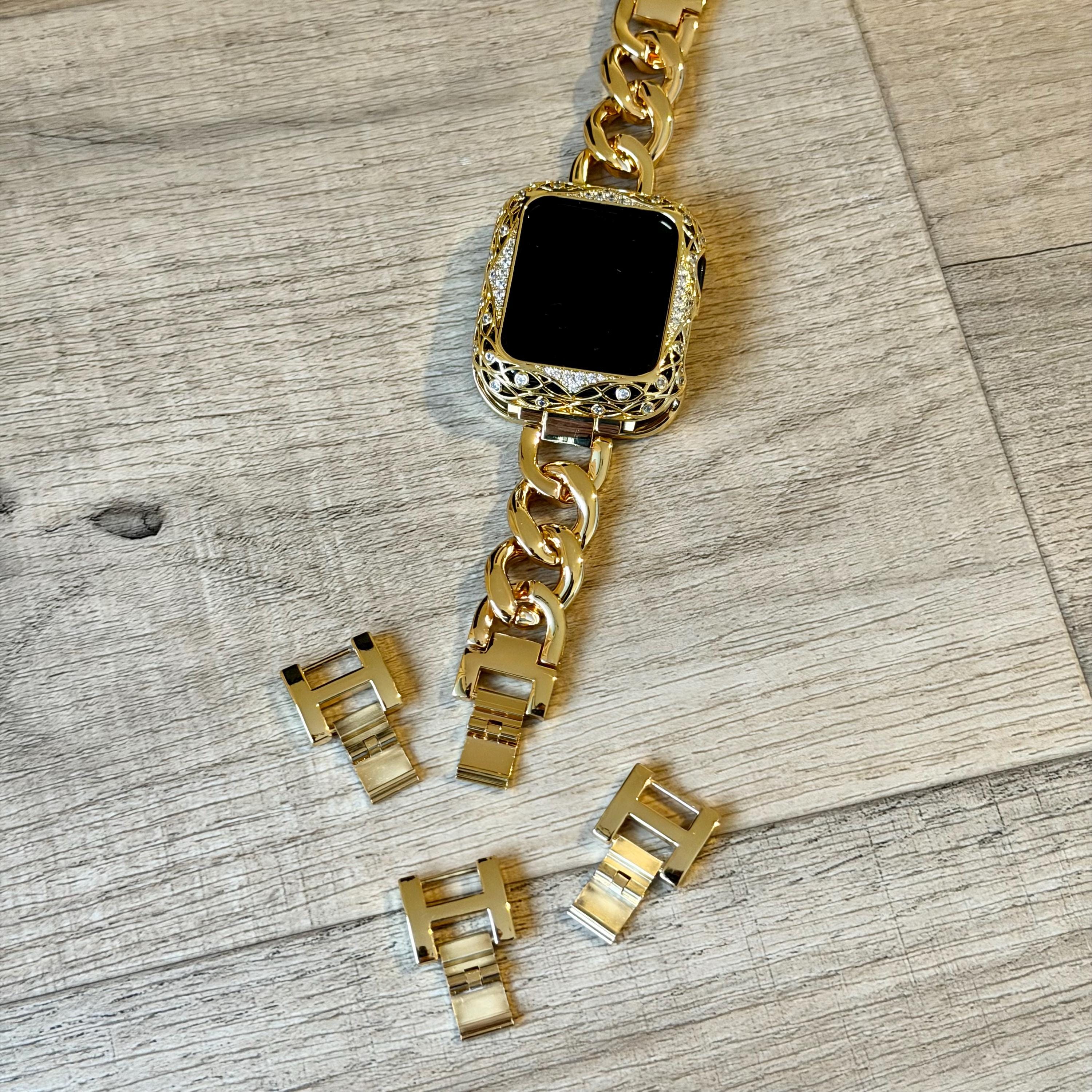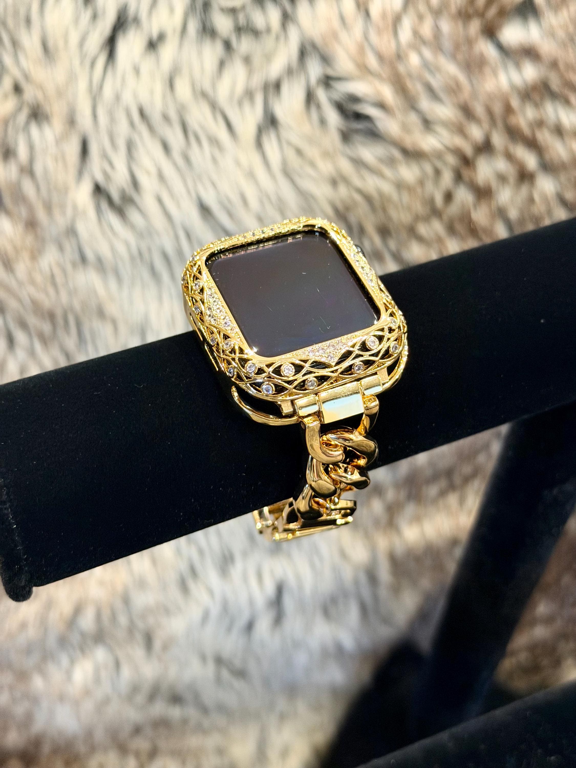 Elevate your style game with the stunning gold Apple Watch band with rhinestones .
