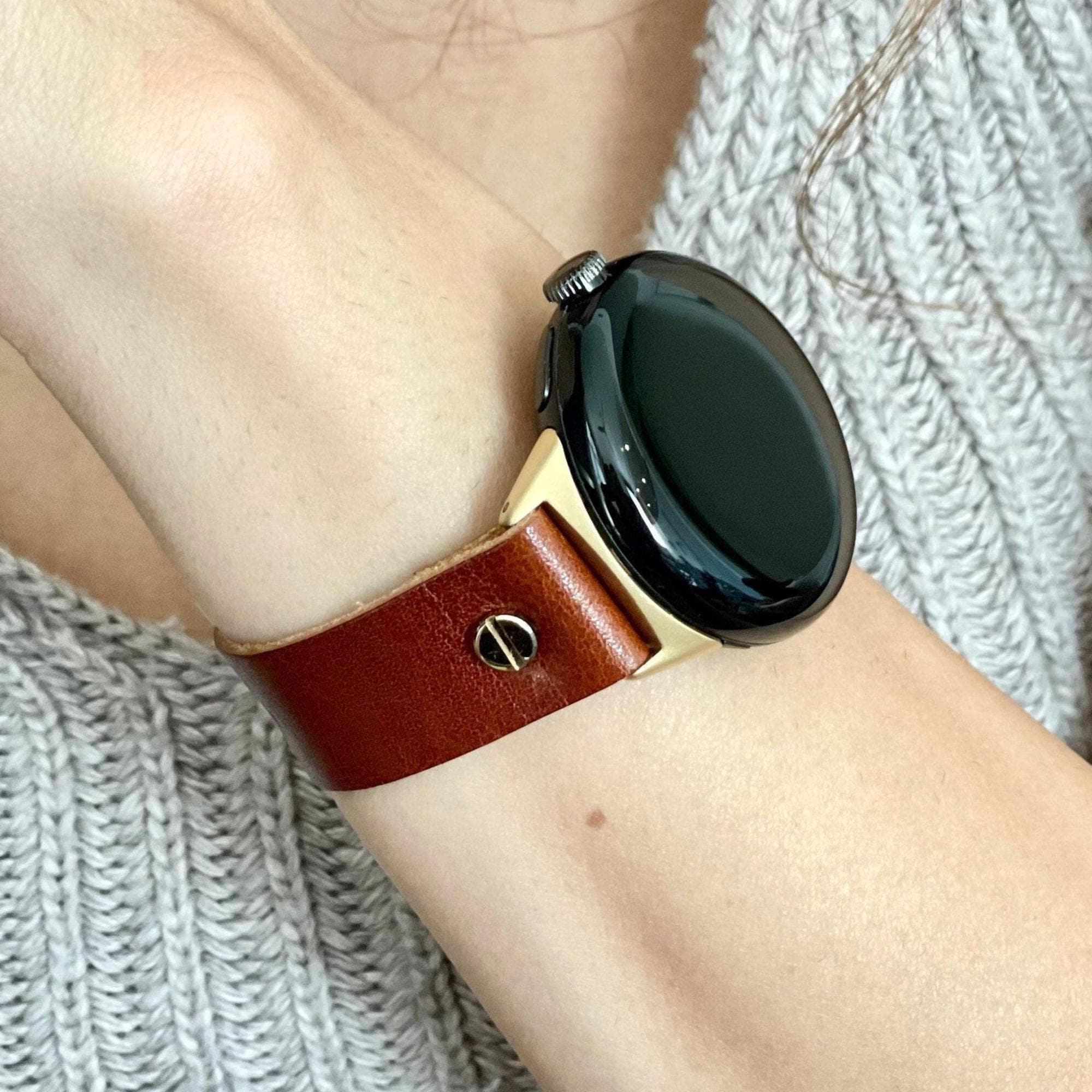 Google Pixel Watch Leather Band - Grain Brown Italian Leather Strap, Gold Hardware (41mm 45mm)