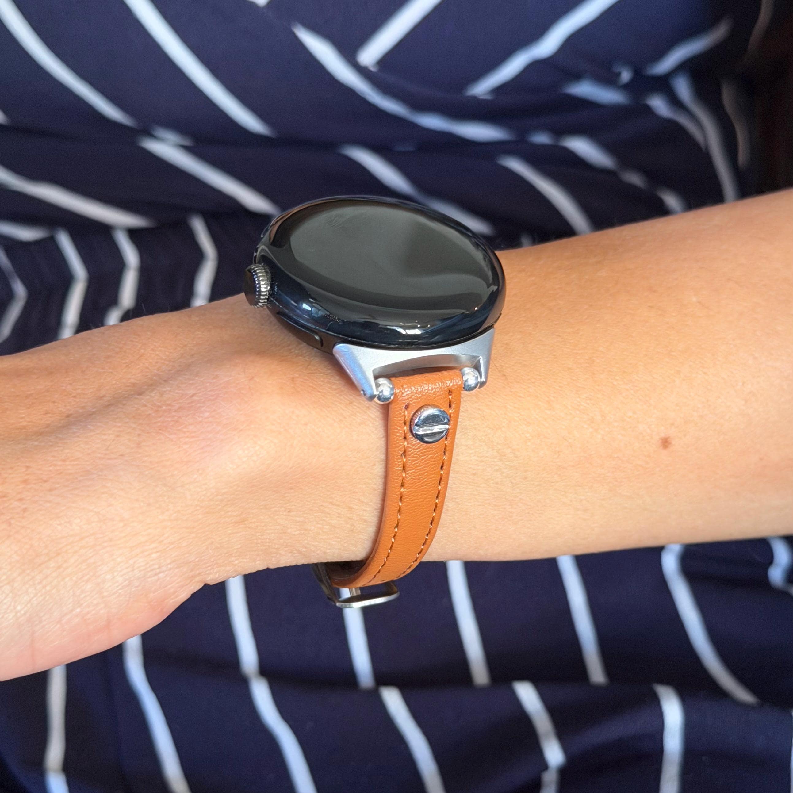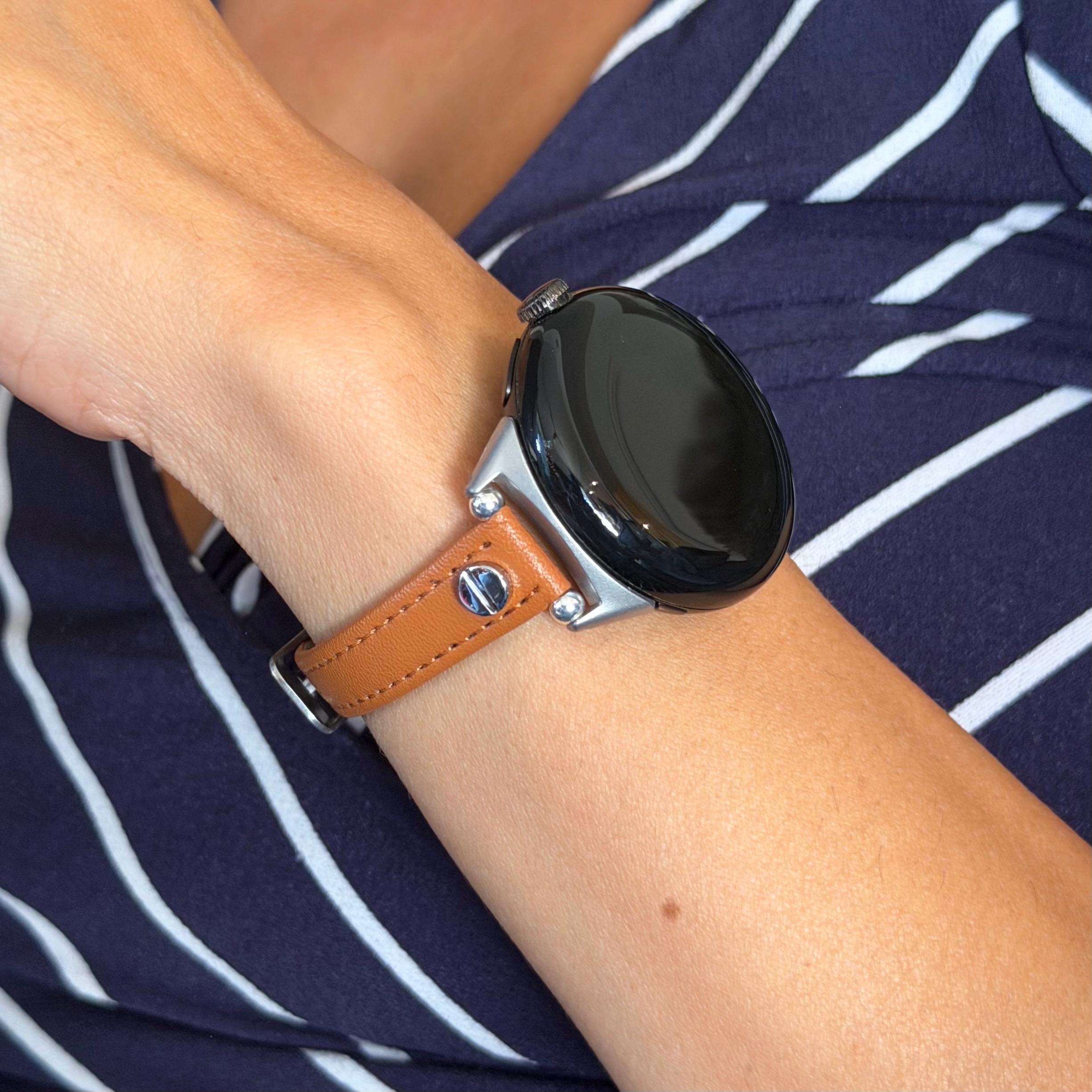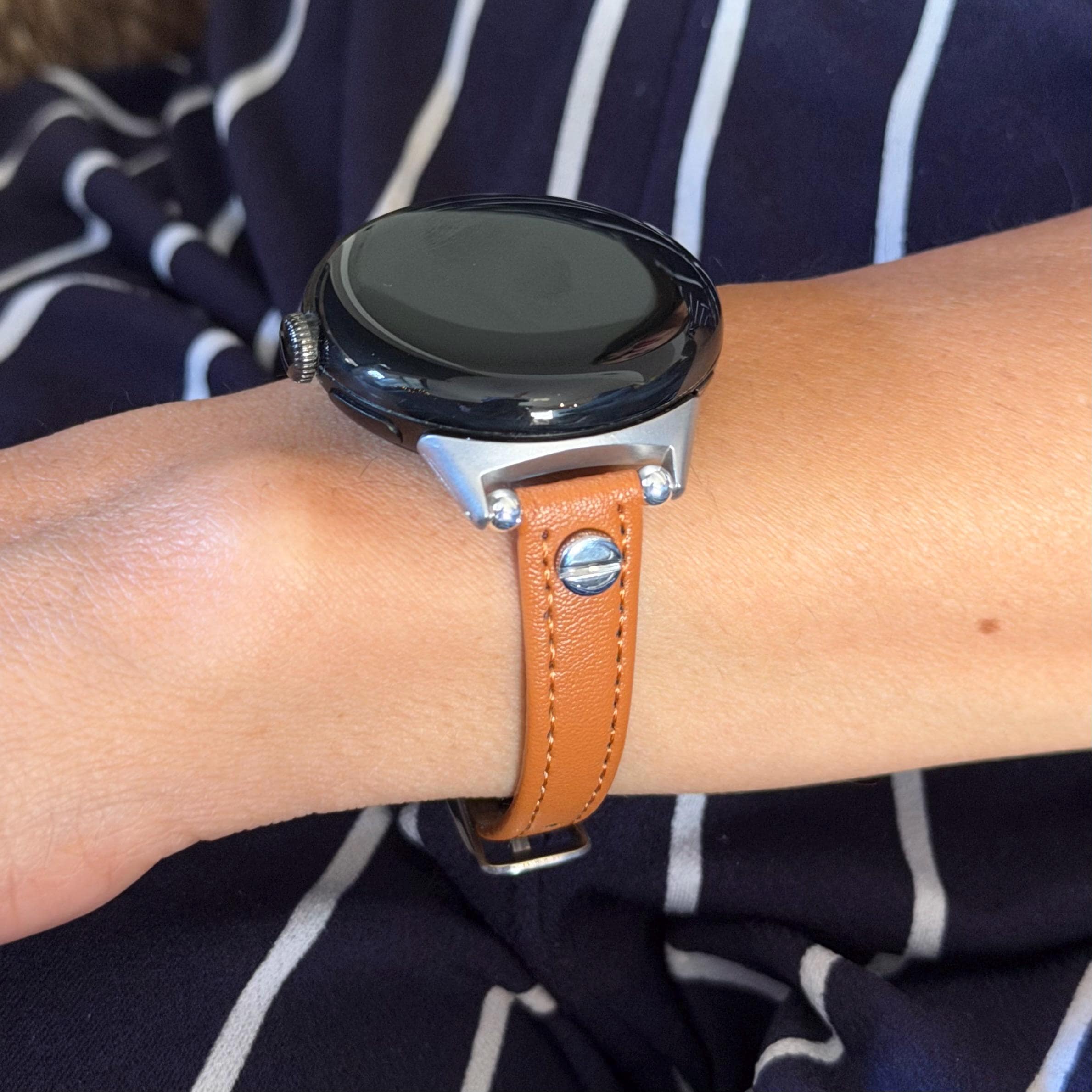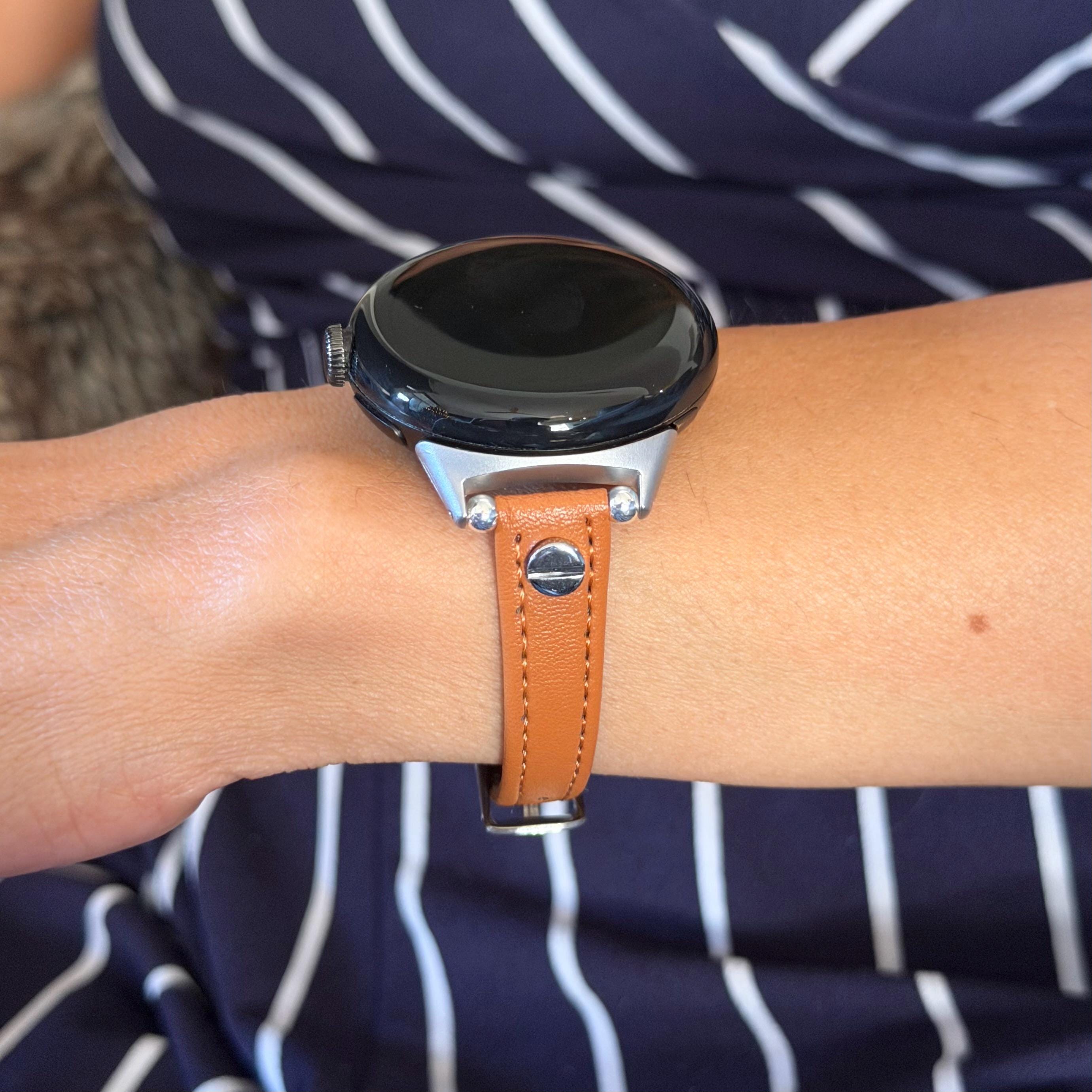 Slim Brown Leather Google Pixel Watch Band Strap, Silver Accents Bracelet