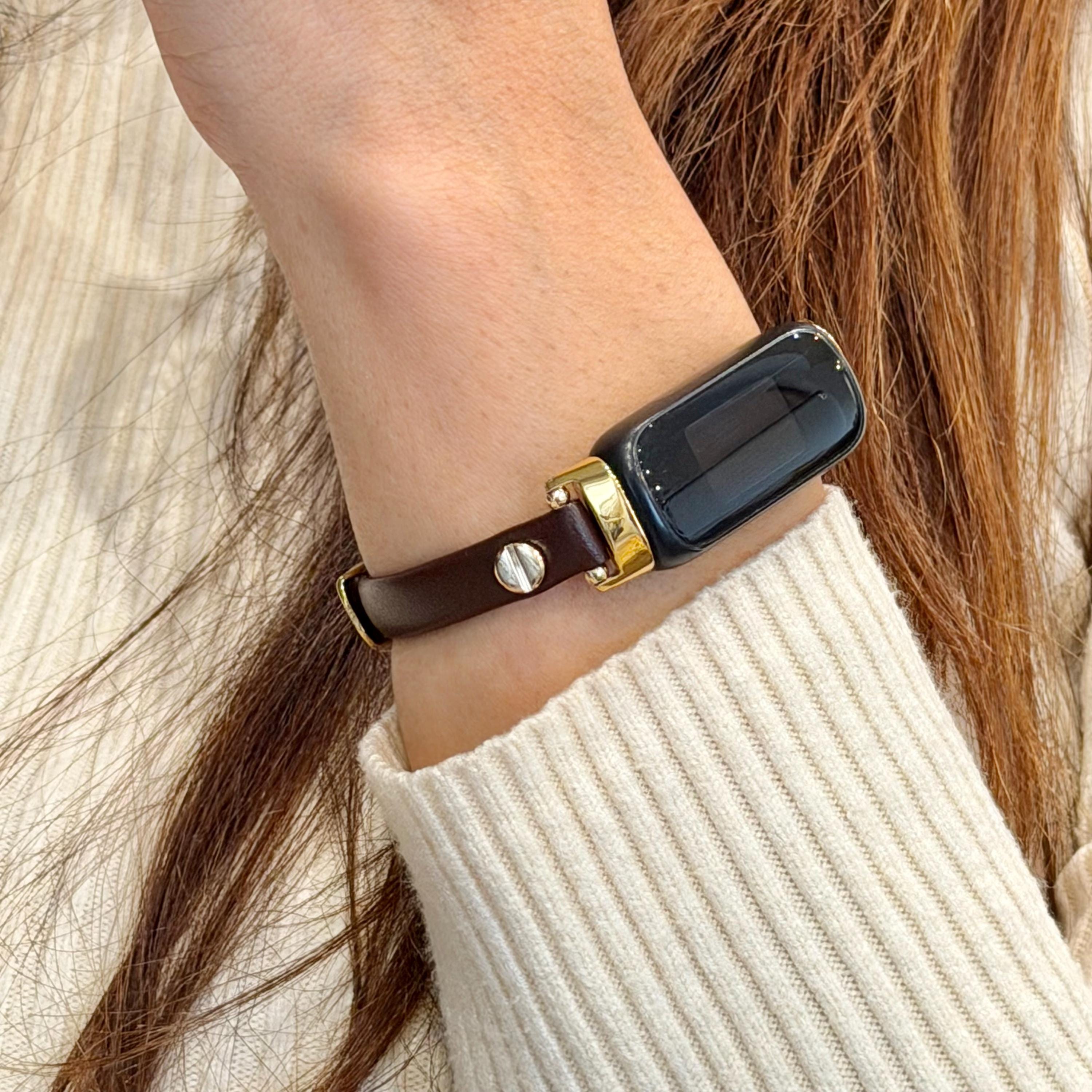 Italian Leather Fitbit Inspire 3 Band: Slim Dark Brown Strap, Gold Accents Women's Bracelet