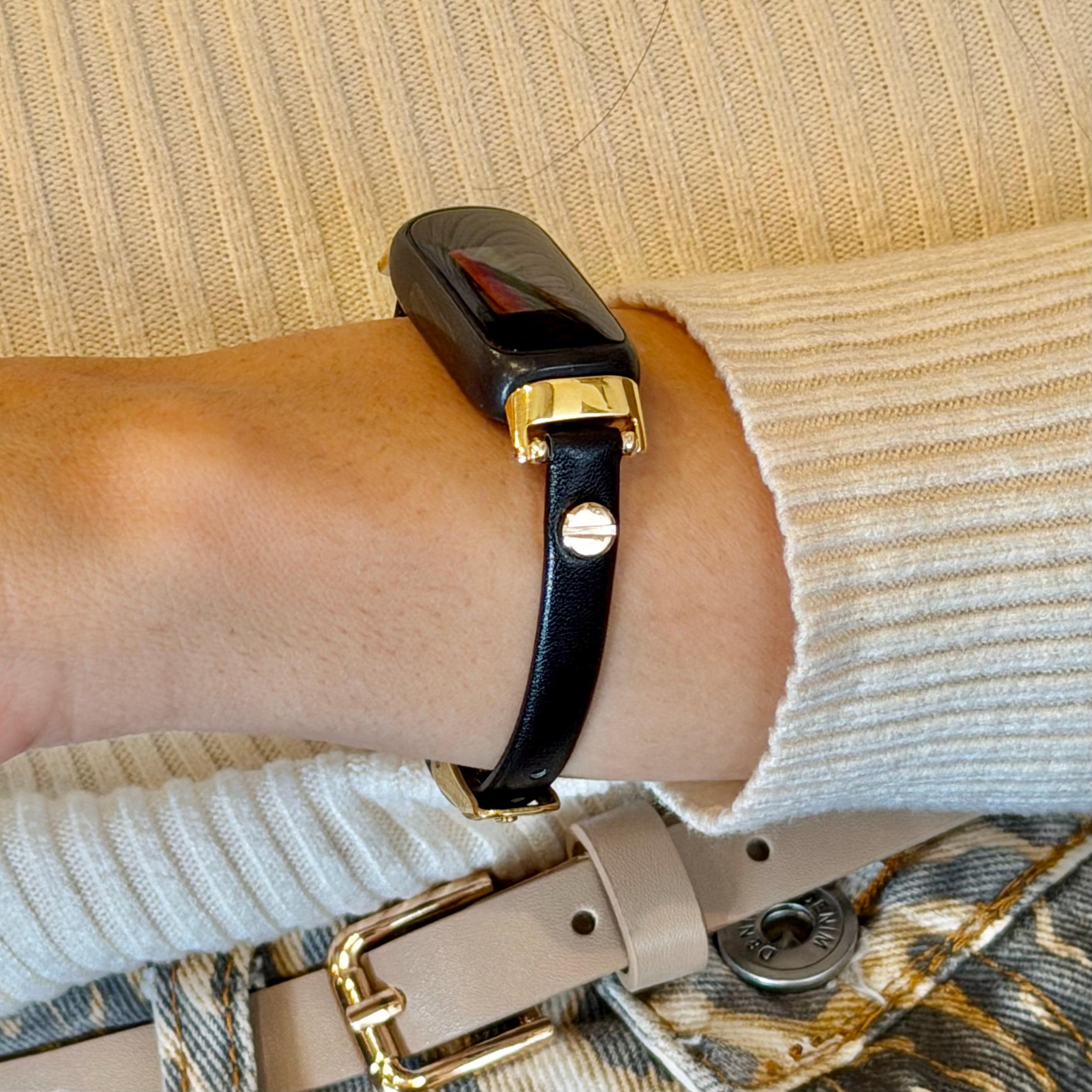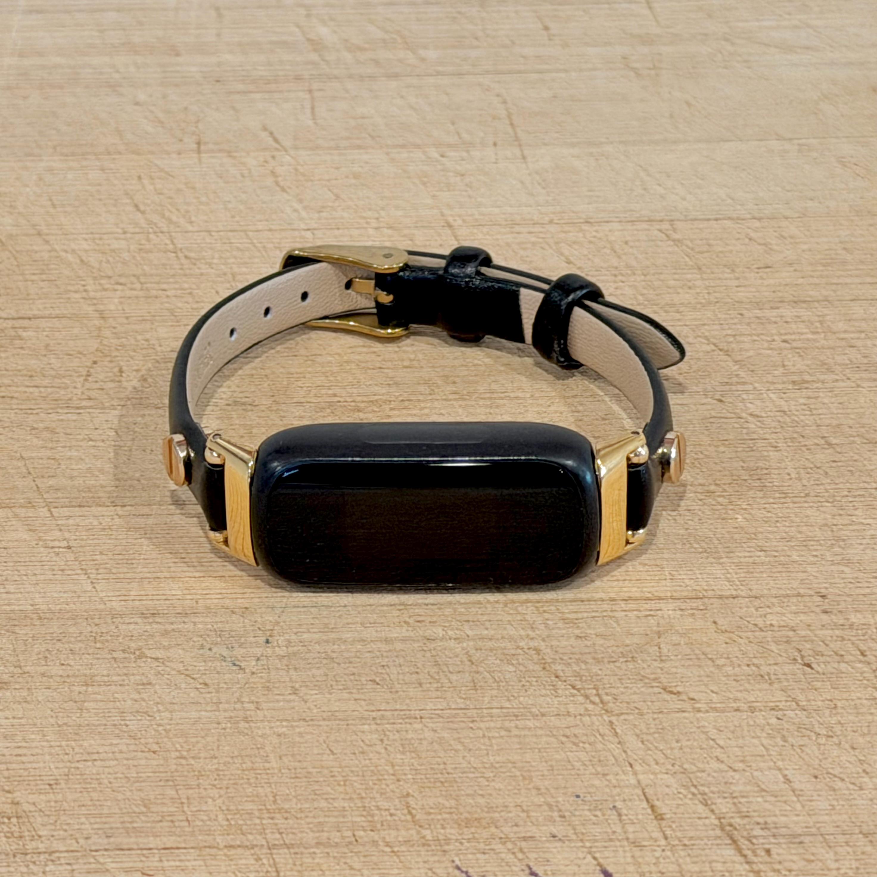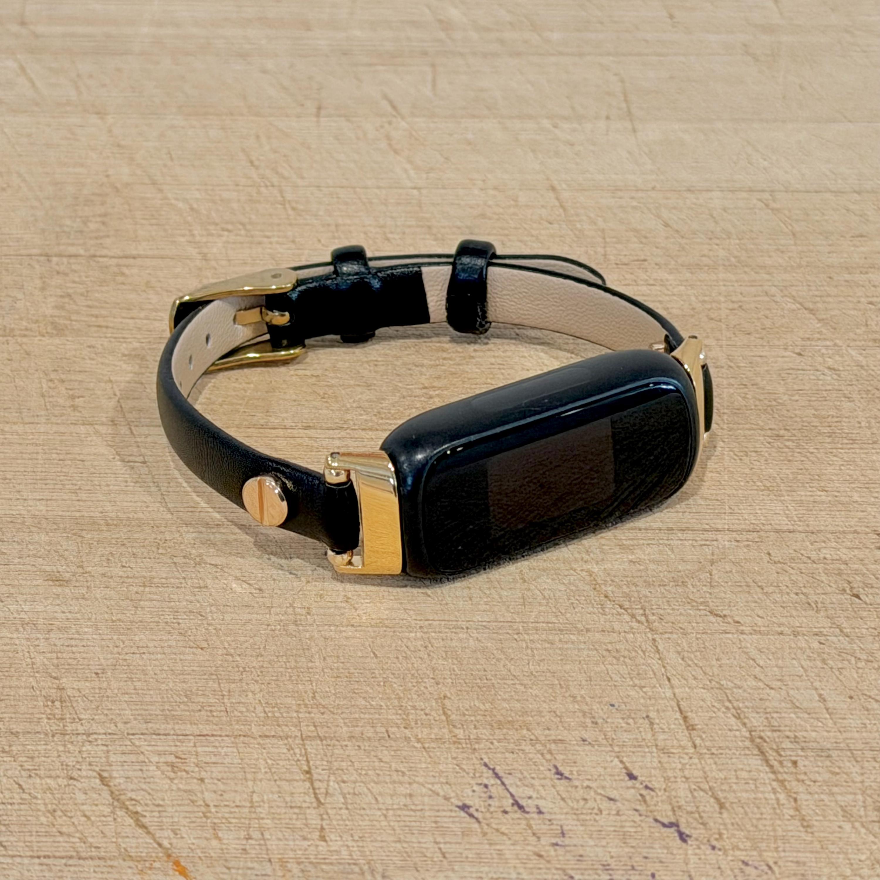 Black Leather Fitbit Inspire 3 Bracelet: Slim Gold Accent Band, Women's Strap Jewelry