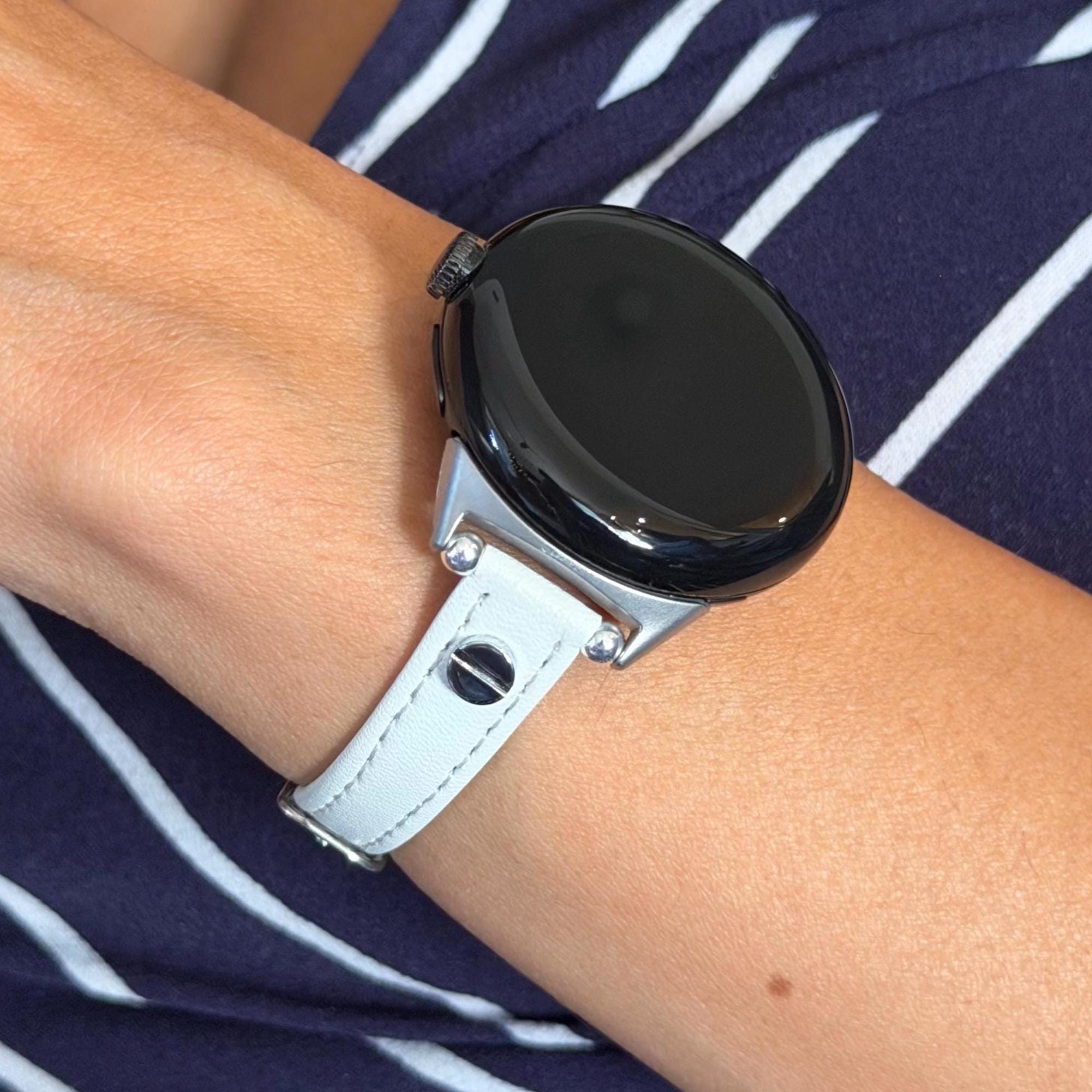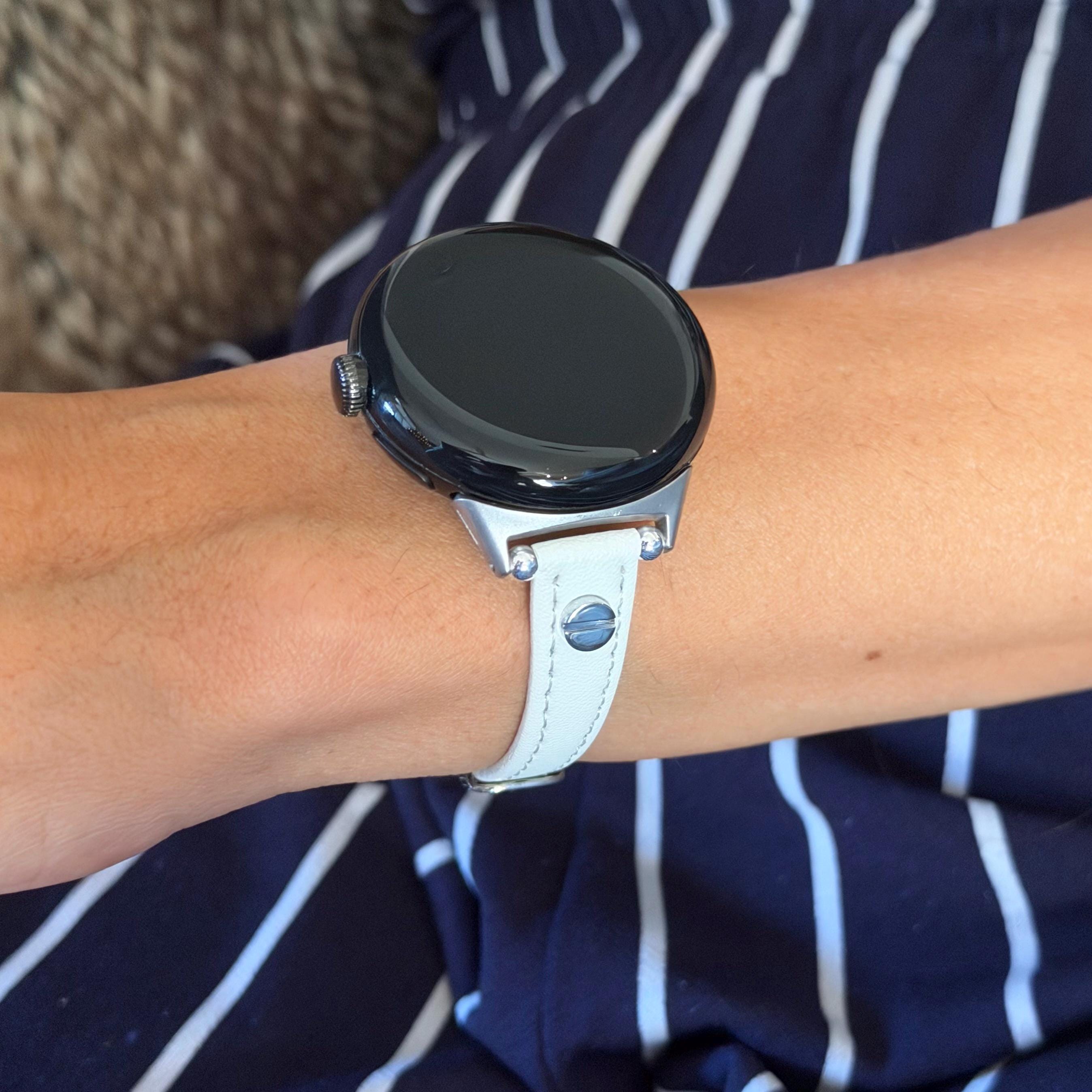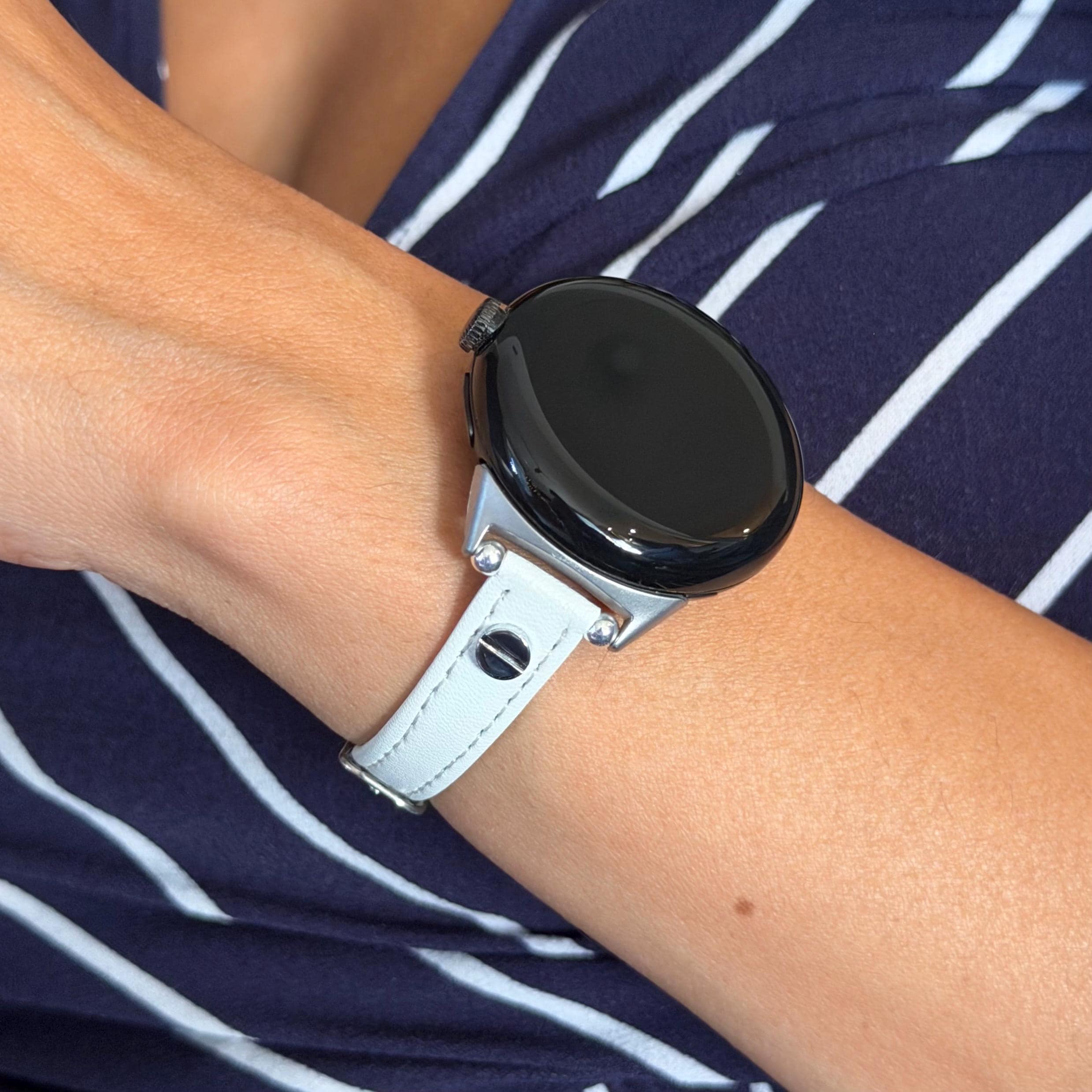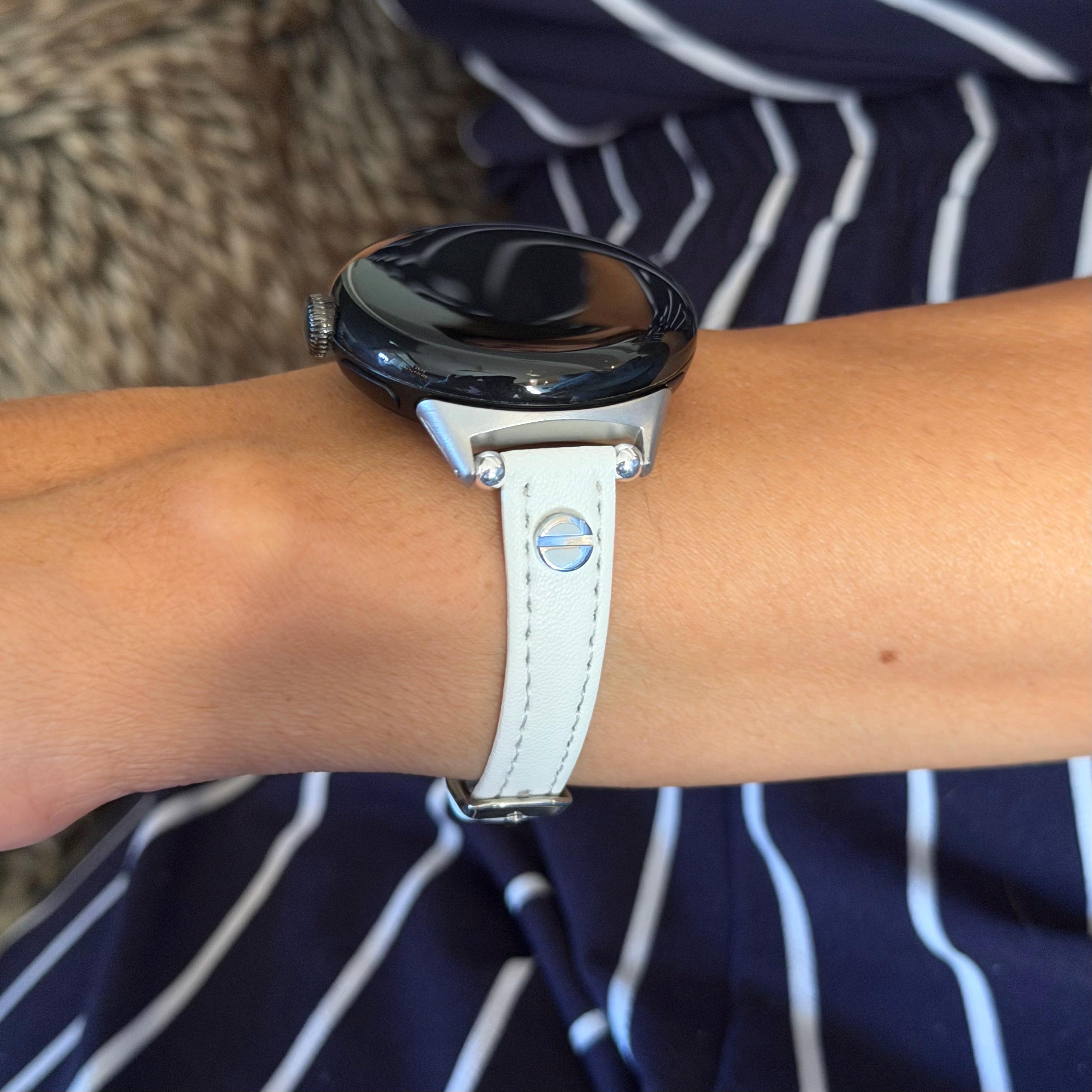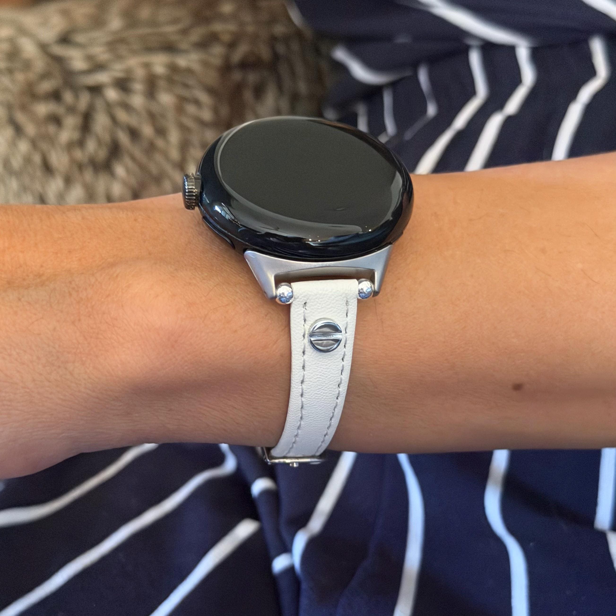 White Leather Google Pixel Watch Band Silver Accent Slim Strap Bracelet