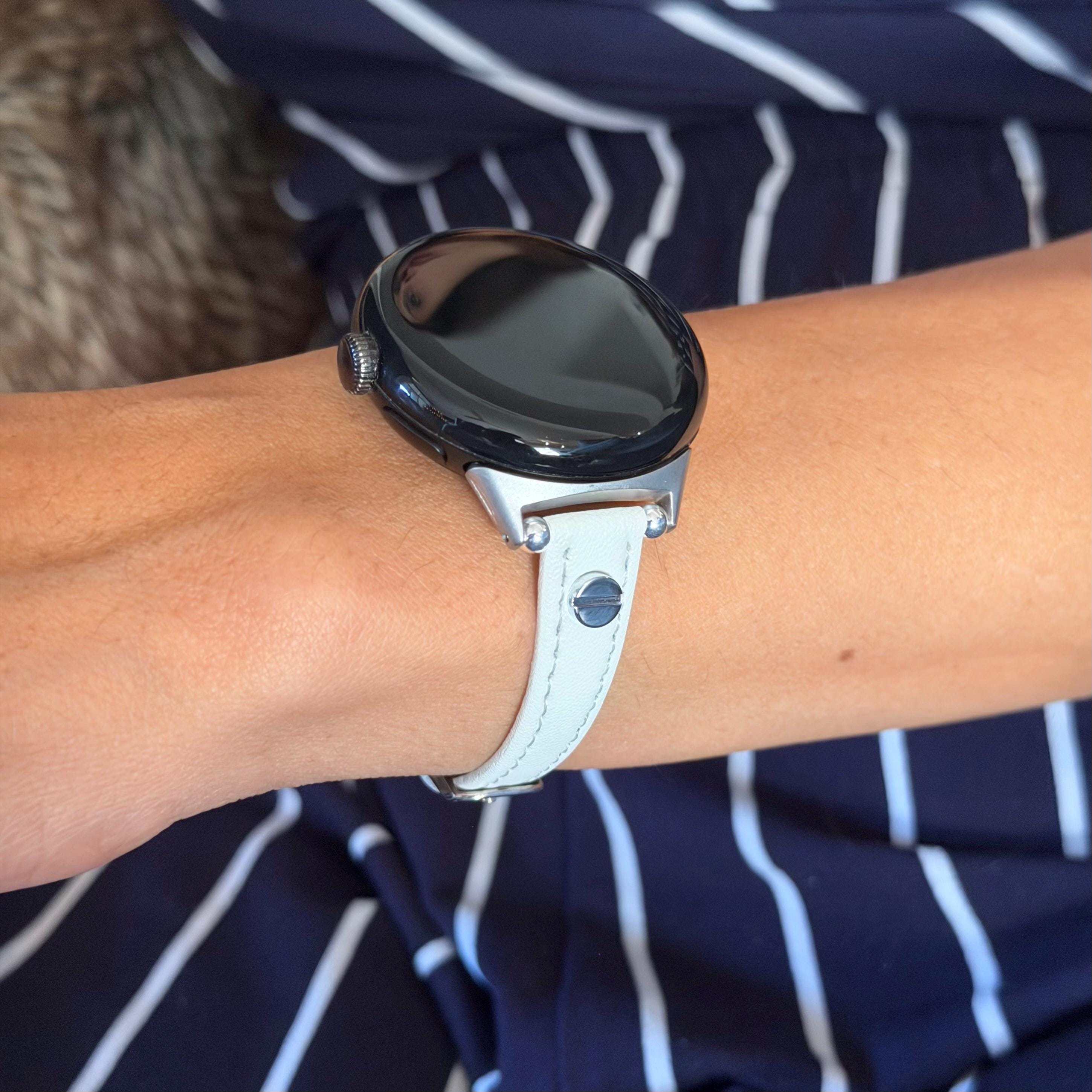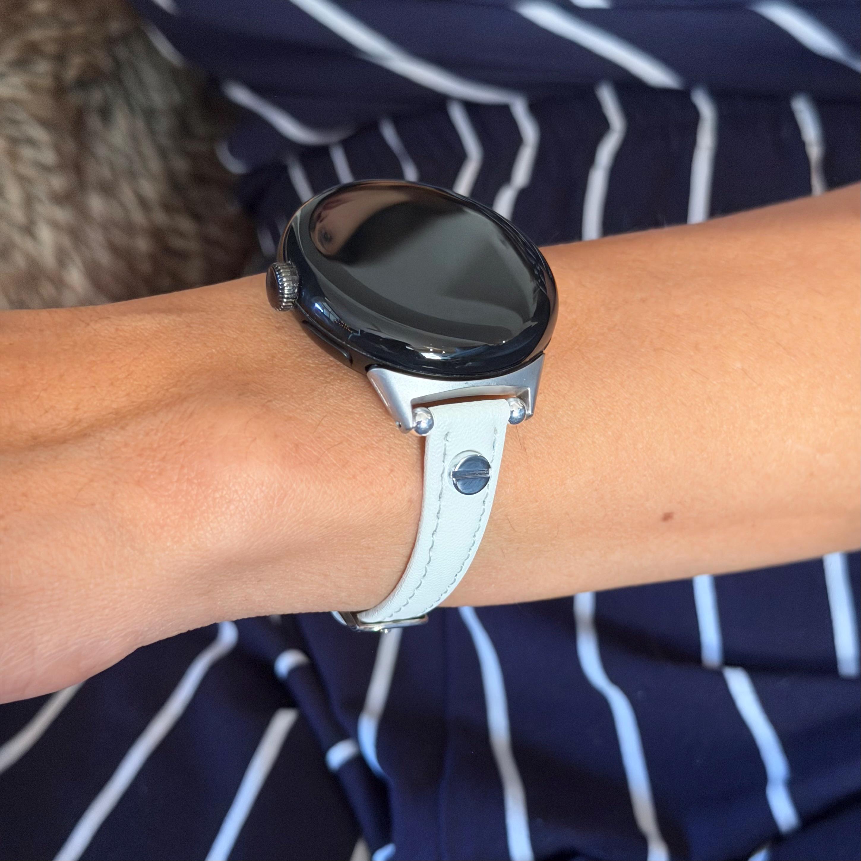 White Leather Google Pixel Watch Band Silver Slim Strap Bracelet