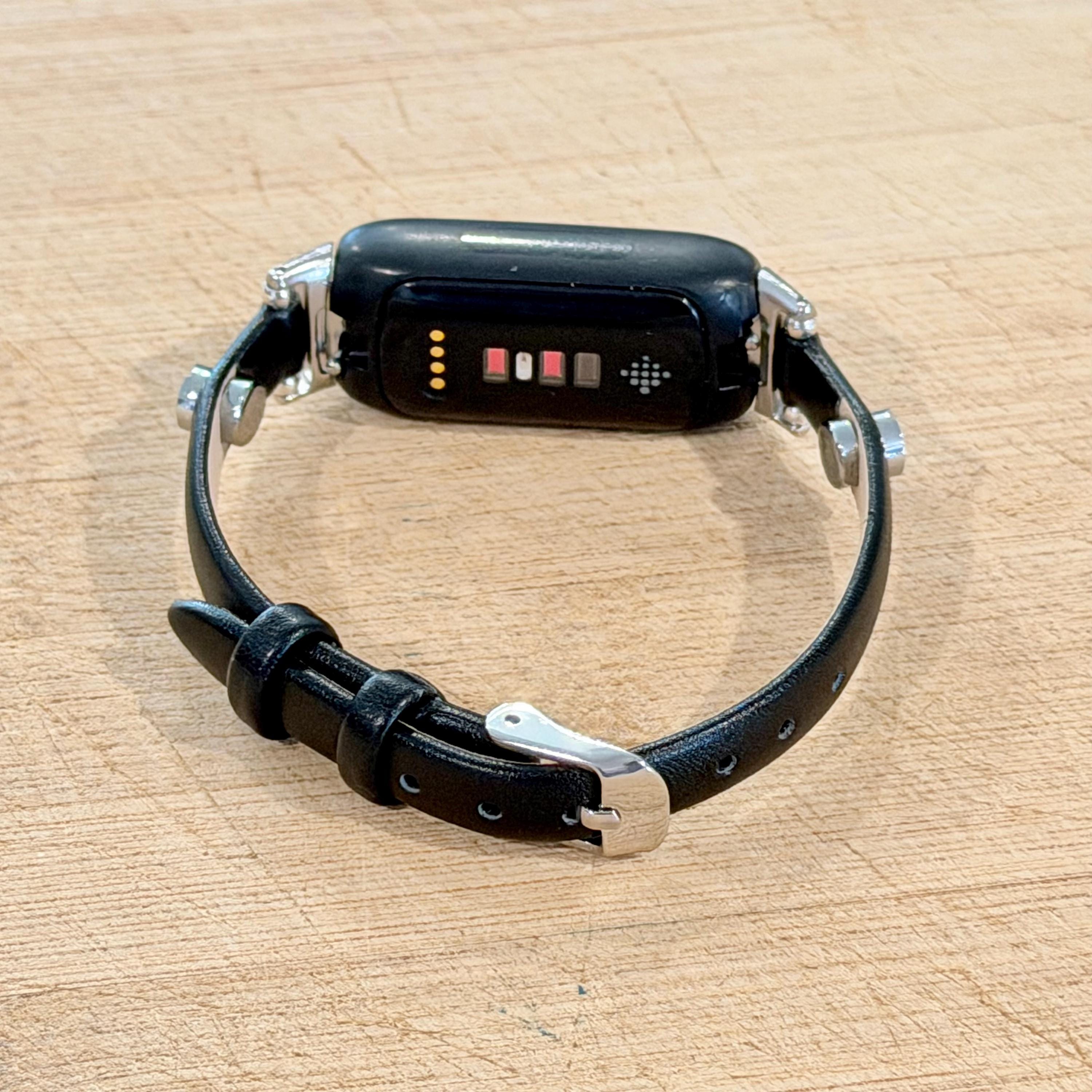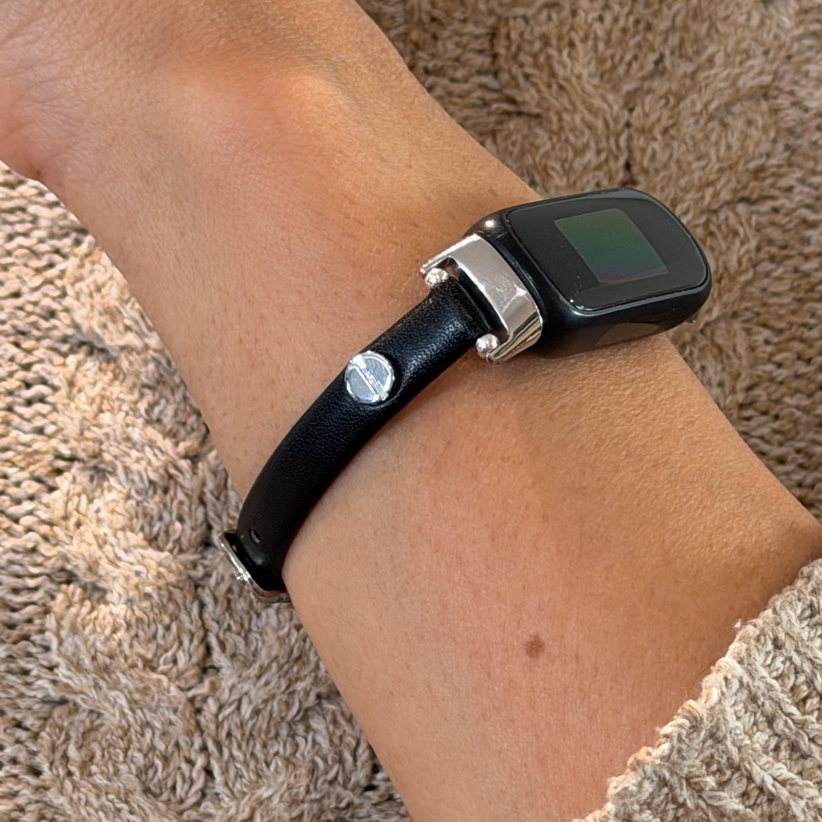 Black Leather Fitbit Luxe Band, Slim Silver Accents Bracelet!