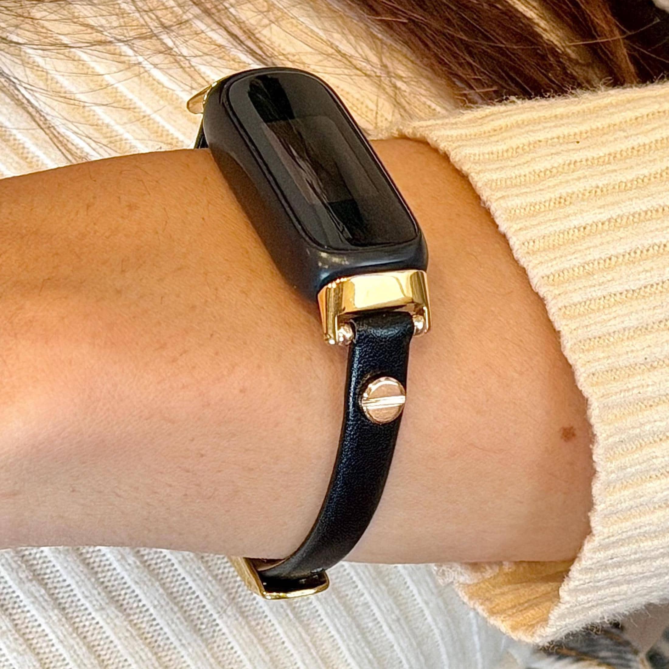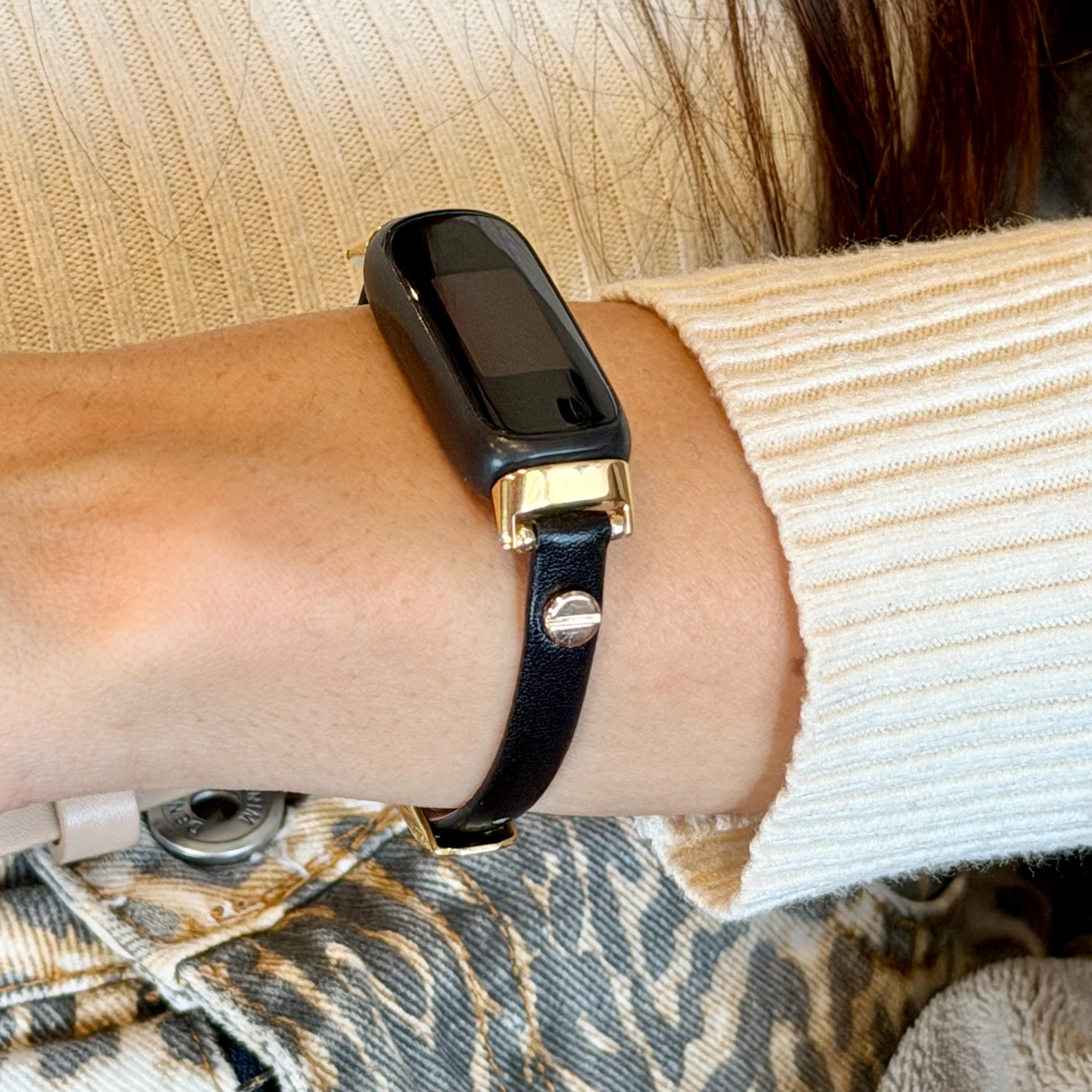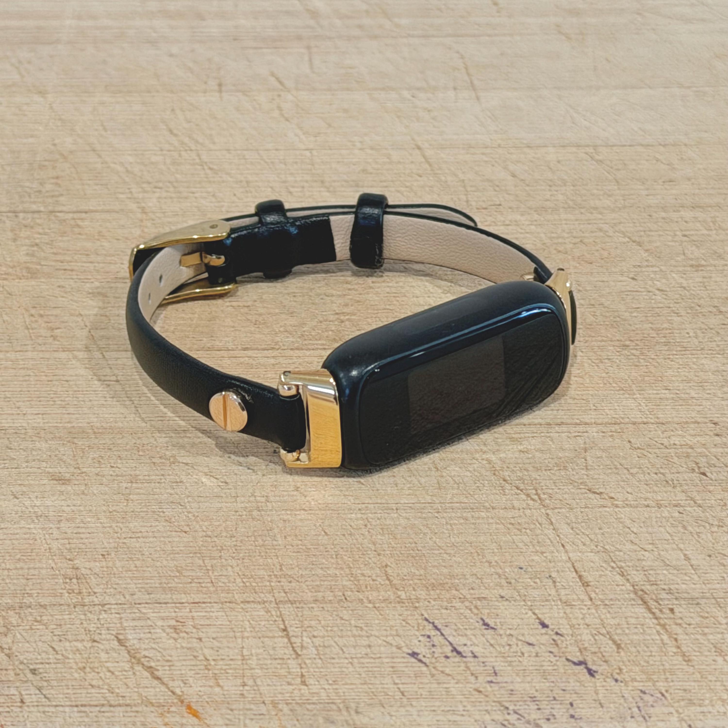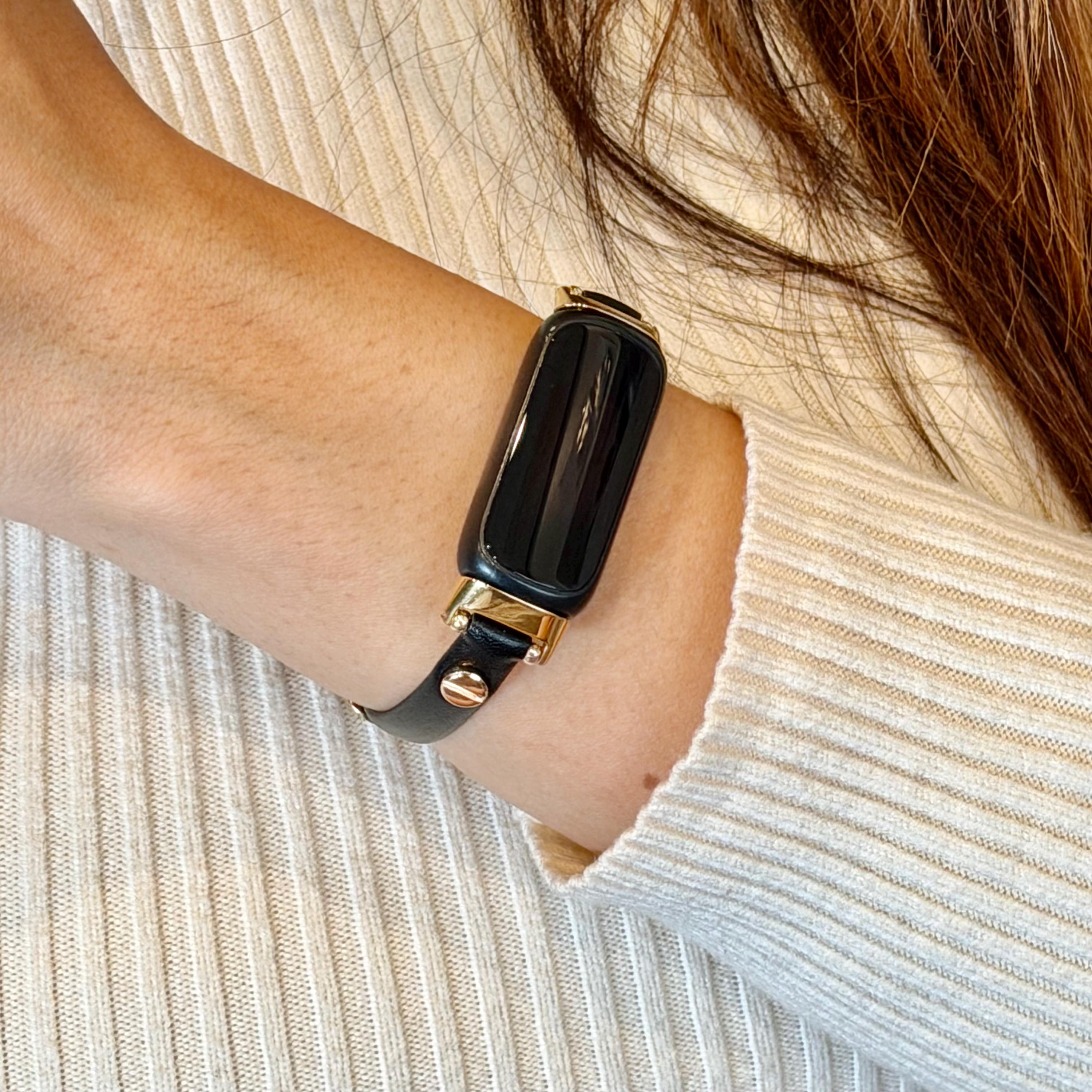 Slim Fitbit Luxe Band Black Leather Gold Accents Bracelet, Classy Women Strap