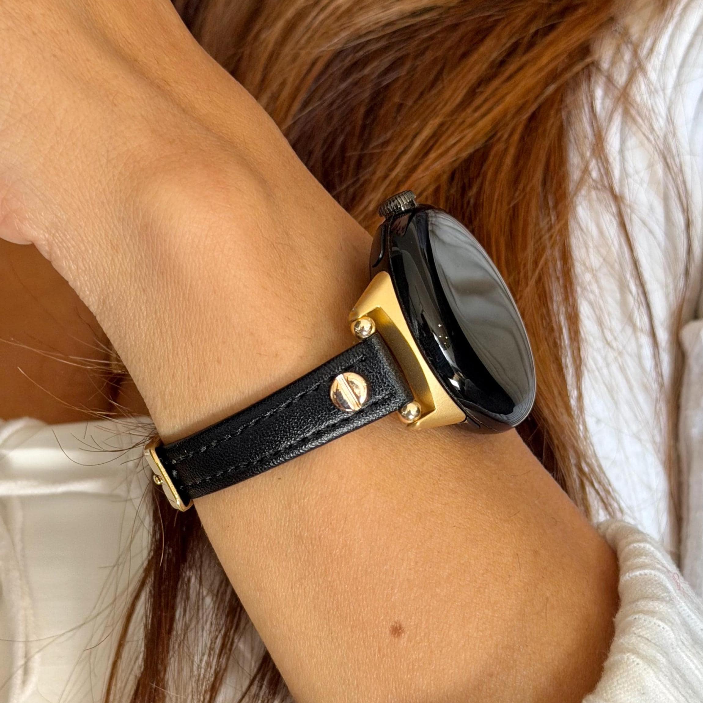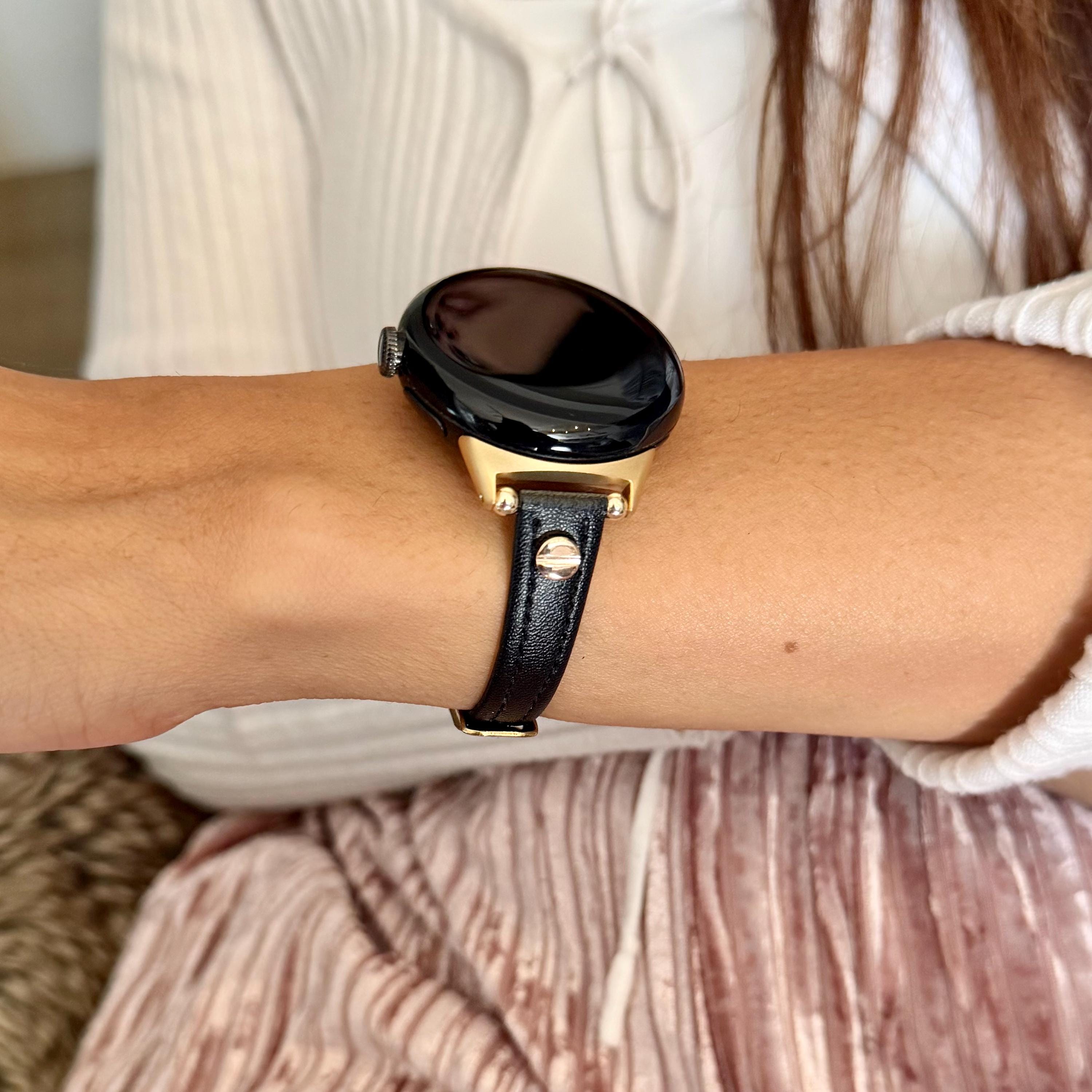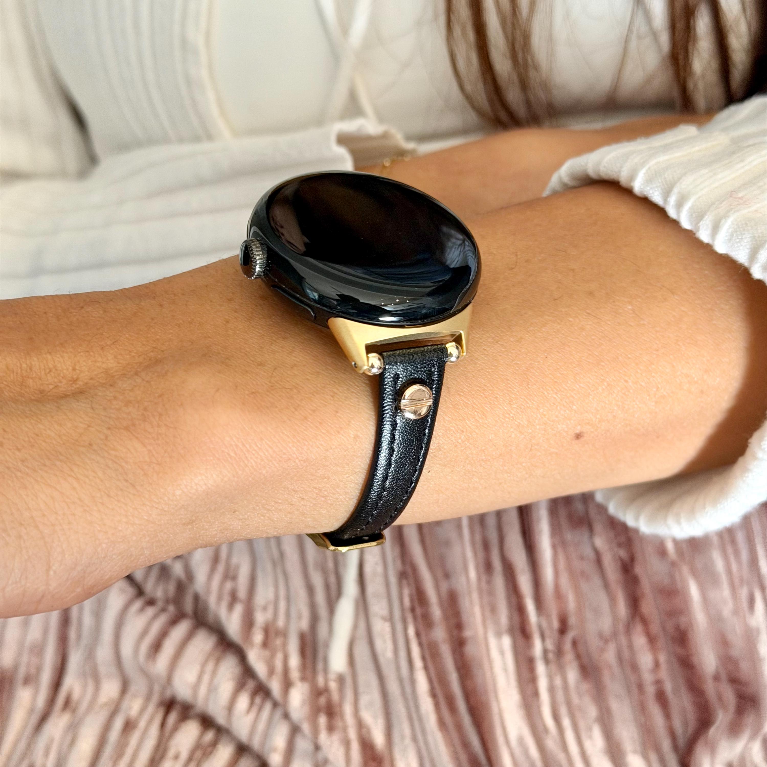 Black Leather Google Pixel Watch 2 Band: Slim Minimalist Strap, Gold Accents Bracelet