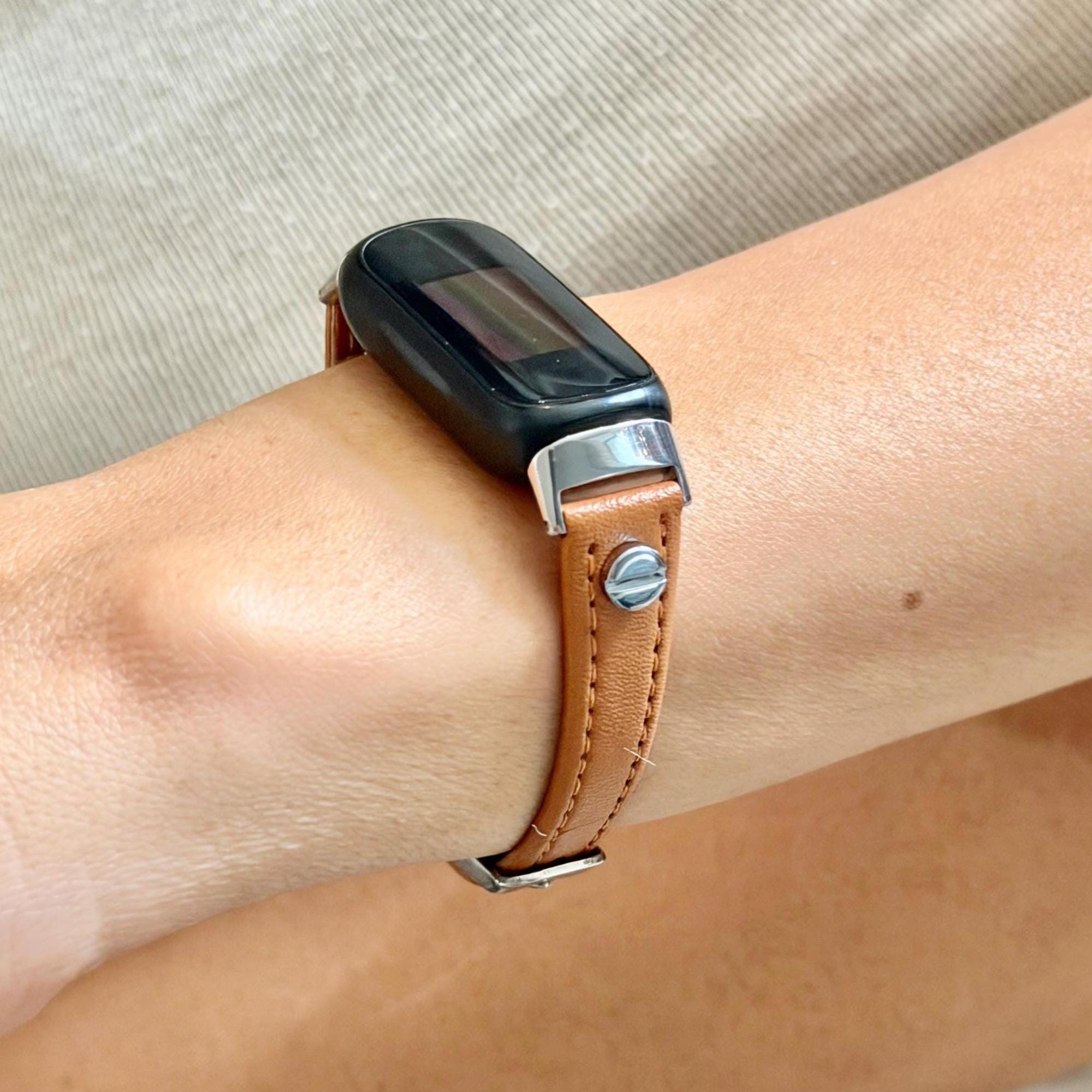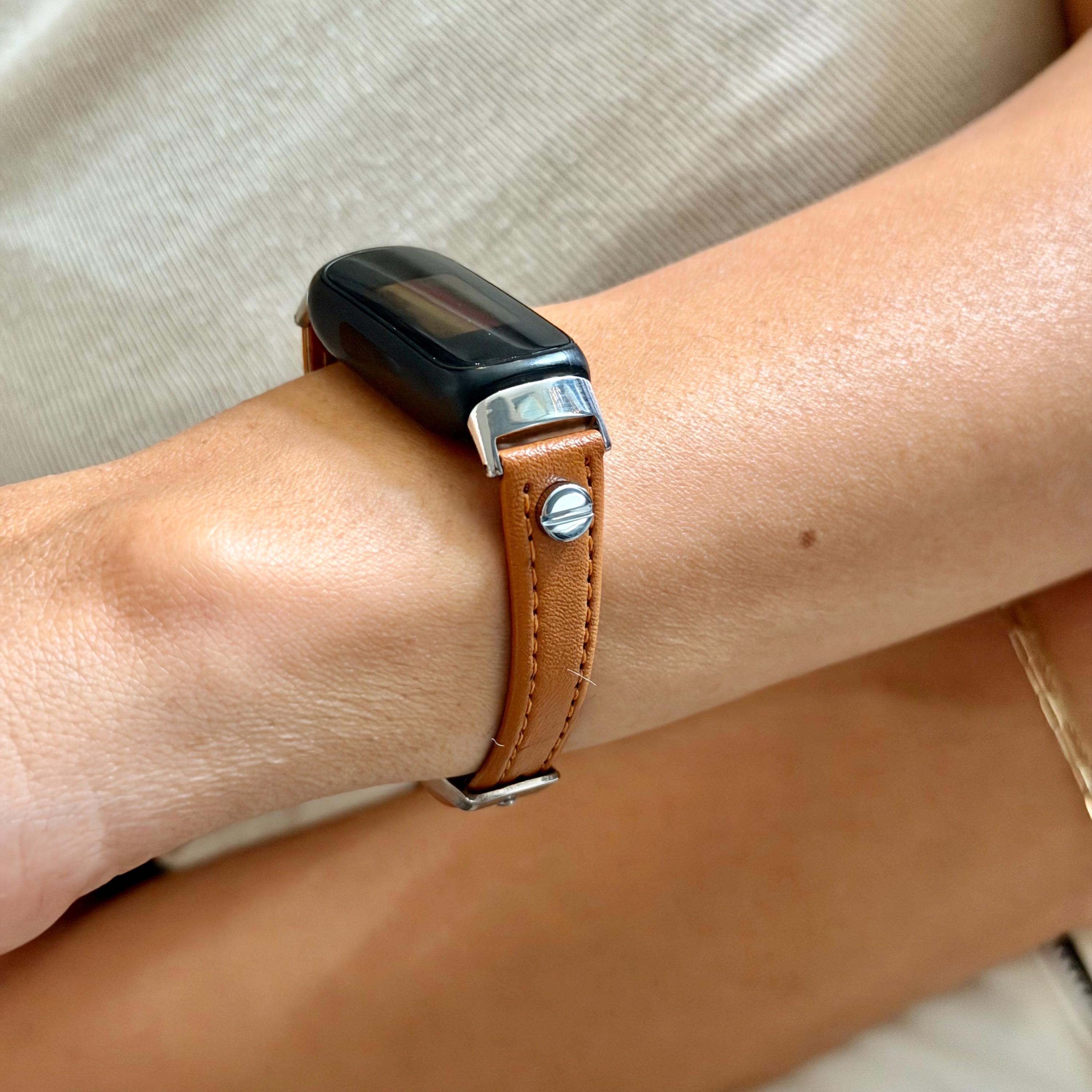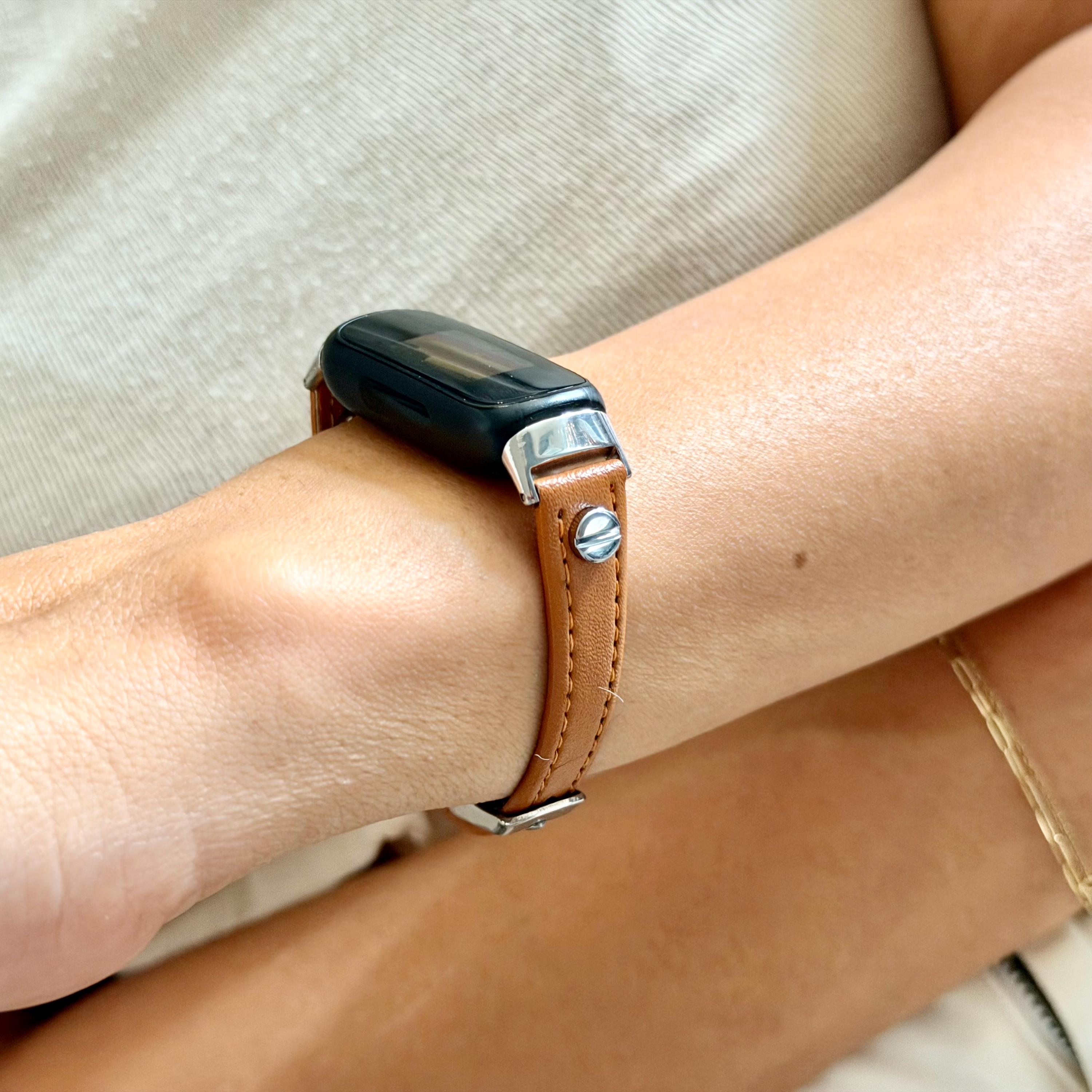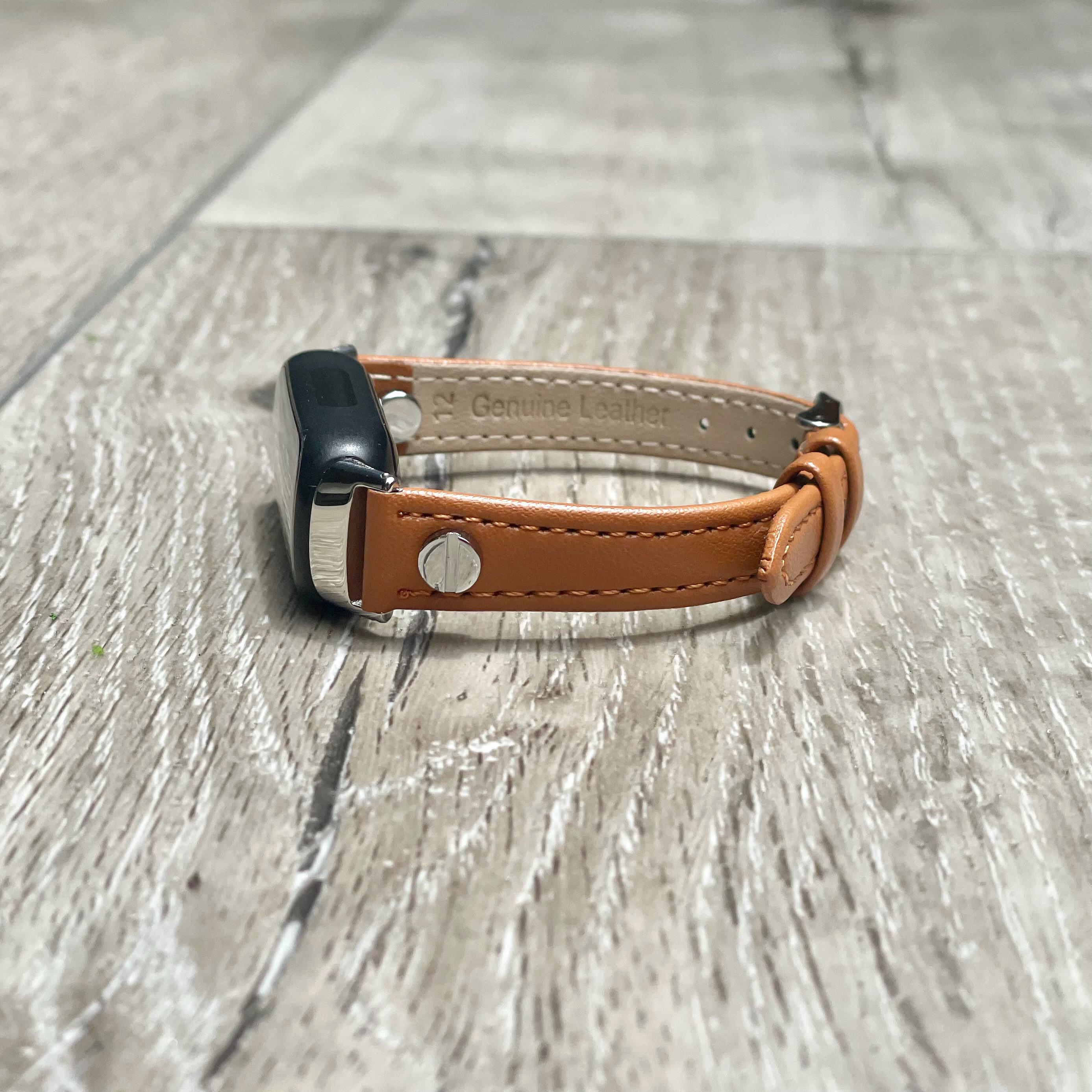 Light Brown Fitbit Luxe Band Slim Leather Strap Silver Adjustable Accessory.