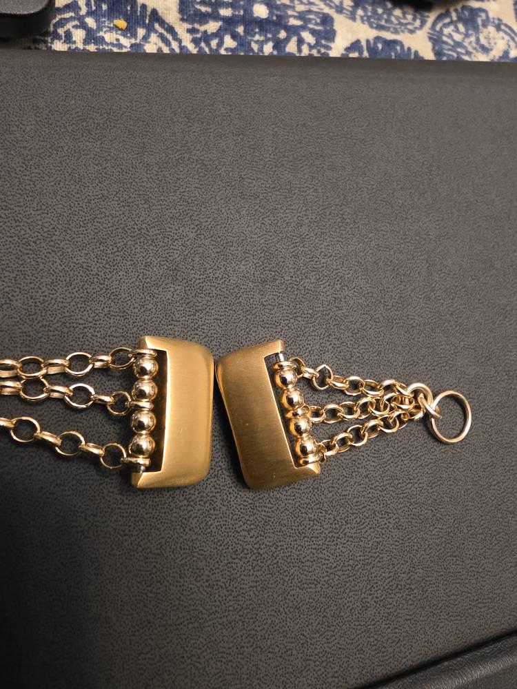 The band has 2 different color golds. The connector is a dull gold and the chains are bright gold tone. It takes away the quality.