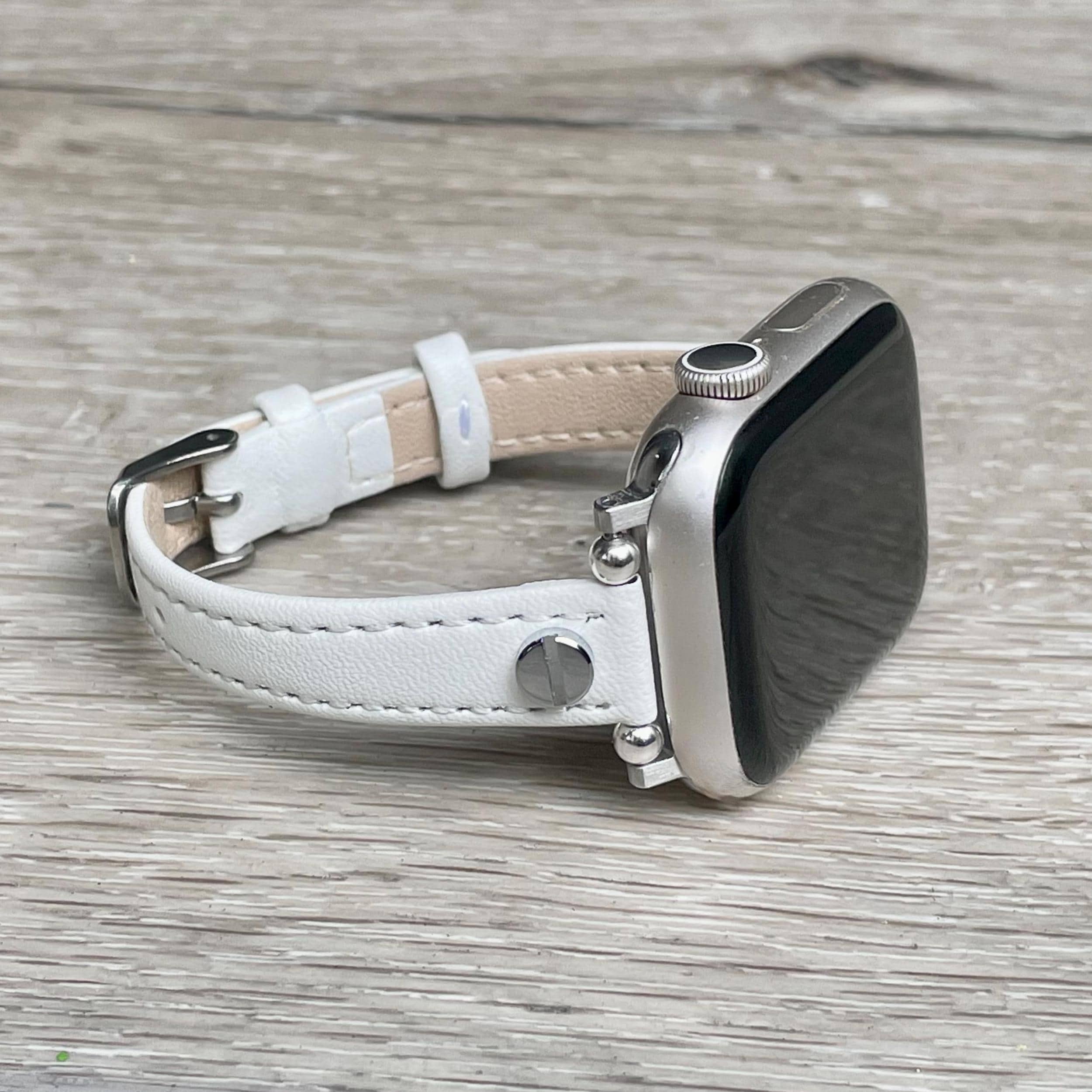 Slim white leather Apple Watch band for women with an elegant everyday bracelet look.