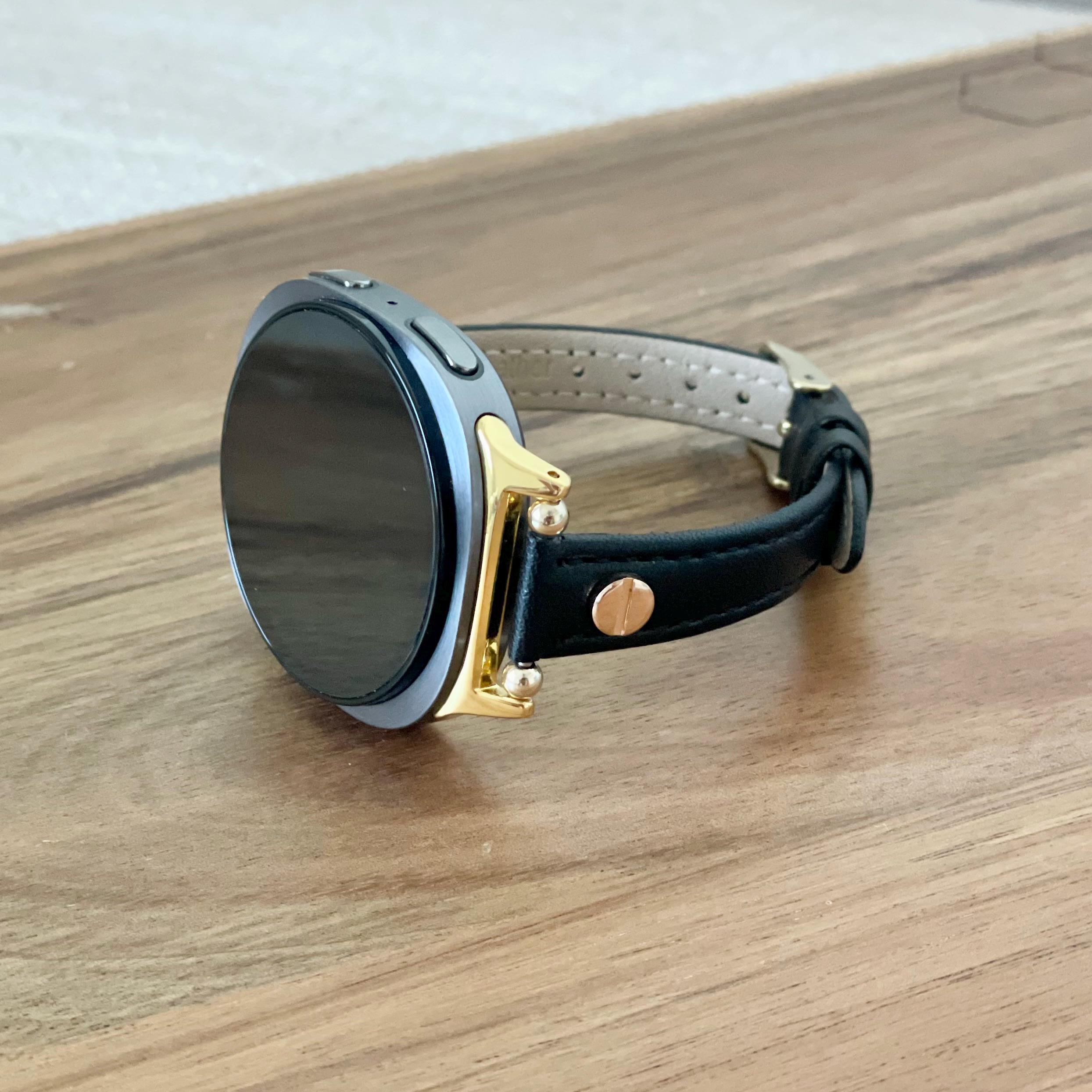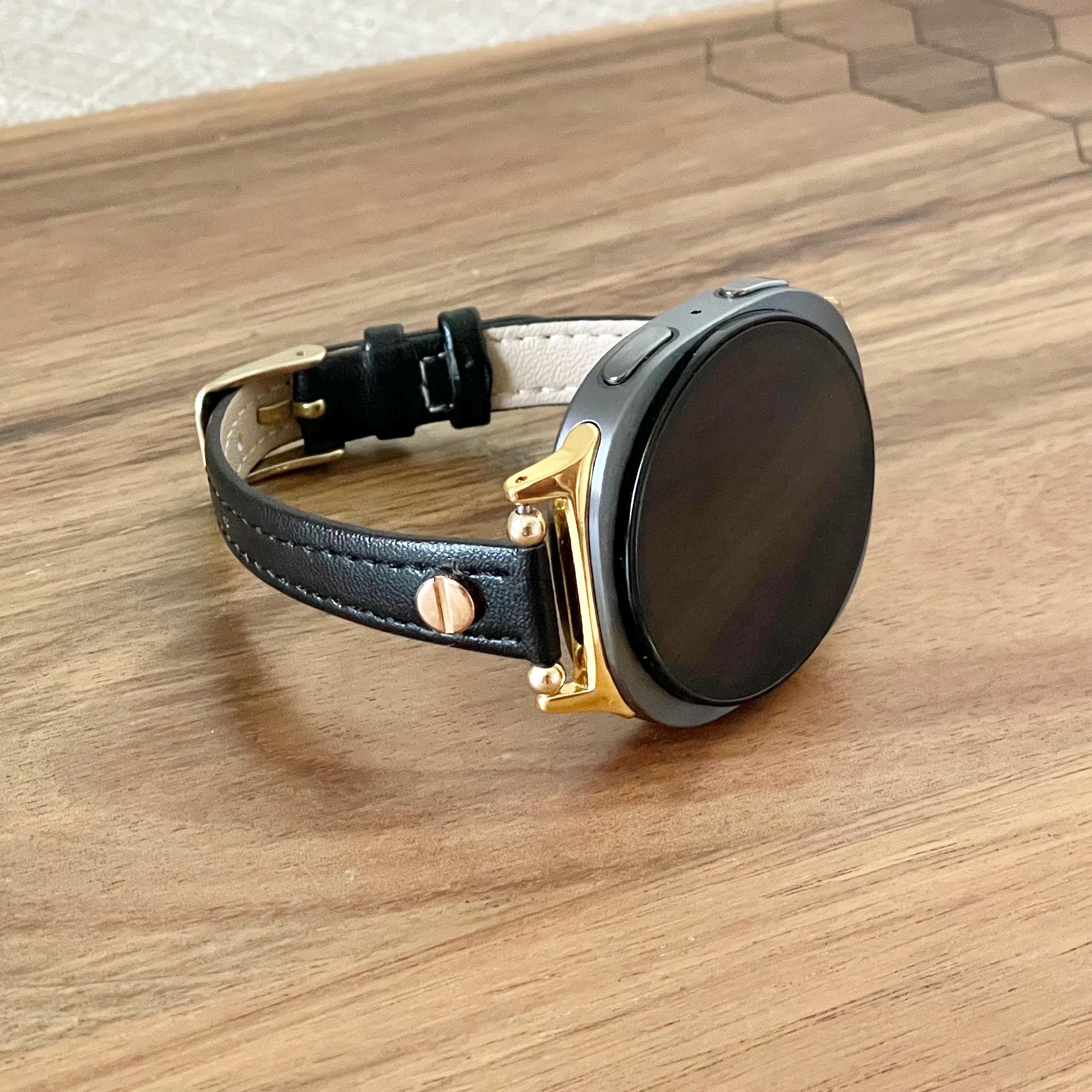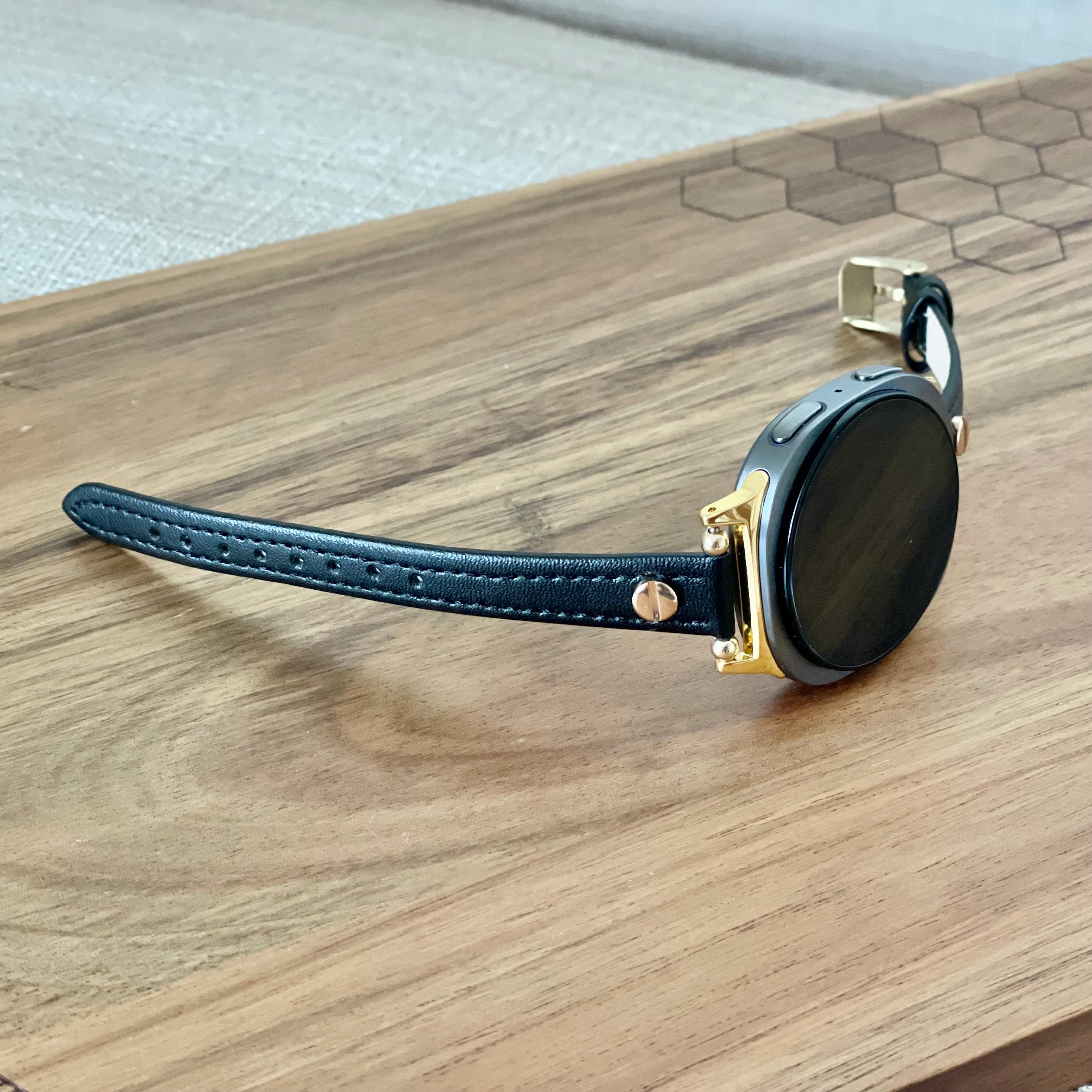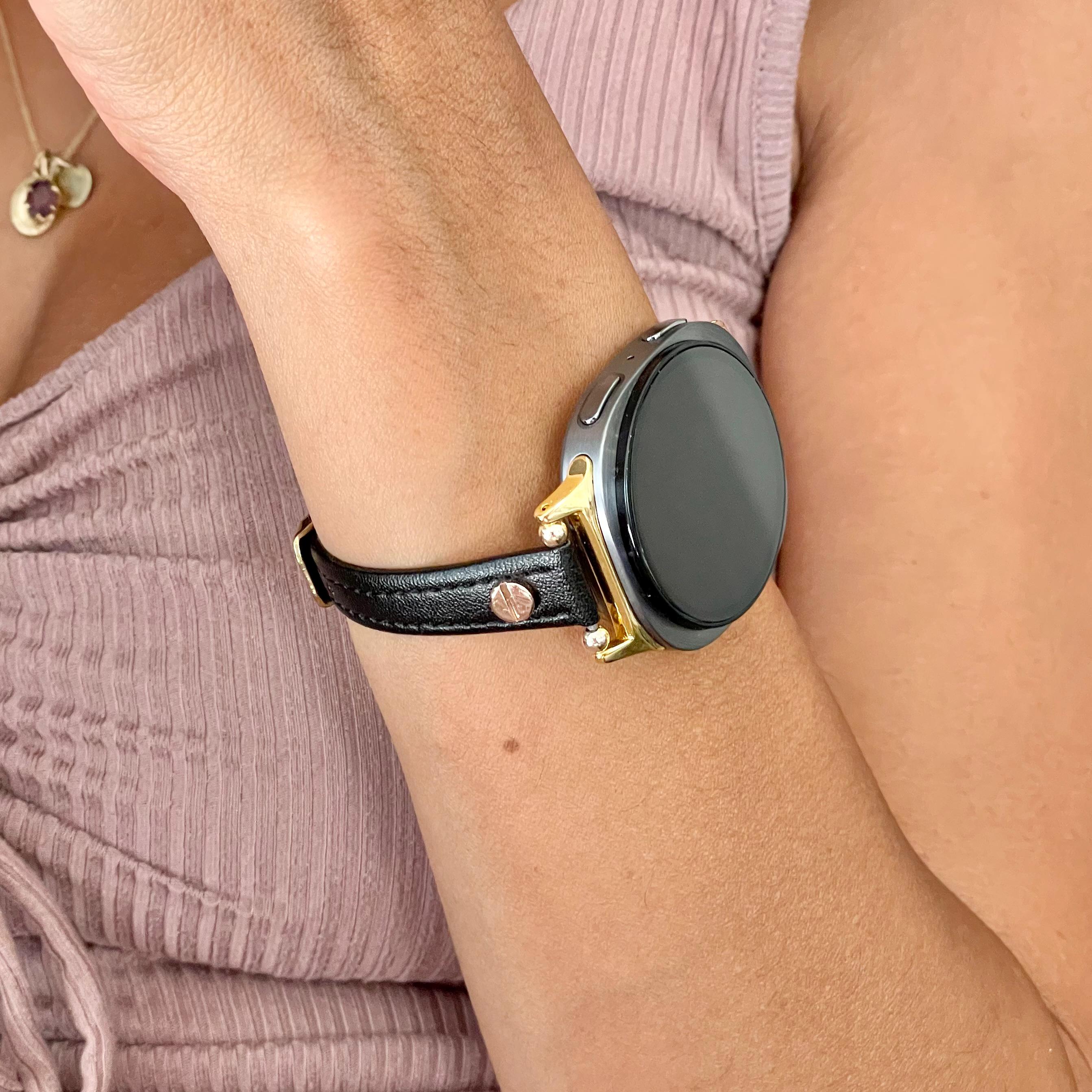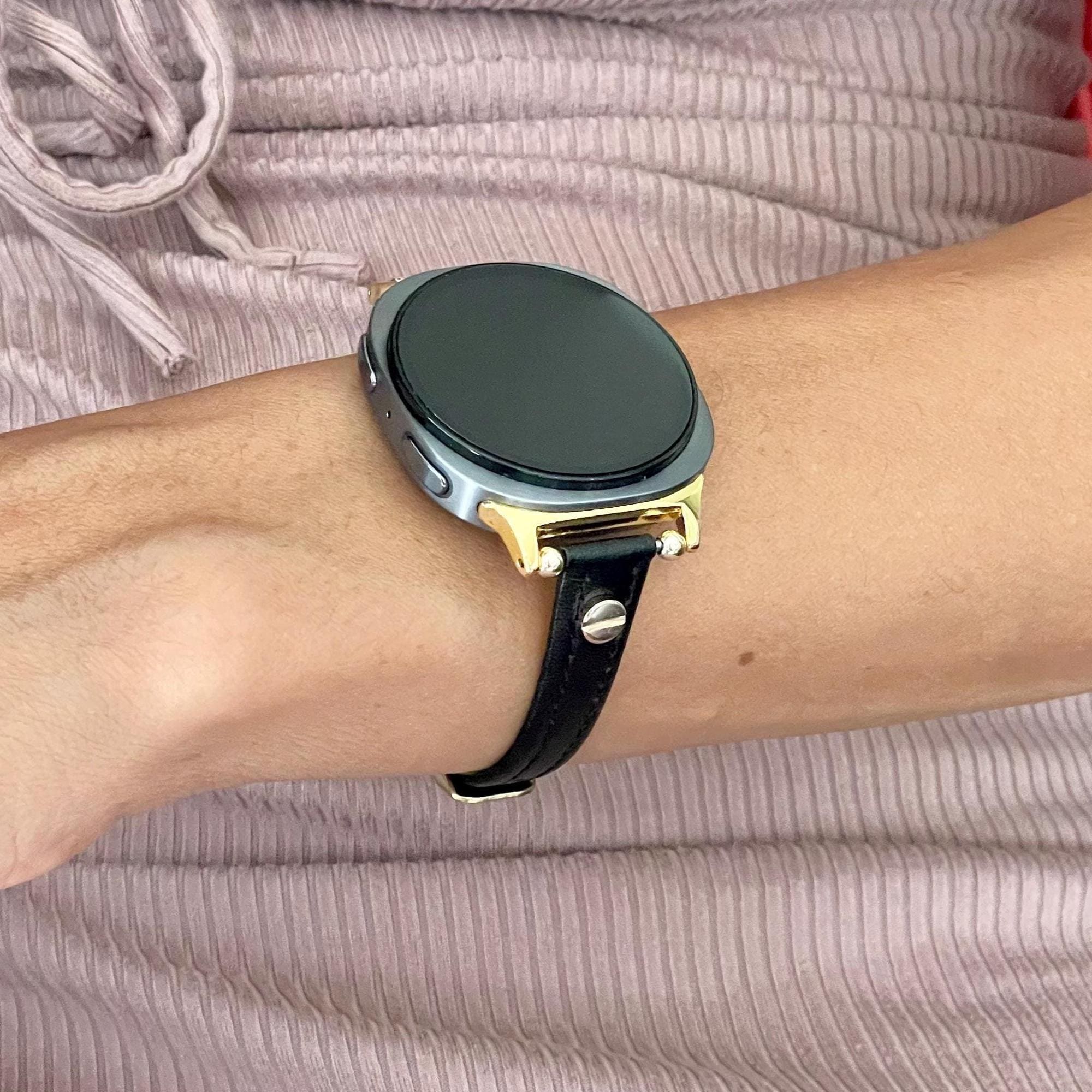 Black Leather Galaxy Watch 8 Band Slim Strap Bracelet, Gold Accents