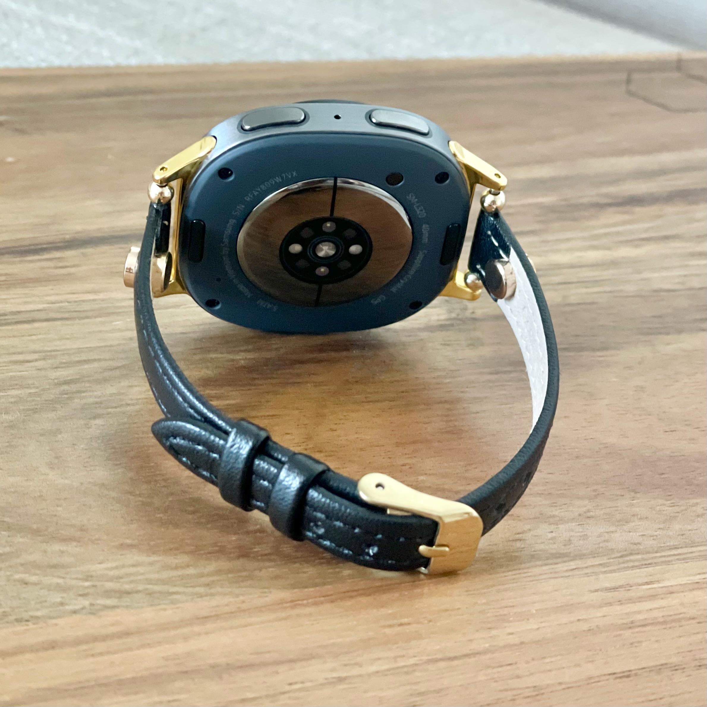 Black Leather Galaxy Watch 8 Band Slim Strap Bracelet, Gold Accents.
