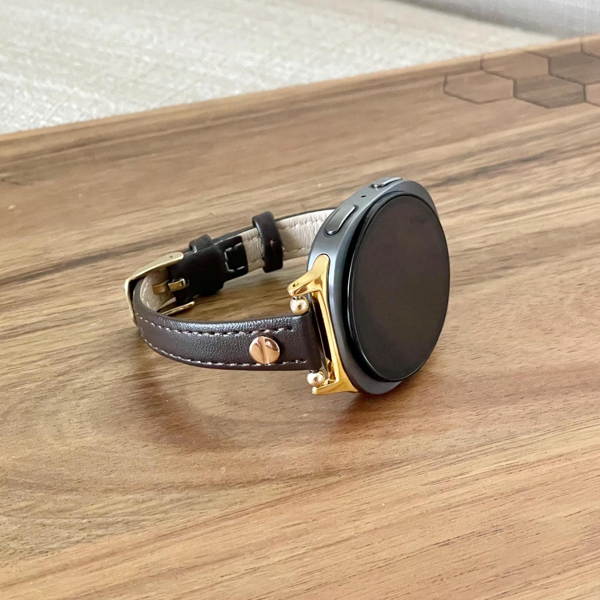 This slim leather band for Galaxy Watch 8 is an adjustable bracelet-style strap with your choice of silver or gold accents, compatible with Galaxy Watch 8 Classic and wrists about 5.5"–7.5".