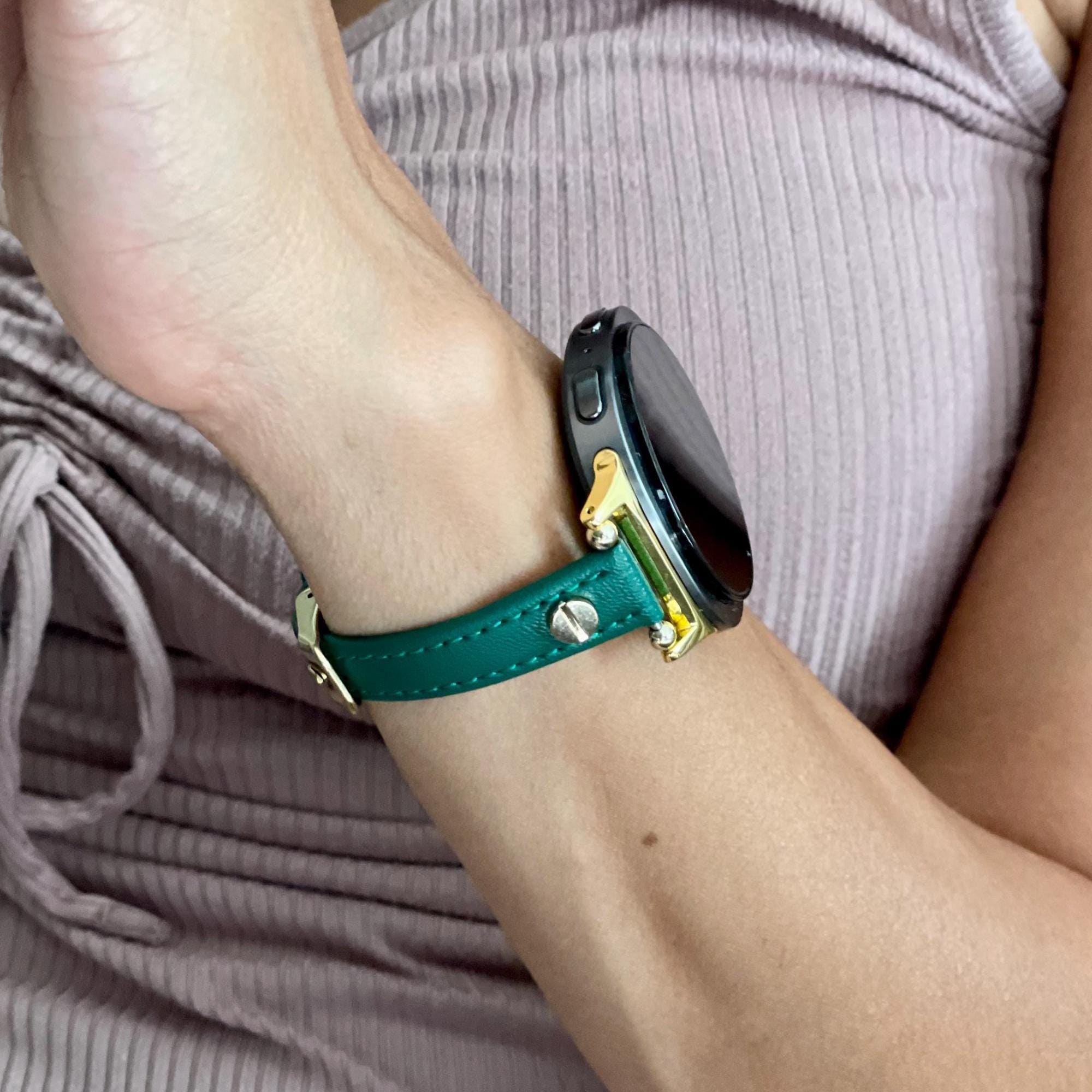 This emerald green leather band fits the Galaxy Watch 8 and Galaxy Watch 8 Classic and features a slim, adjustable bracelet-style strap with your choice of silver or gold accents.