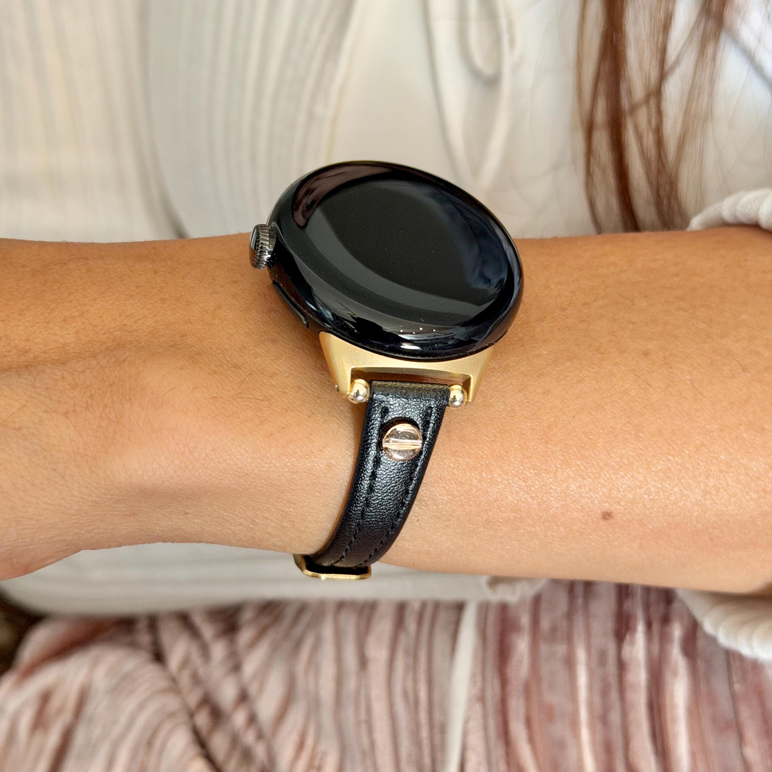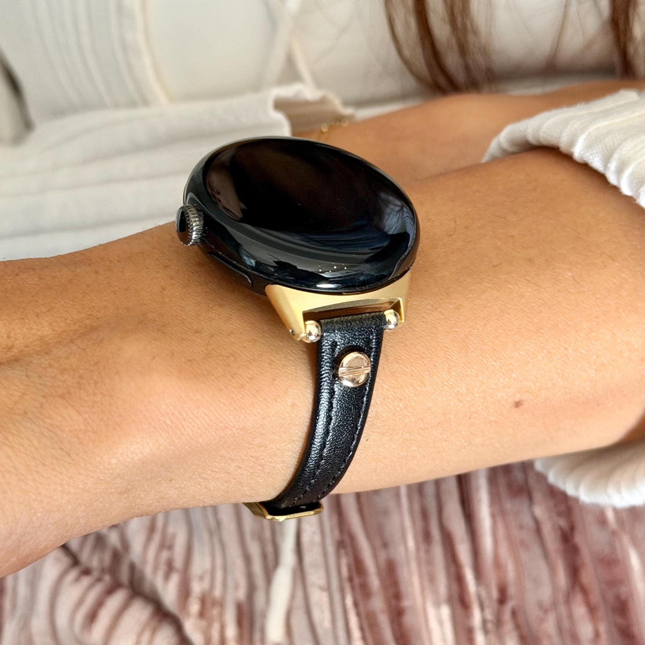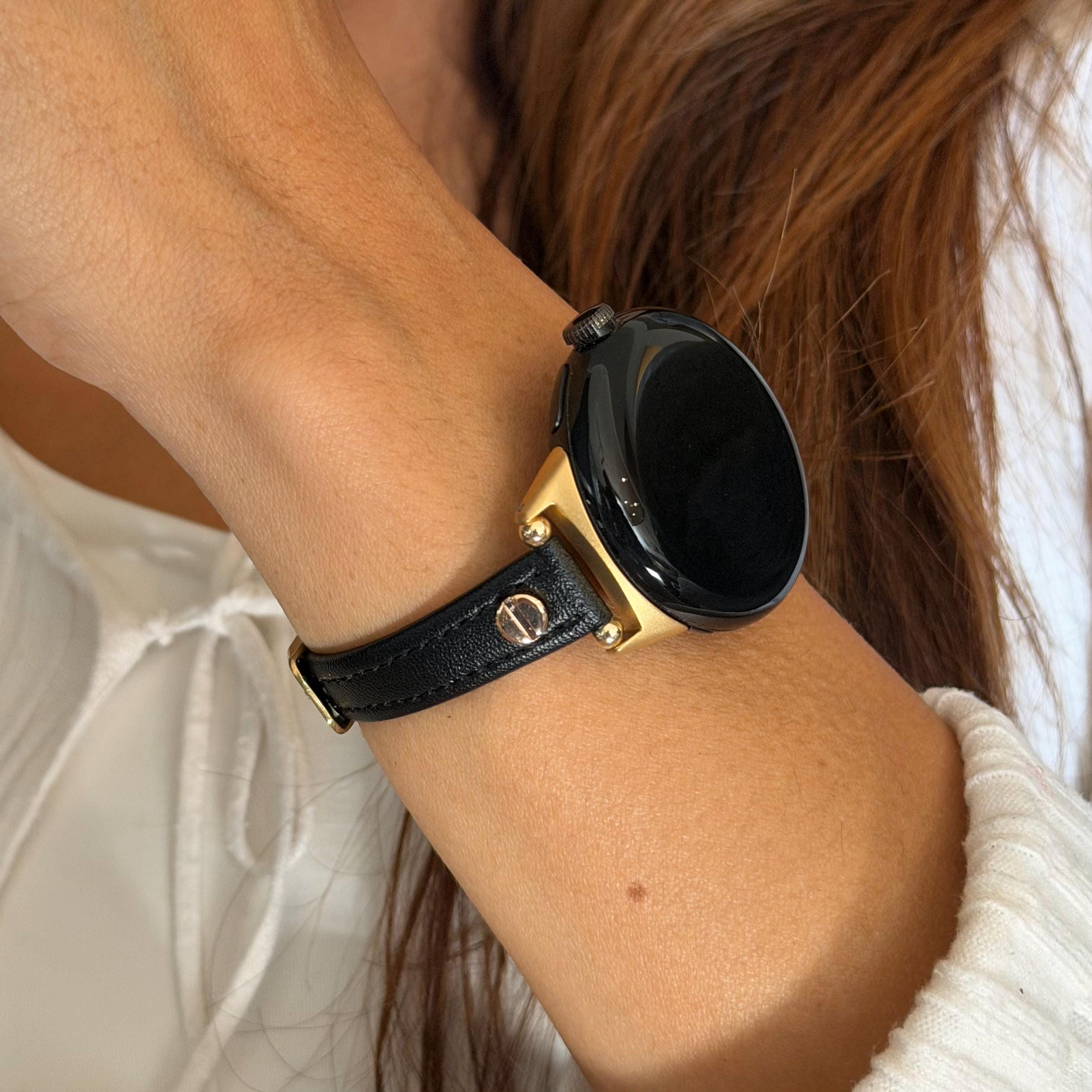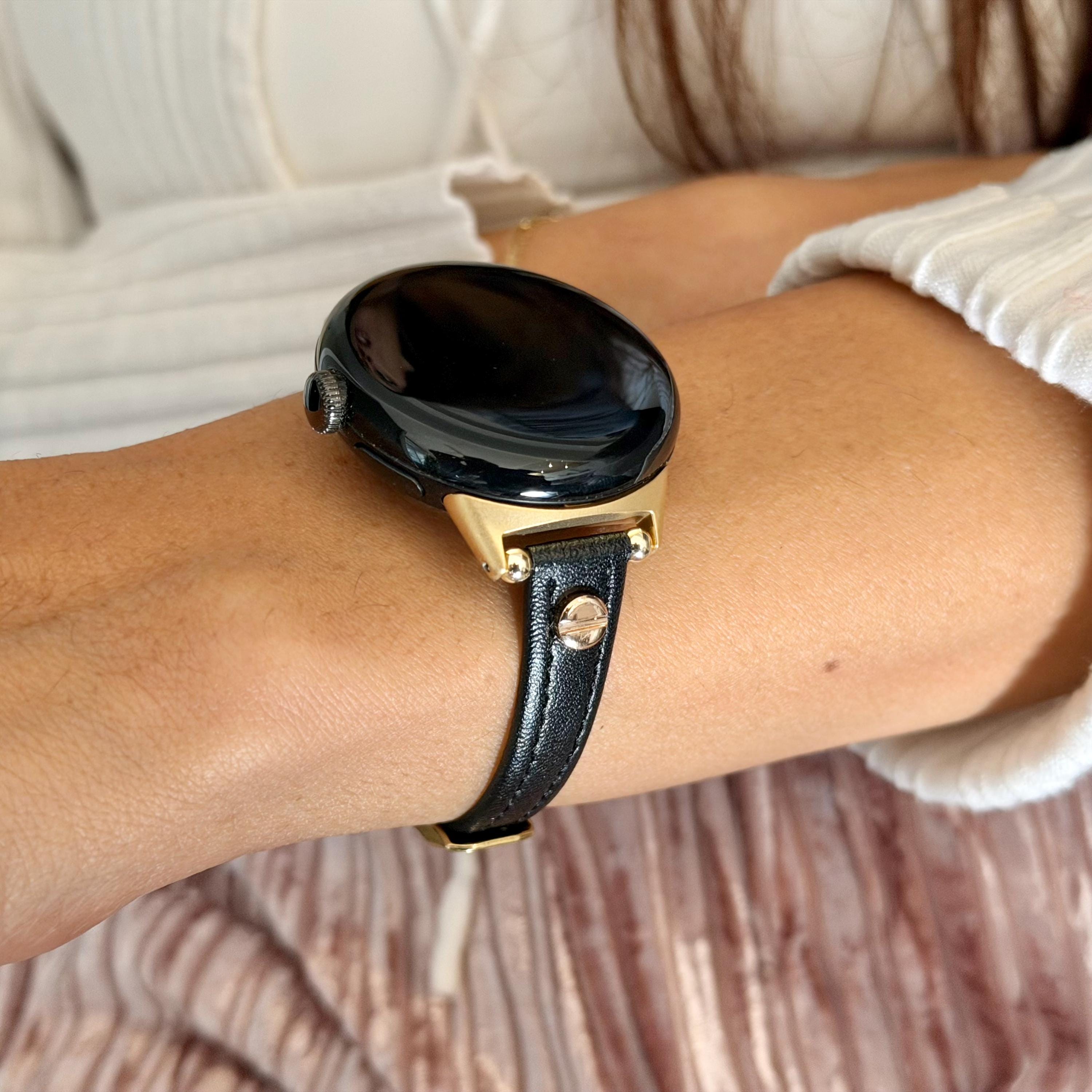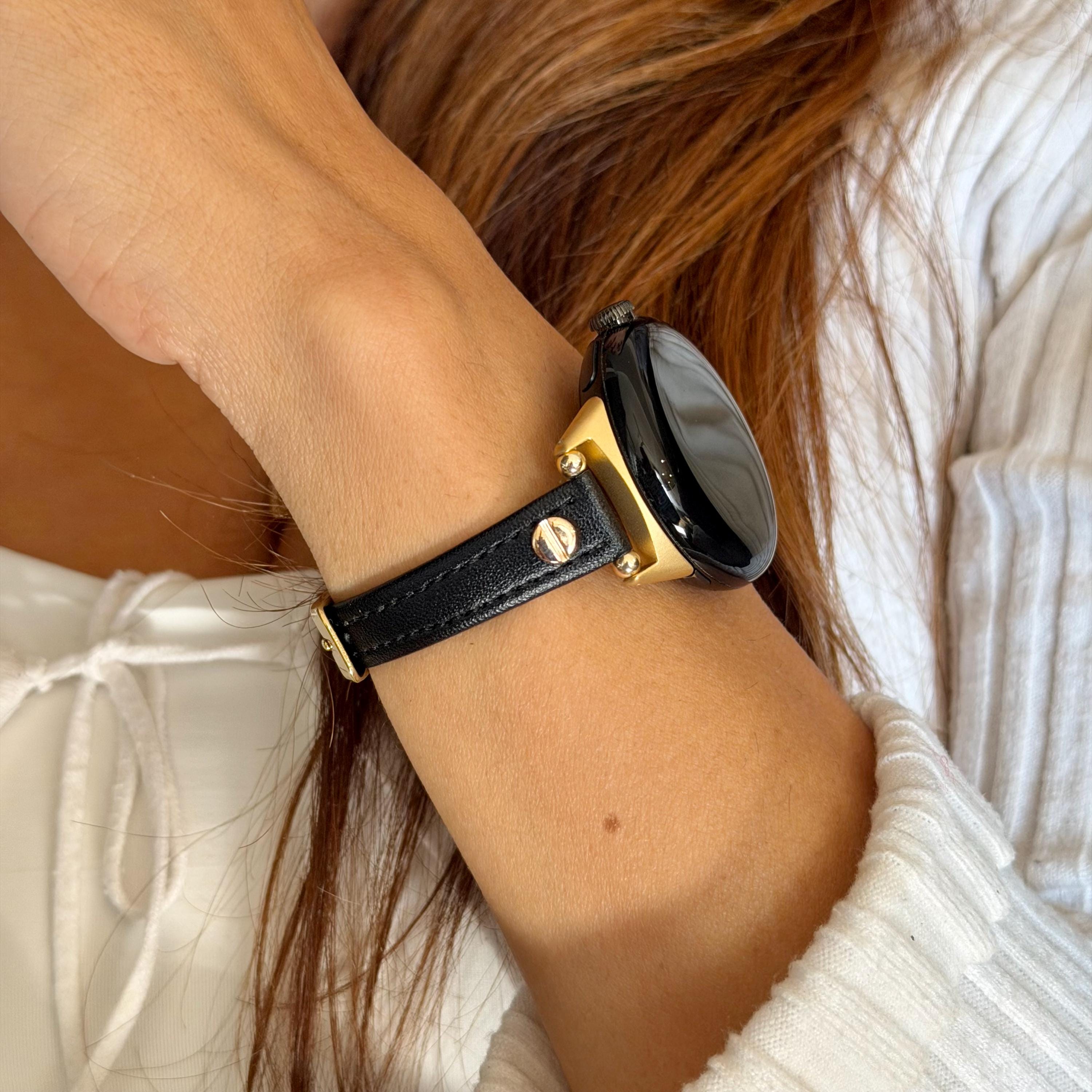 Slim Black Leather Google Pixel Watch Band Series 4/3/2 Strap Gold Accents Bracelet.