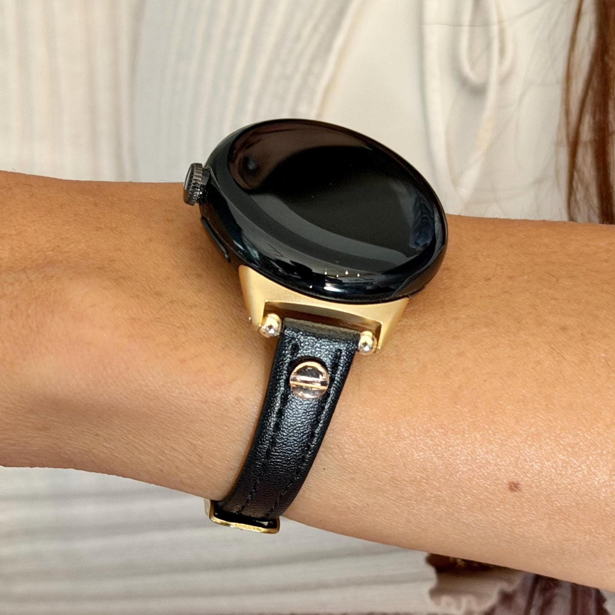 Slim Black Leather Google Pixel Watch Band Series 4/3/2 Strap Gold Accents Bracelet