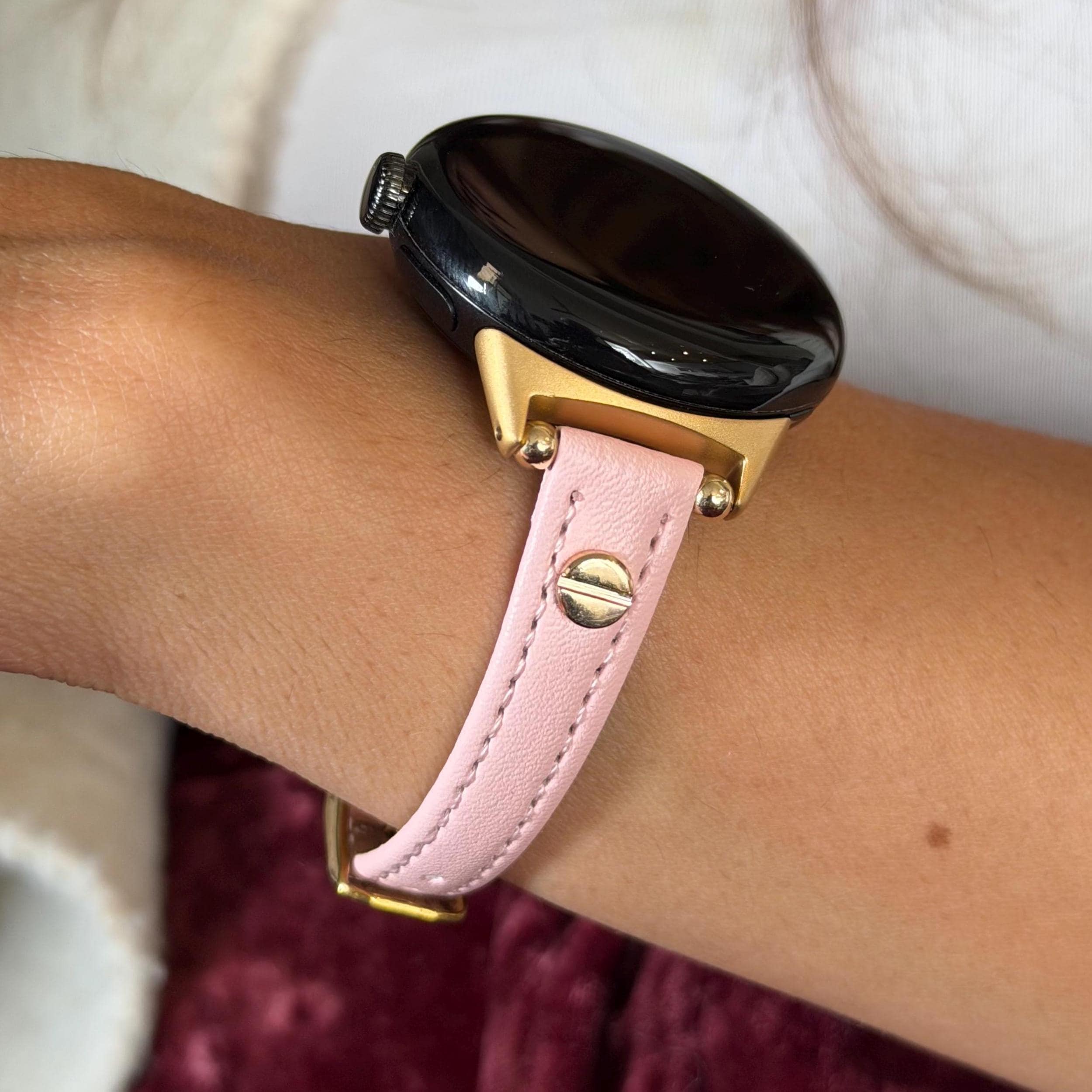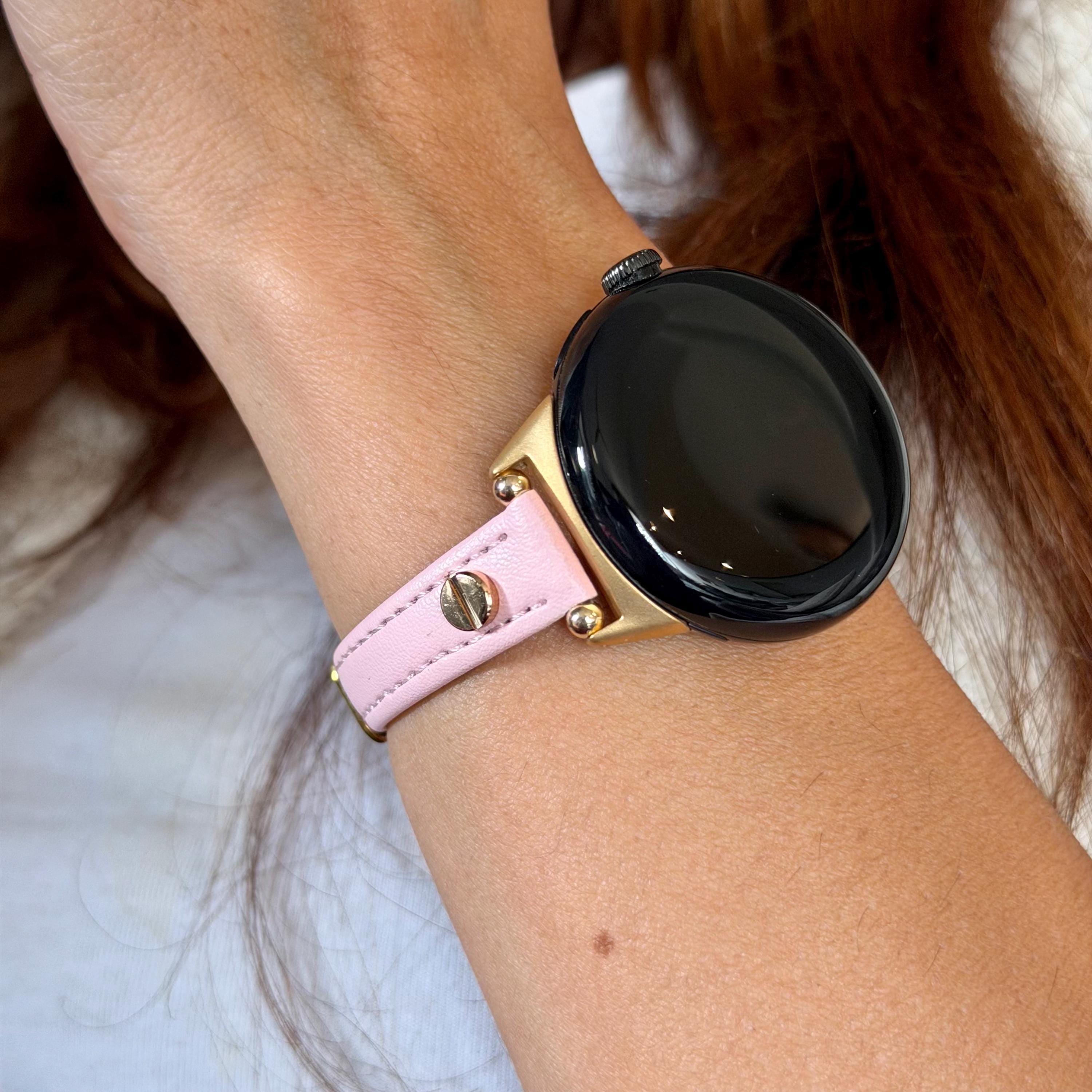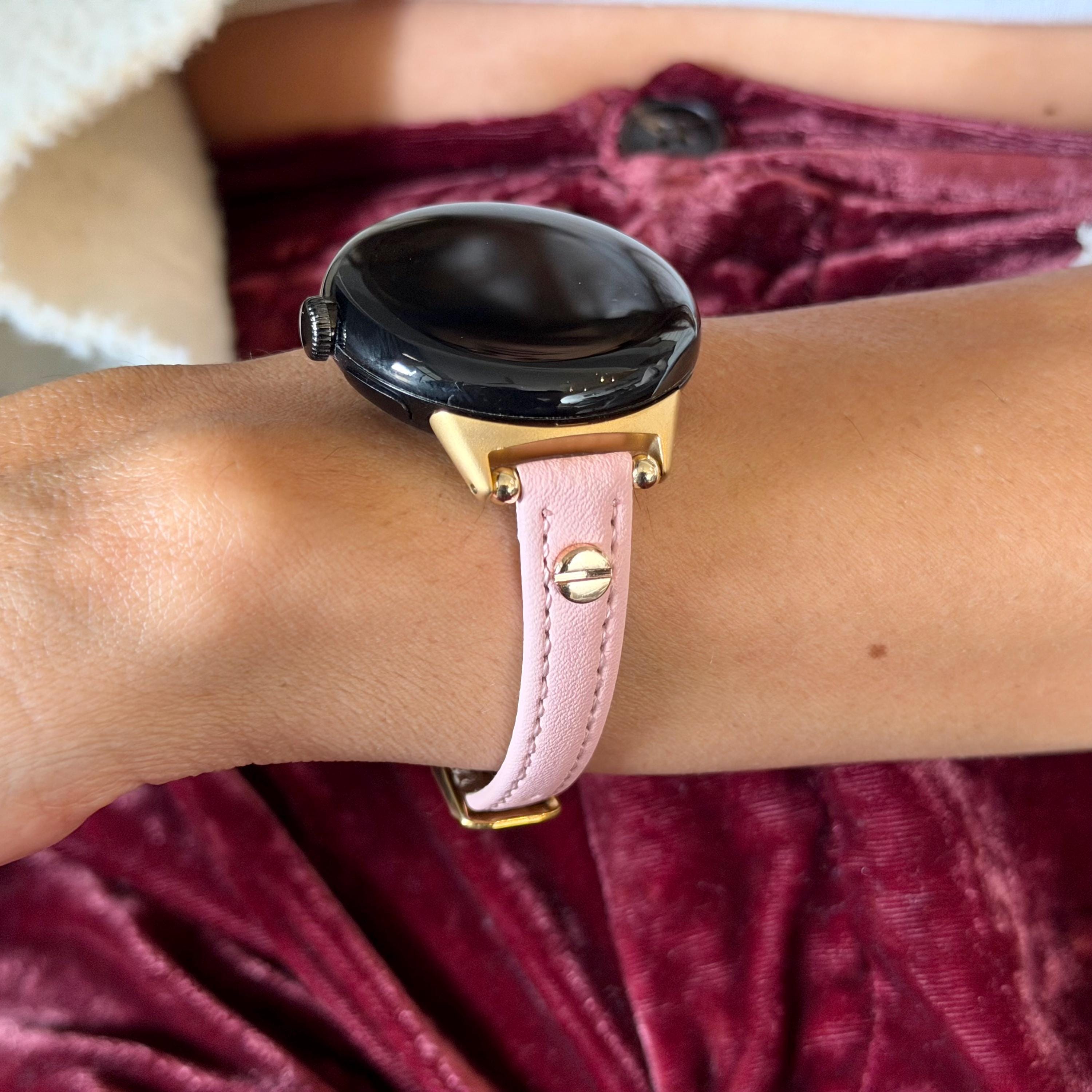 Pink Leather Google Pixel Watch 4 Band 41mm 45mm Slim Strap Gold Accents Bracelet