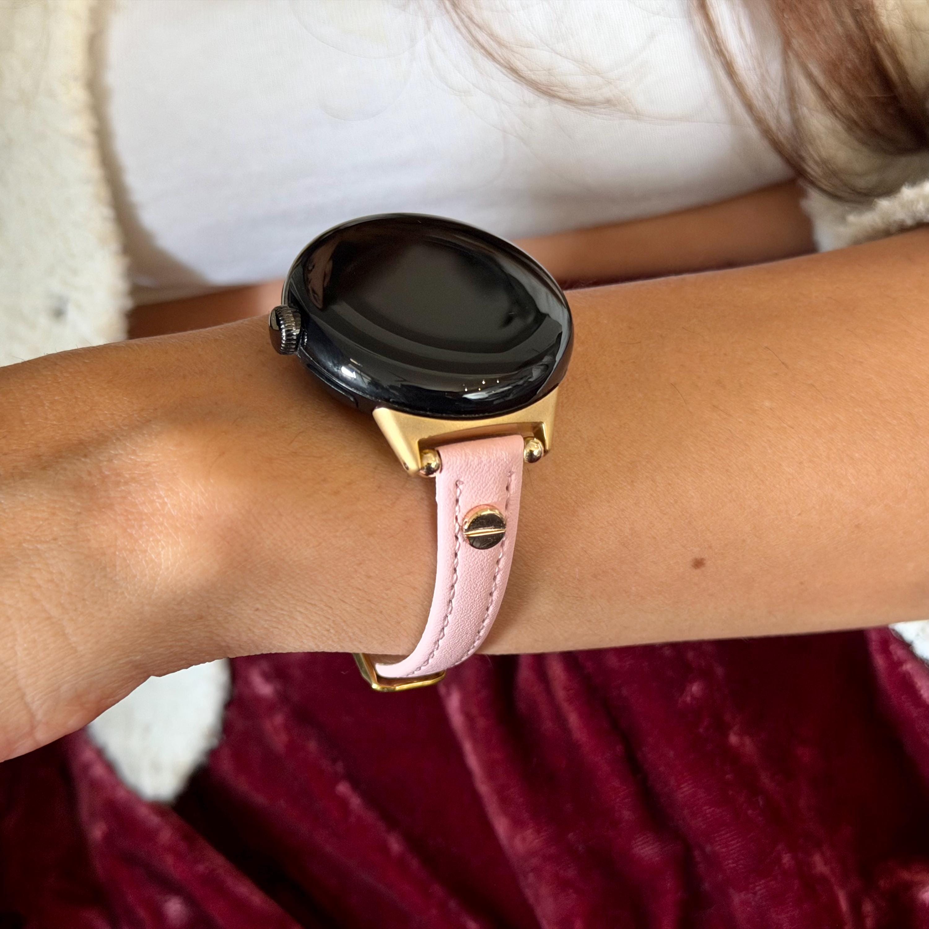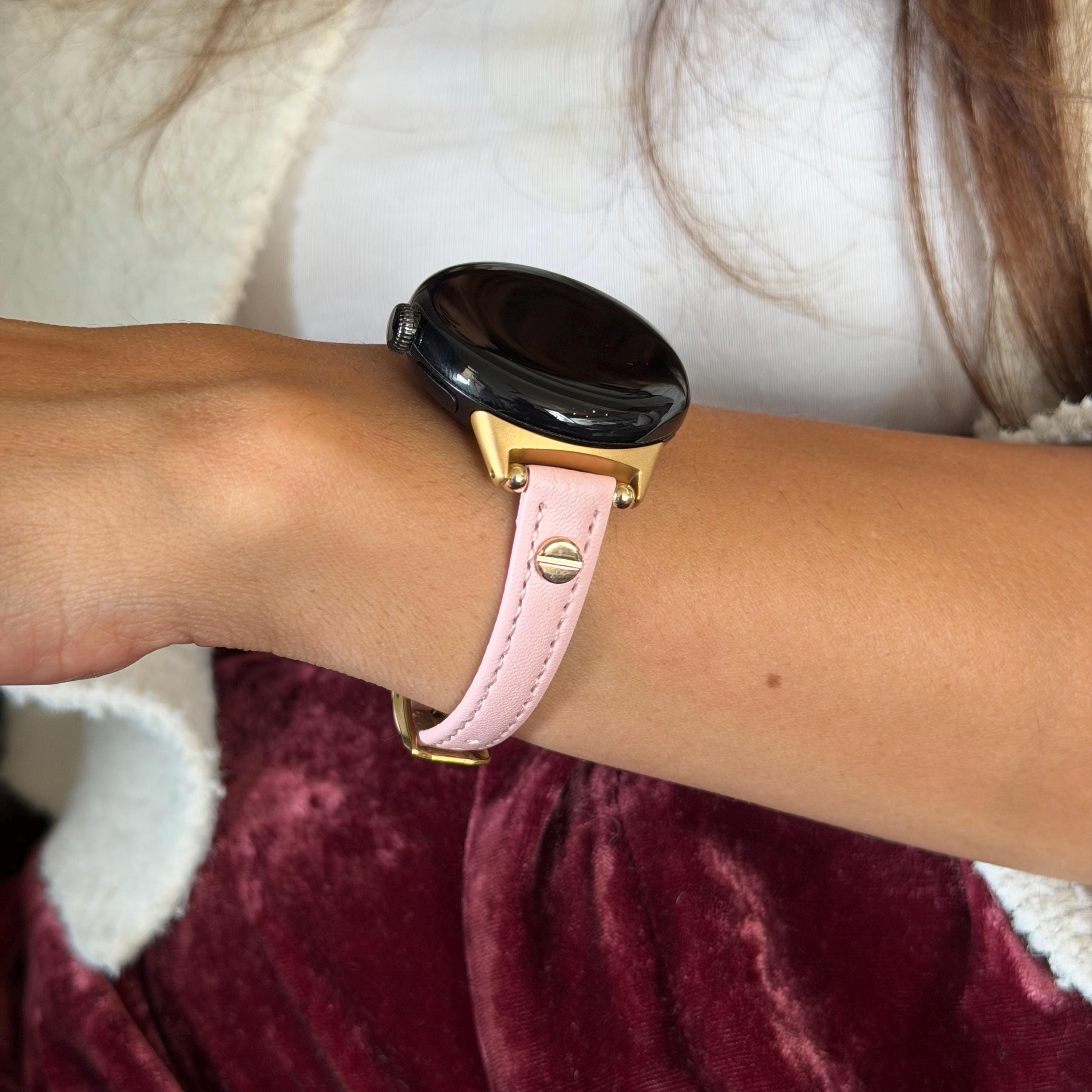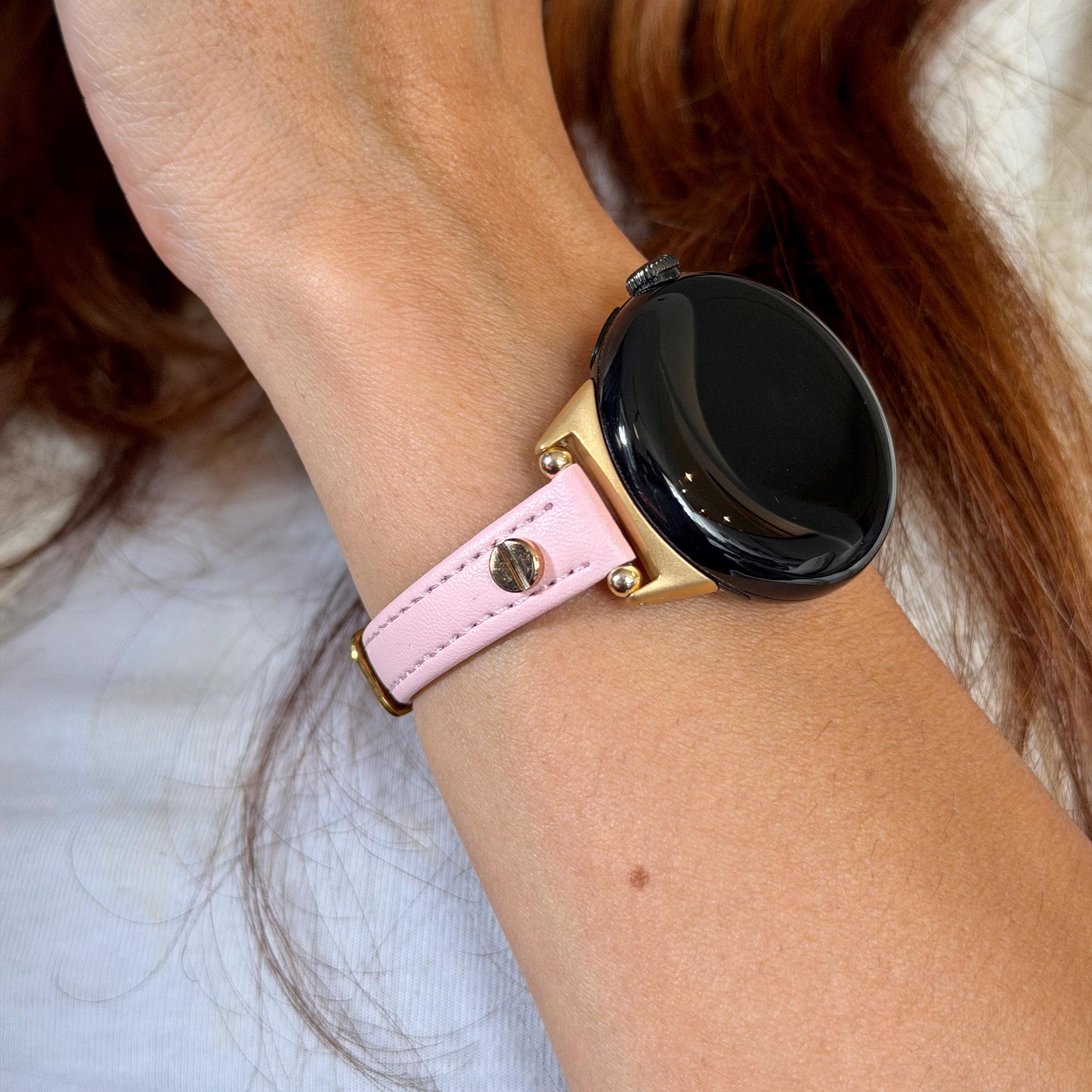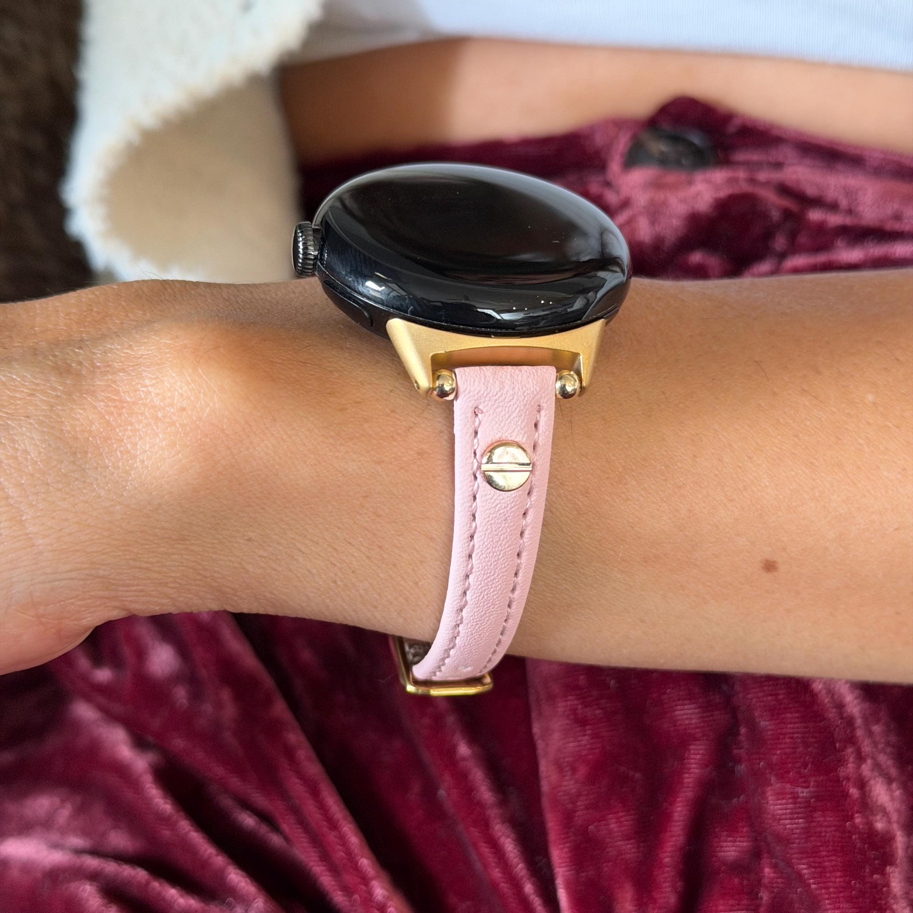 Pink Leather Google Pixel Watch 4 Band 41mm 45mm Slim Strap Gold Accents Bracelet