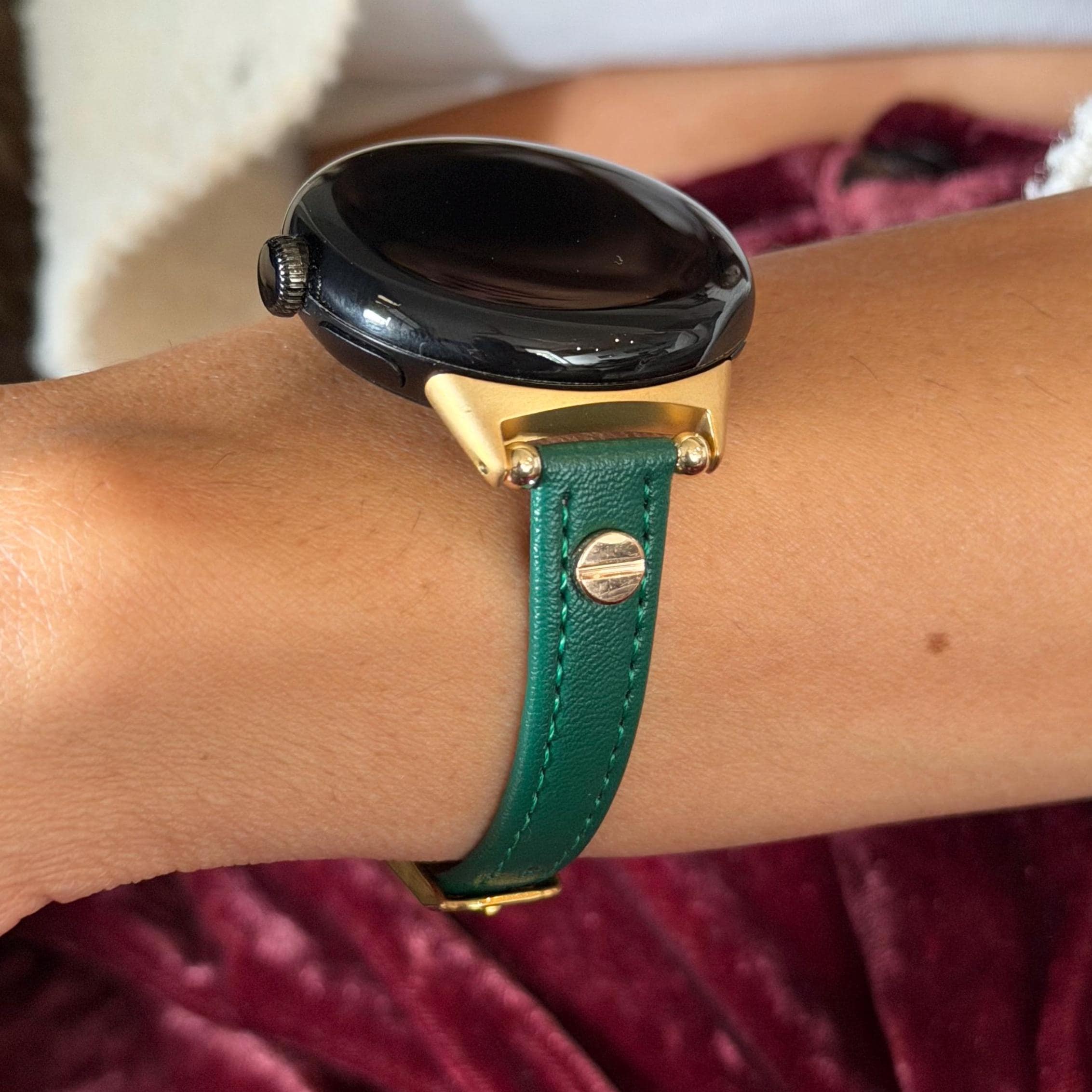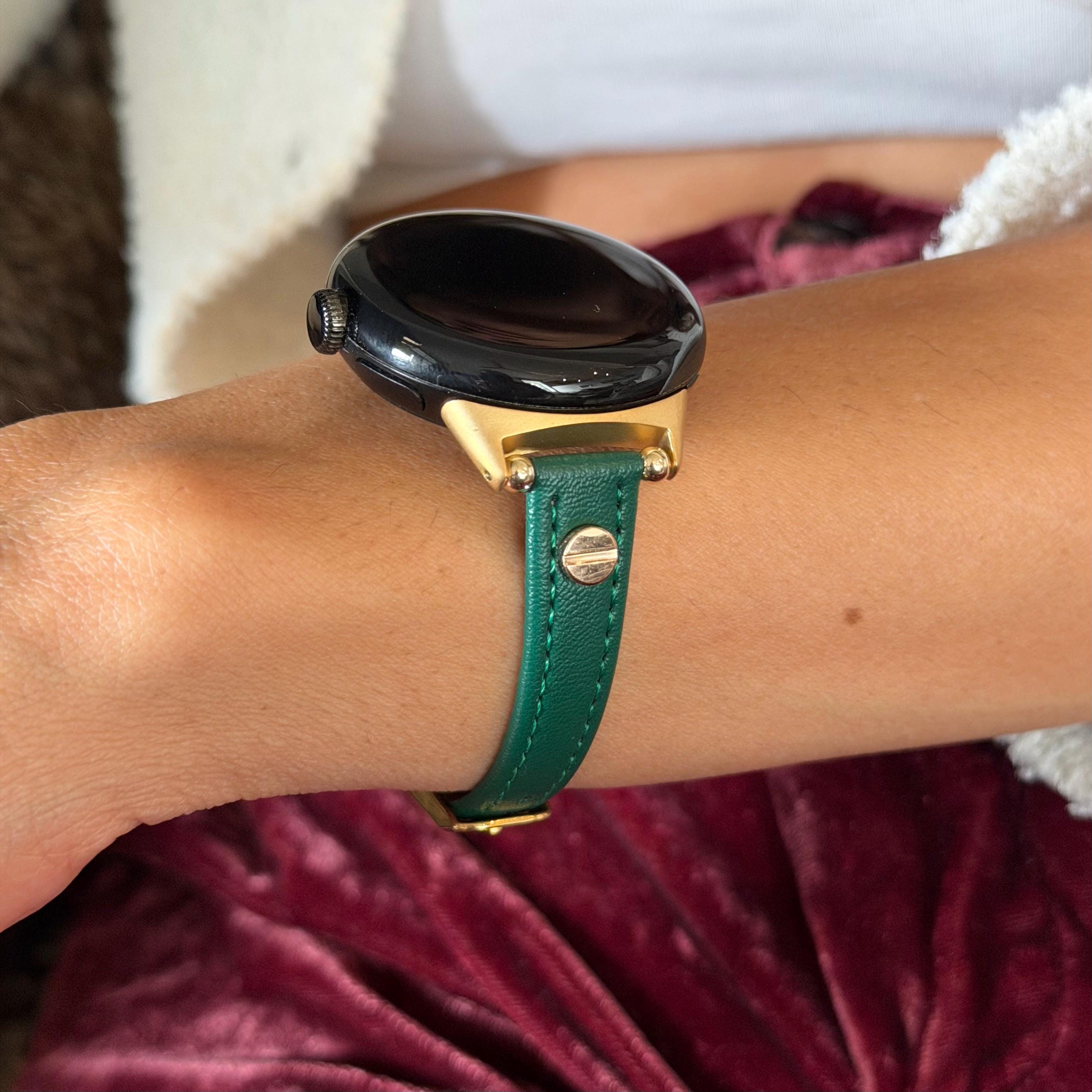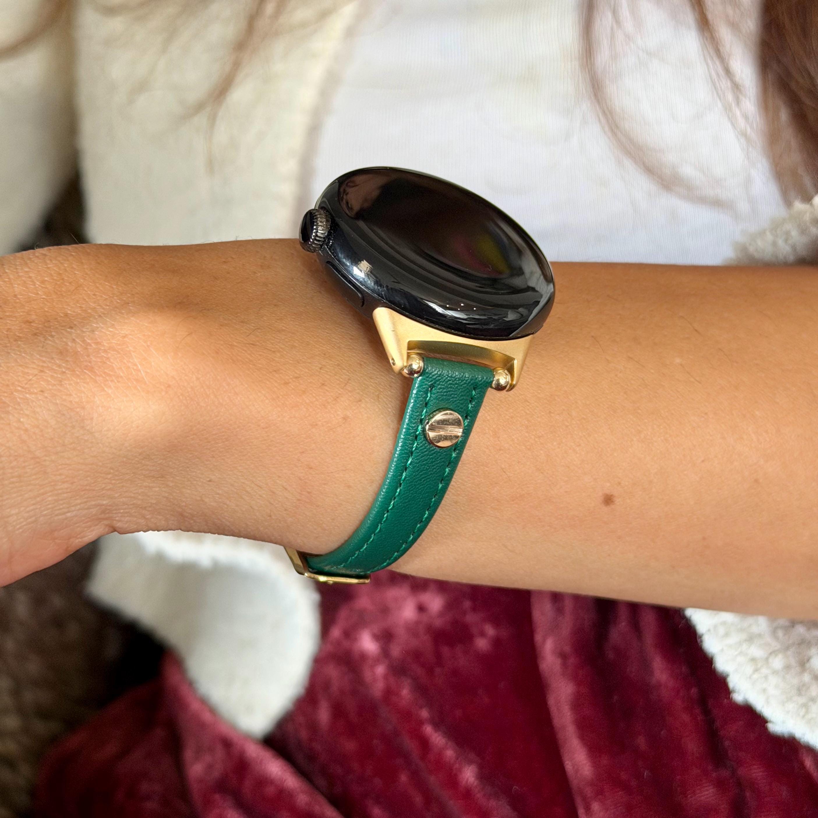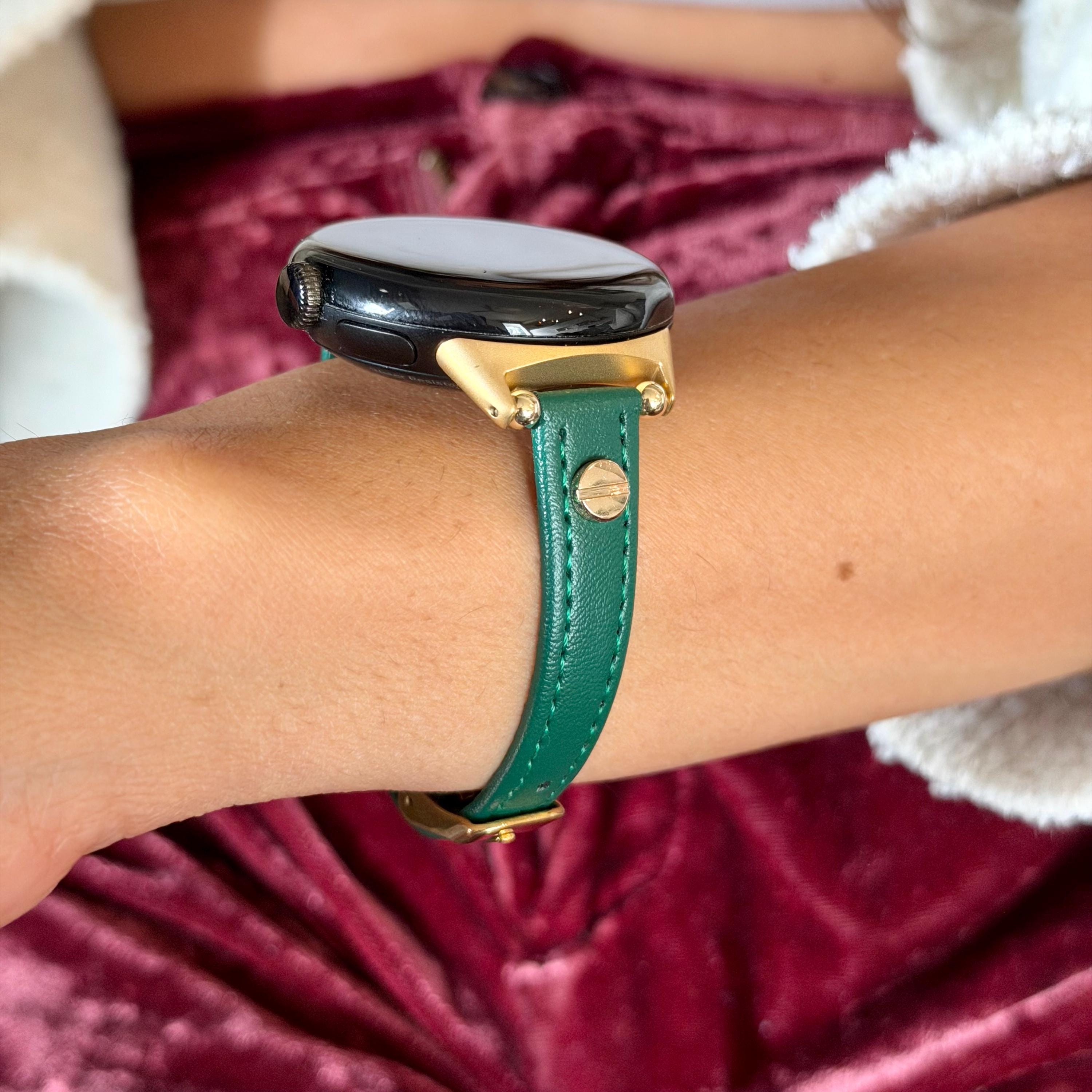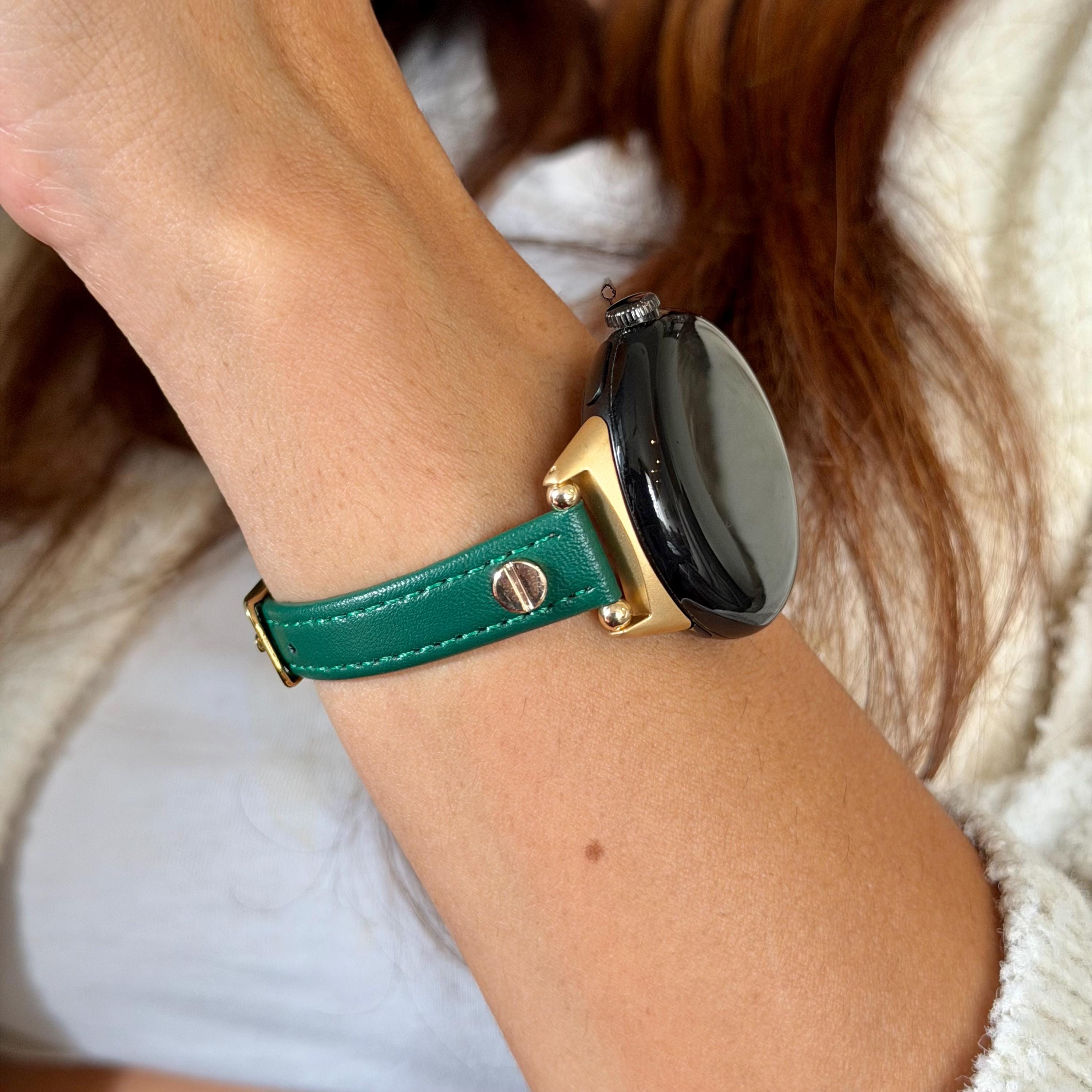 Emerald Green Leather Pixel Watch 4 Band 41mm 45mm Slim Strap Gold Accents Bracelet!