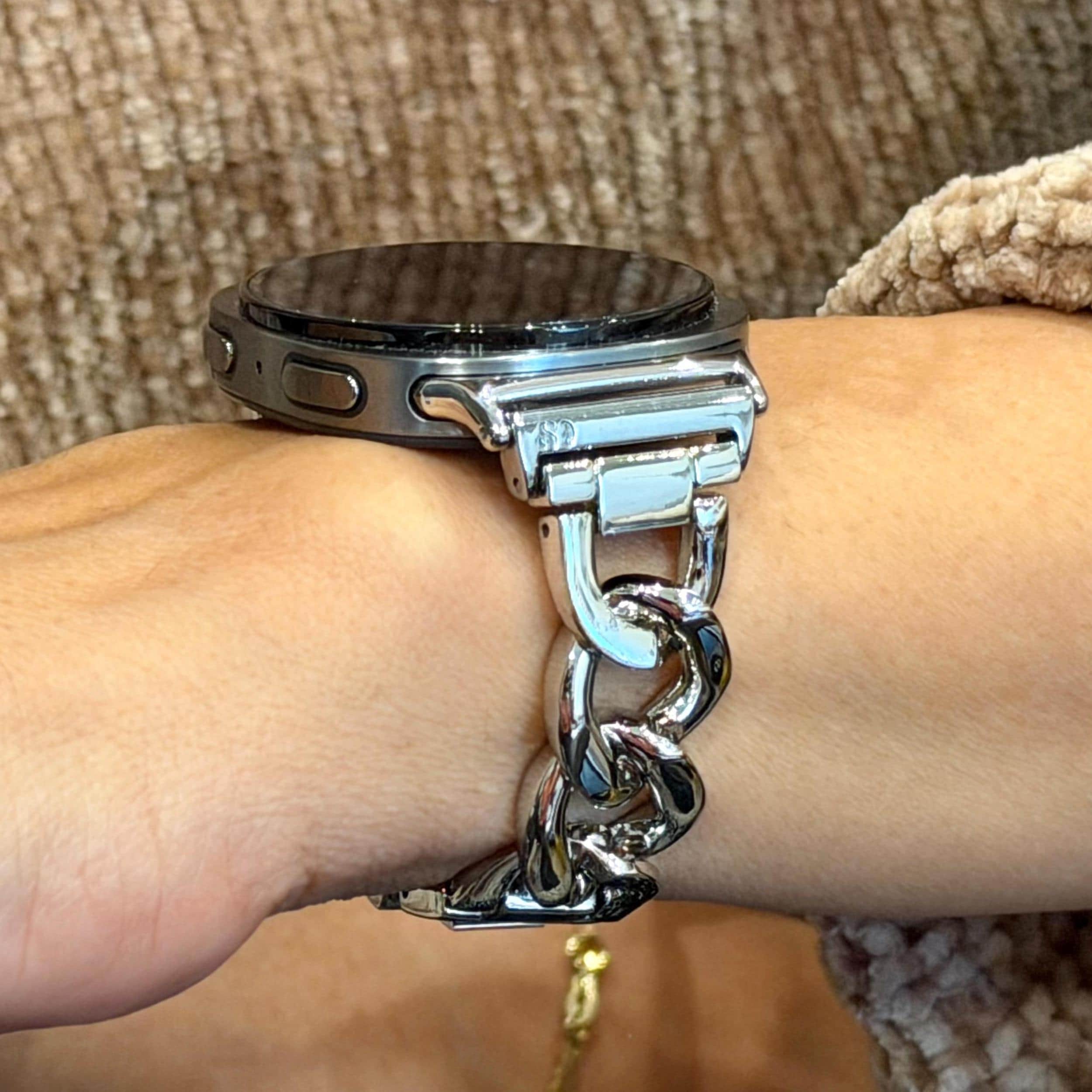 This silver bracelet band for Galaxy Watch 8 features adjustable links and a secure clasp for a comfortable jewelry-style fit, and it’s compatible with Galaxy Watch 8 Classic.