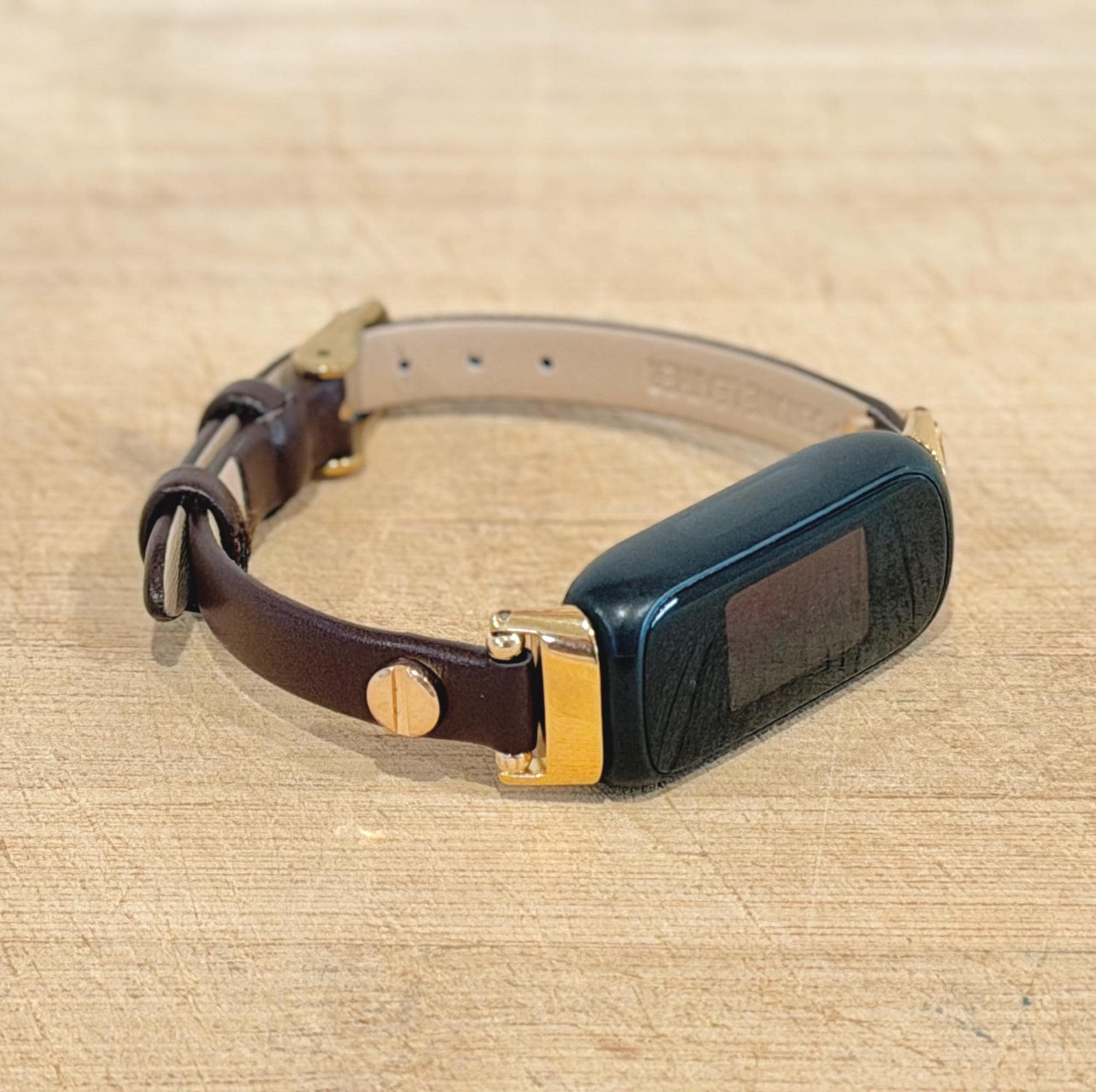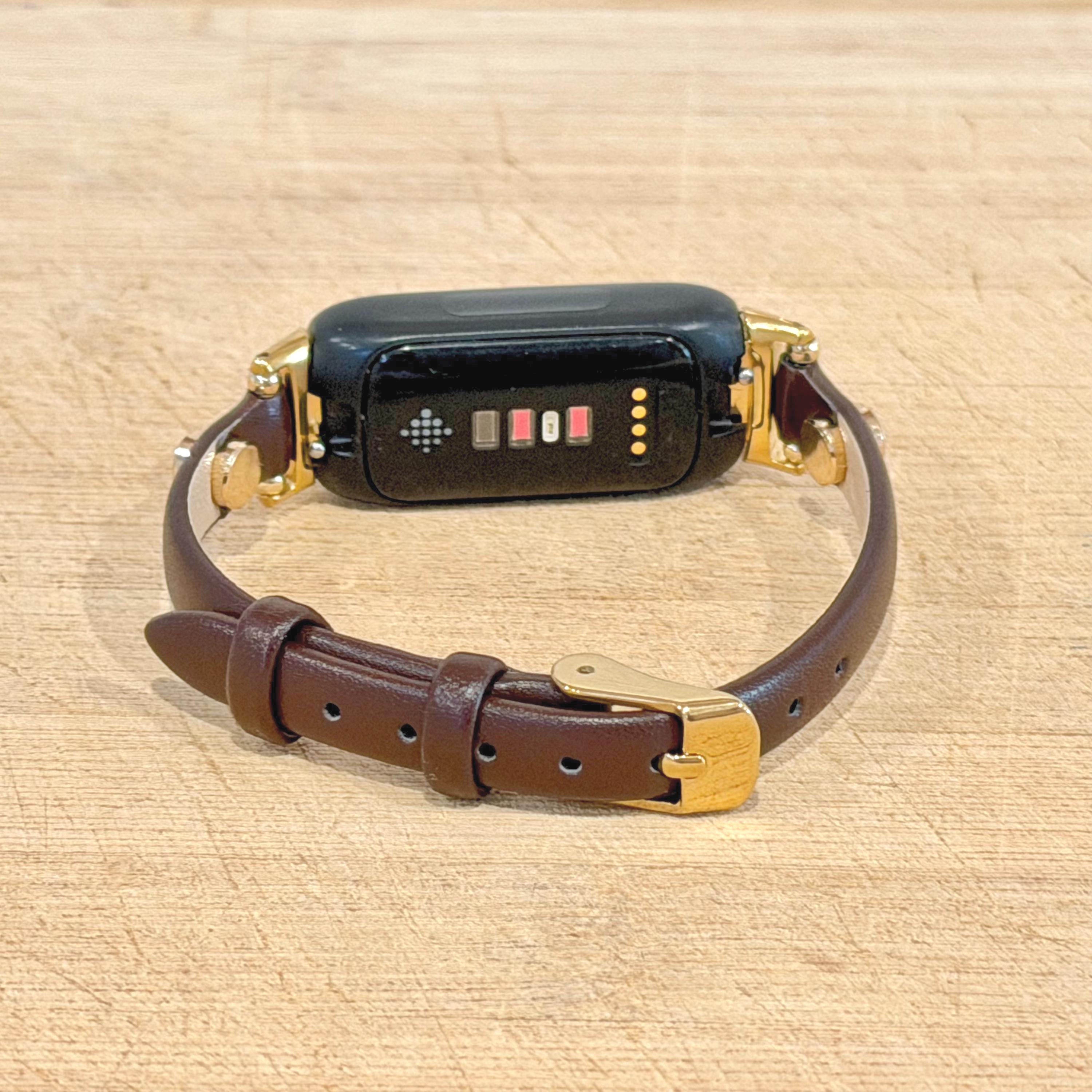 Slim Dark Brown Leather Fitbit Inspire 3 Band Strap, Gold Accents Women's Bracelet
