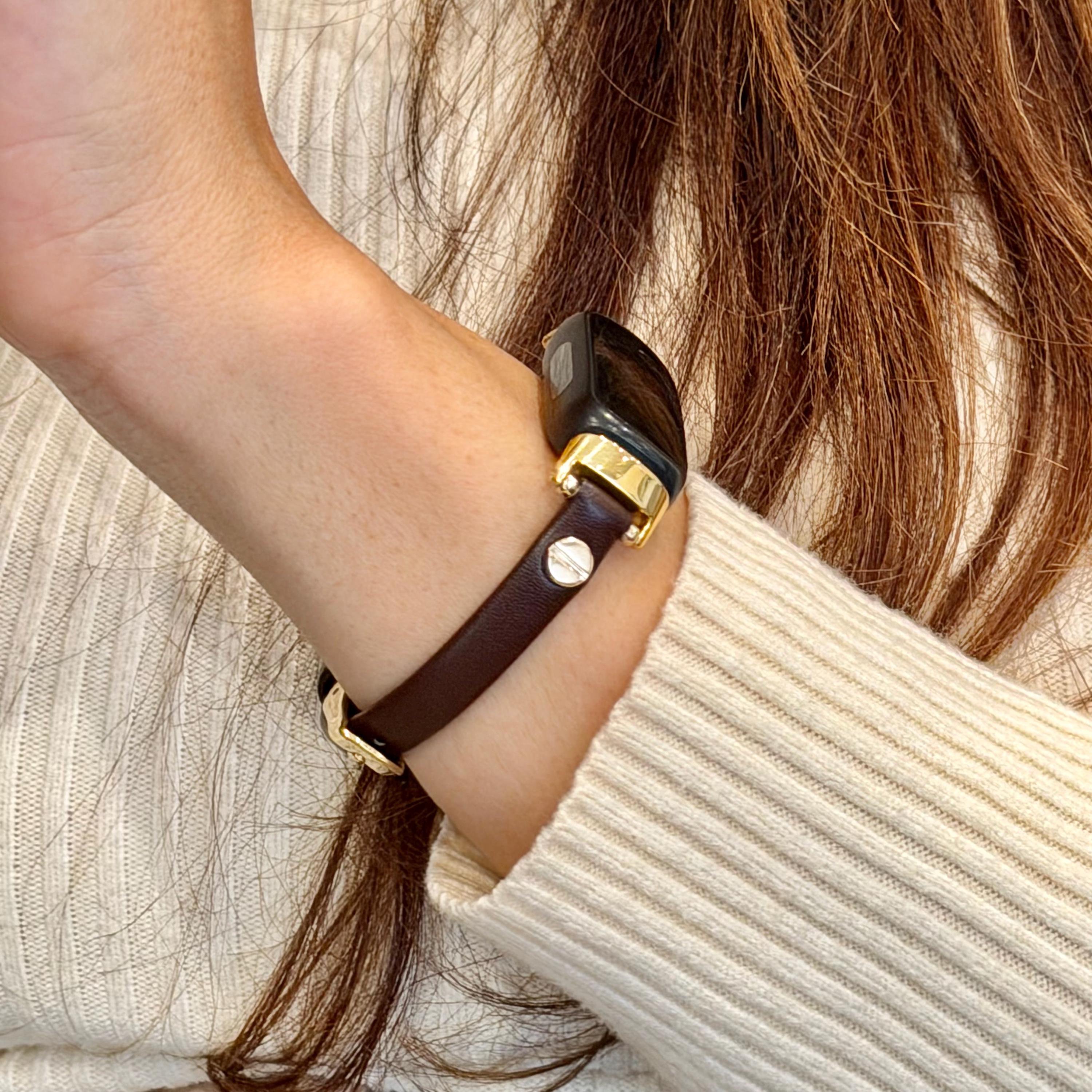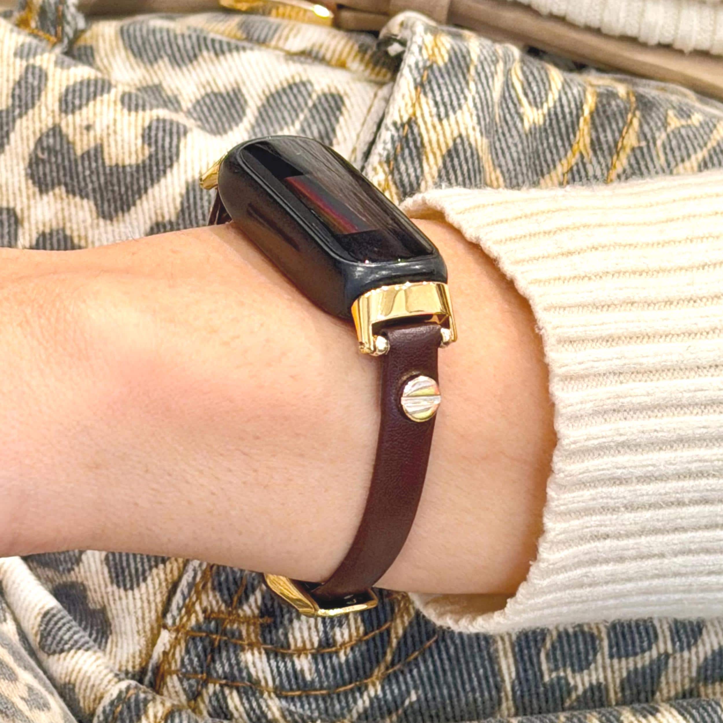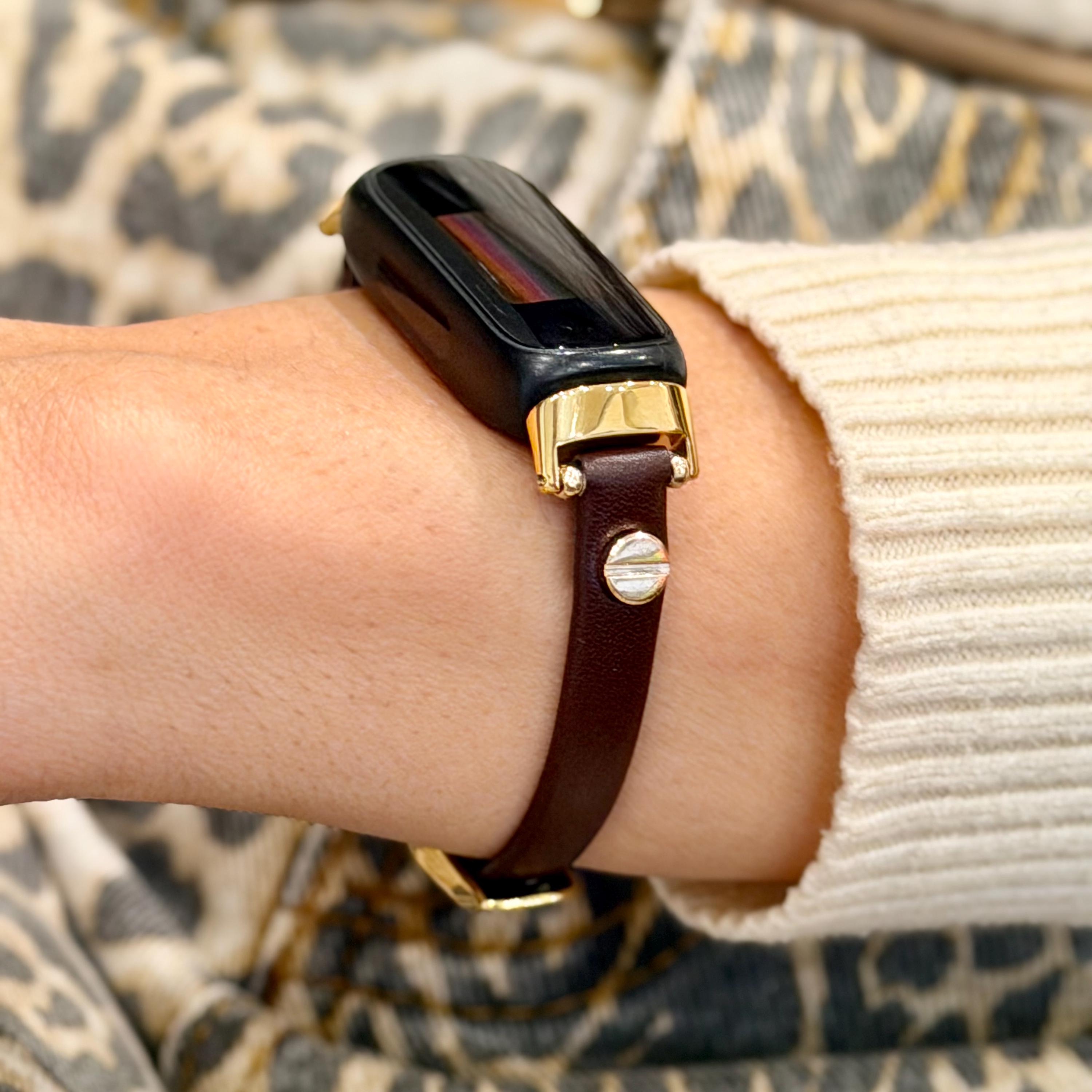 Slim Dark Brown Leather Fitbit Inspire 3 Band Strap, Gold Accents Women Bracelet