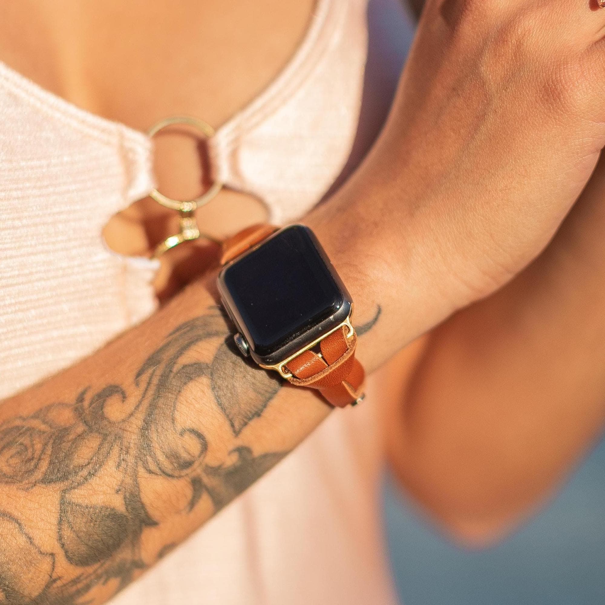 Slim brown leather Apple Watch band for women with elegant gold accents.