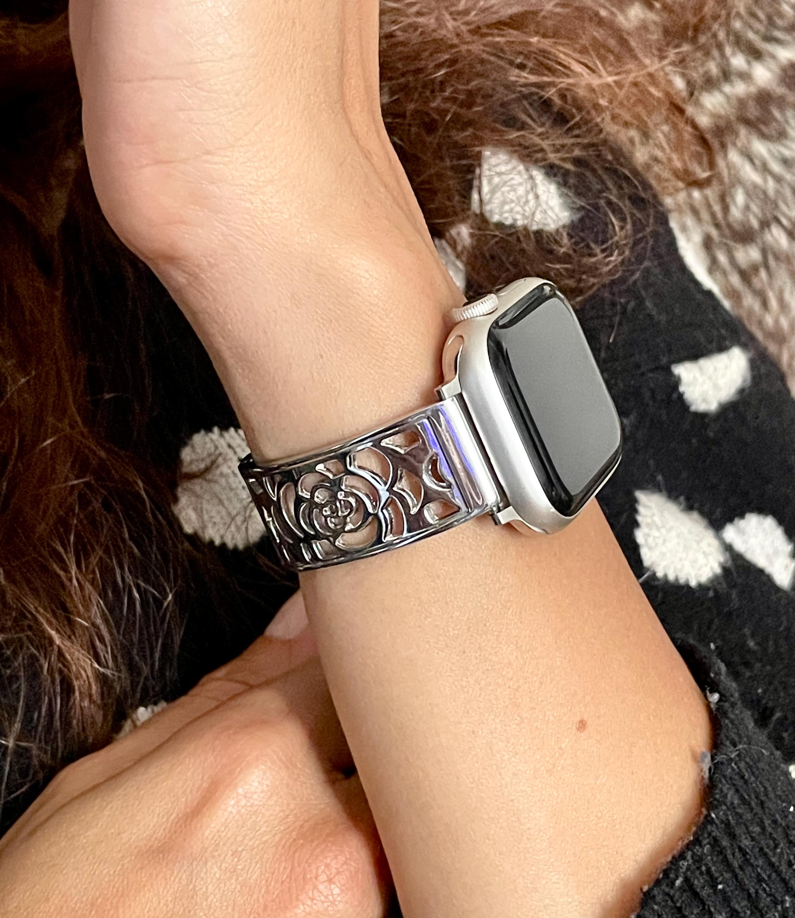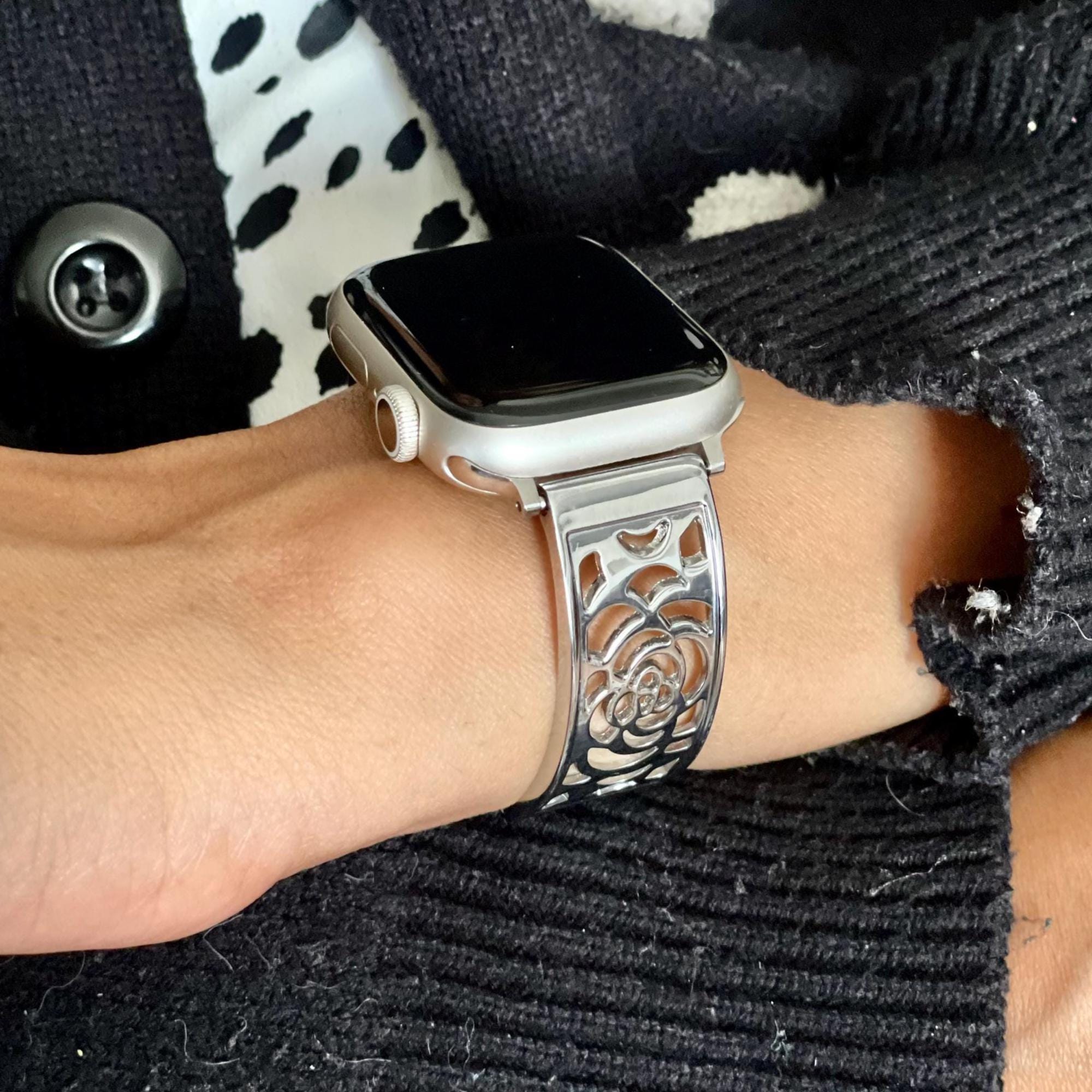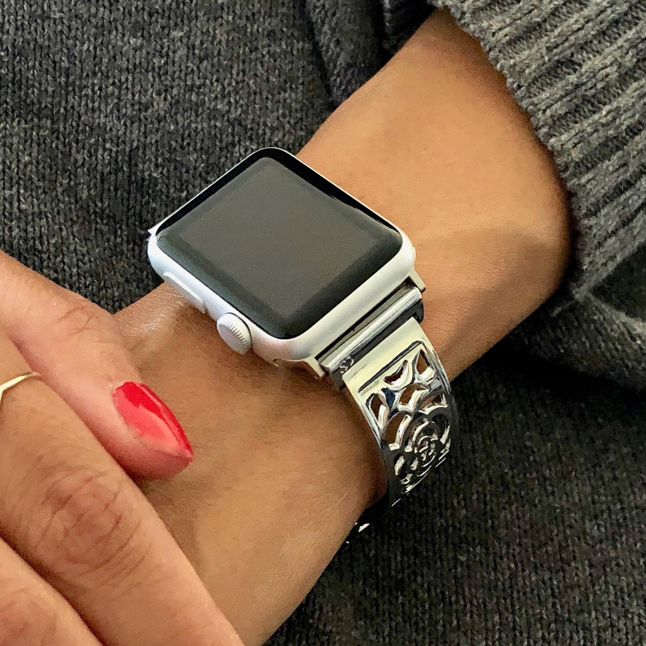 Very disappointed with this Apple Watch band that I bought as a gift for my wife. The product listing implies it is sterling silver but in fact it’s not. A small decorative heart is all that is likely to be sterling silver. In addition the band has chafed my wife’s wrist and she, understandably, will not wear it. The underside of the band has a sharp edge. Never again from this seller.