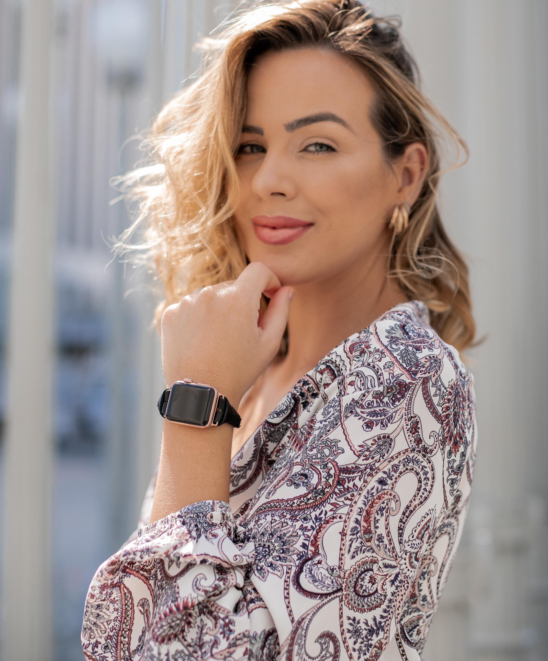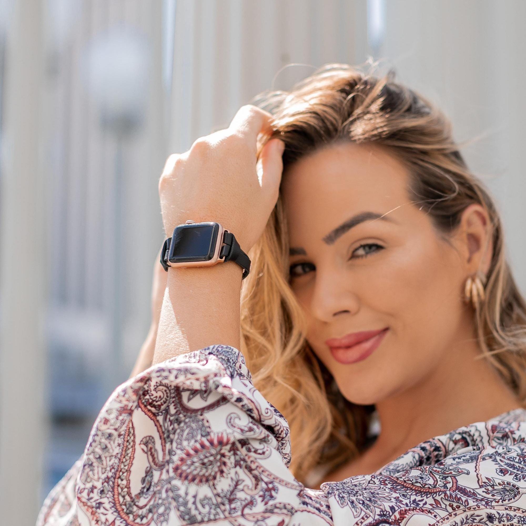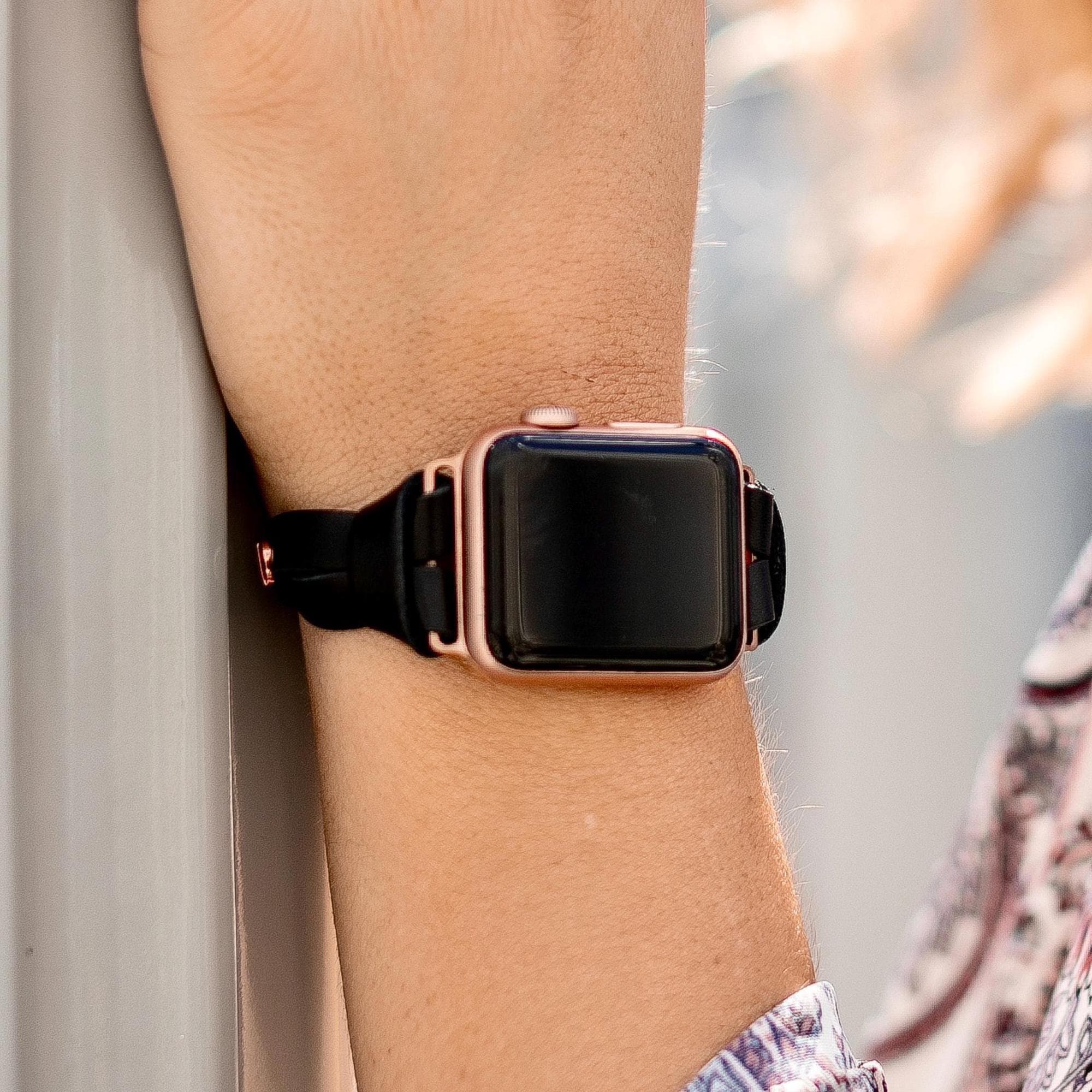 This slim 8mm black leather Apple Watch band features rose gold accents and an adjustable bracelet style fit for a clean, feminine everyday look.