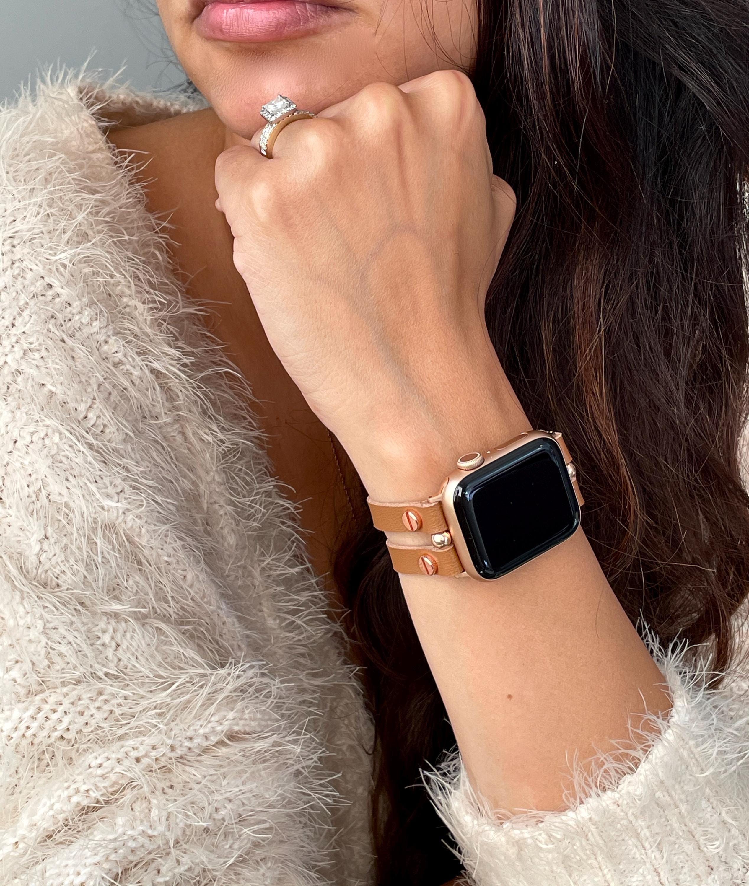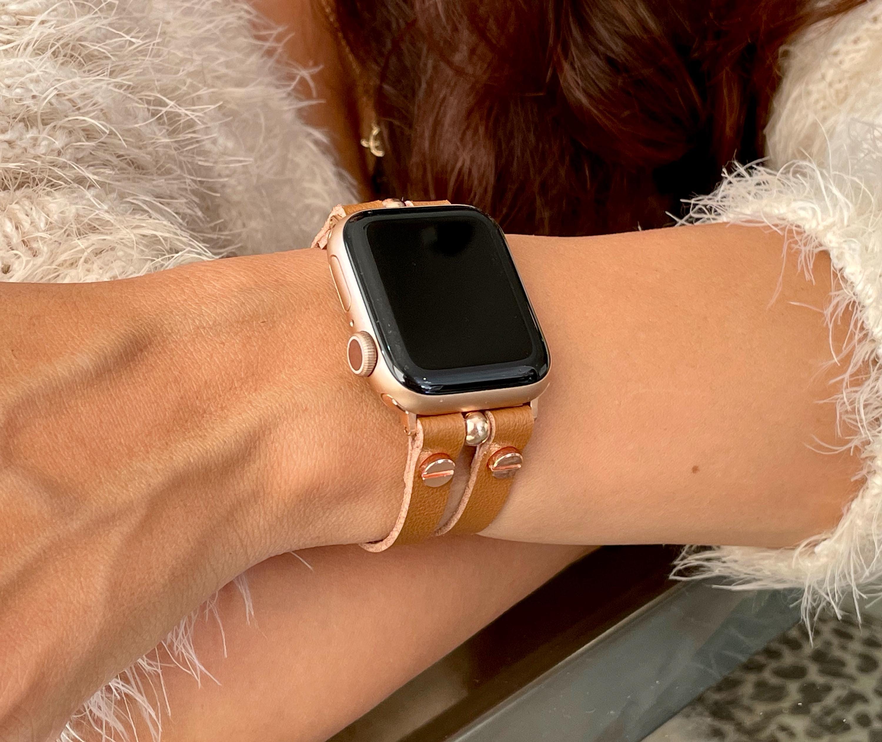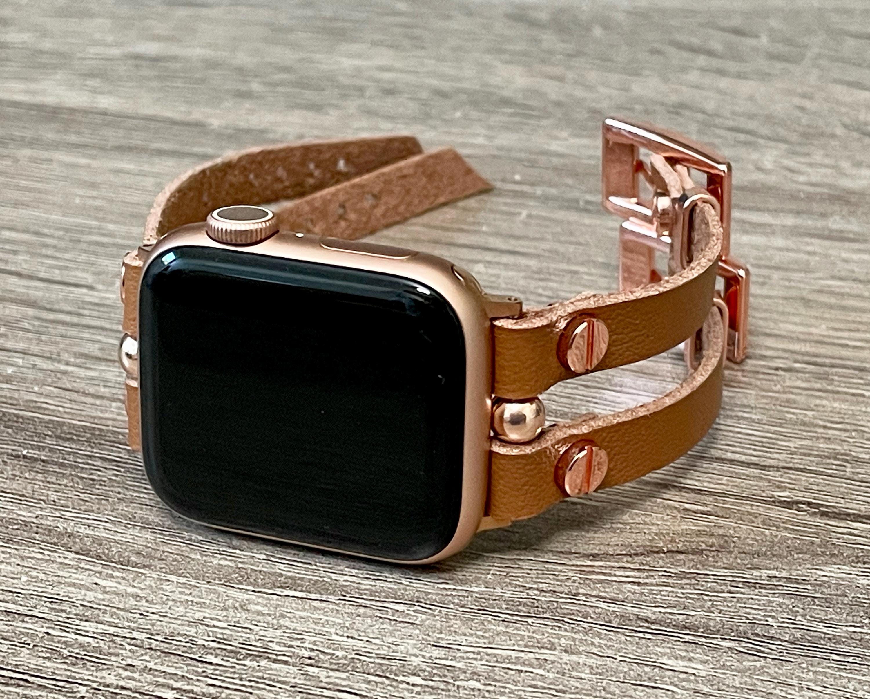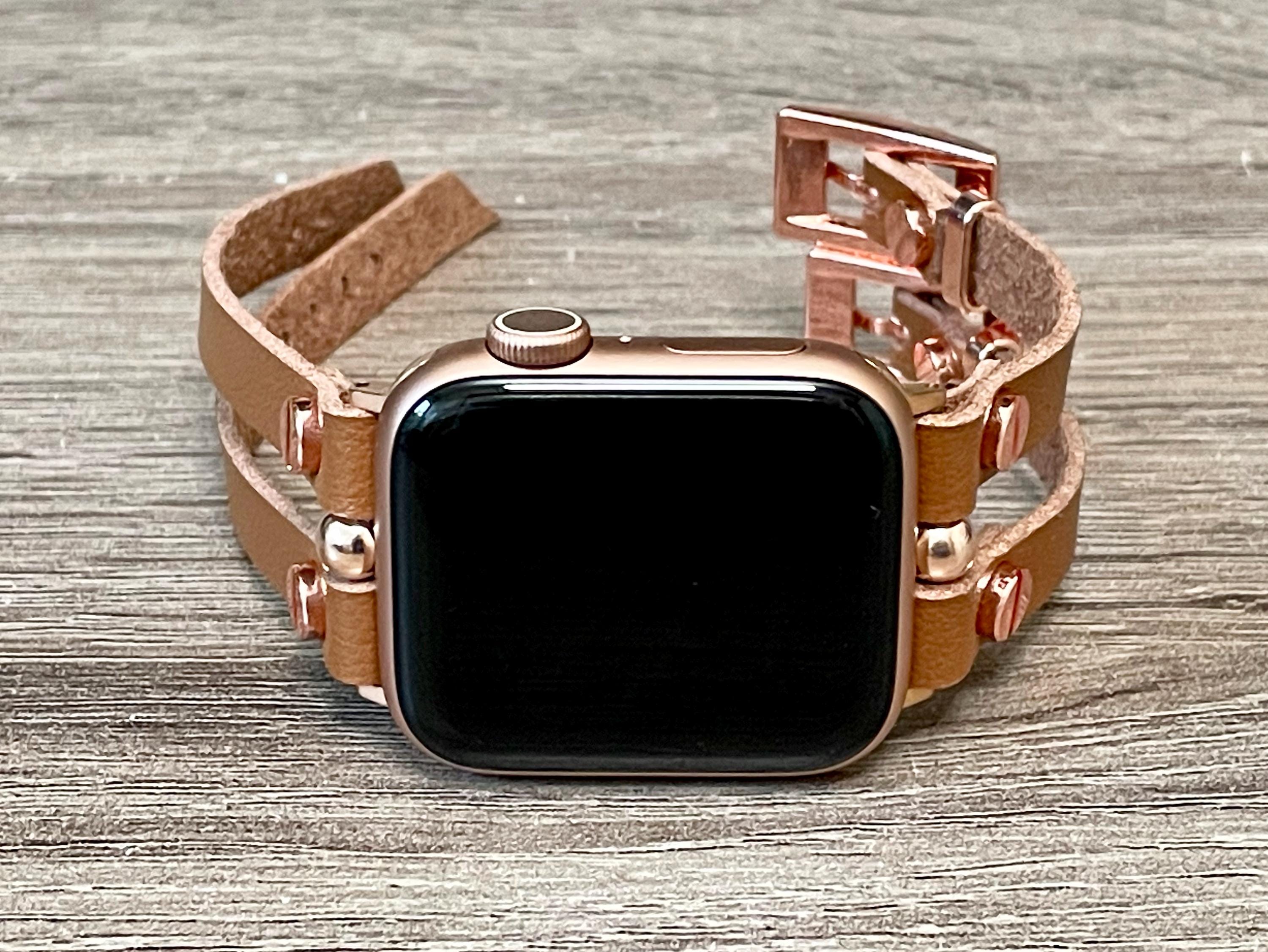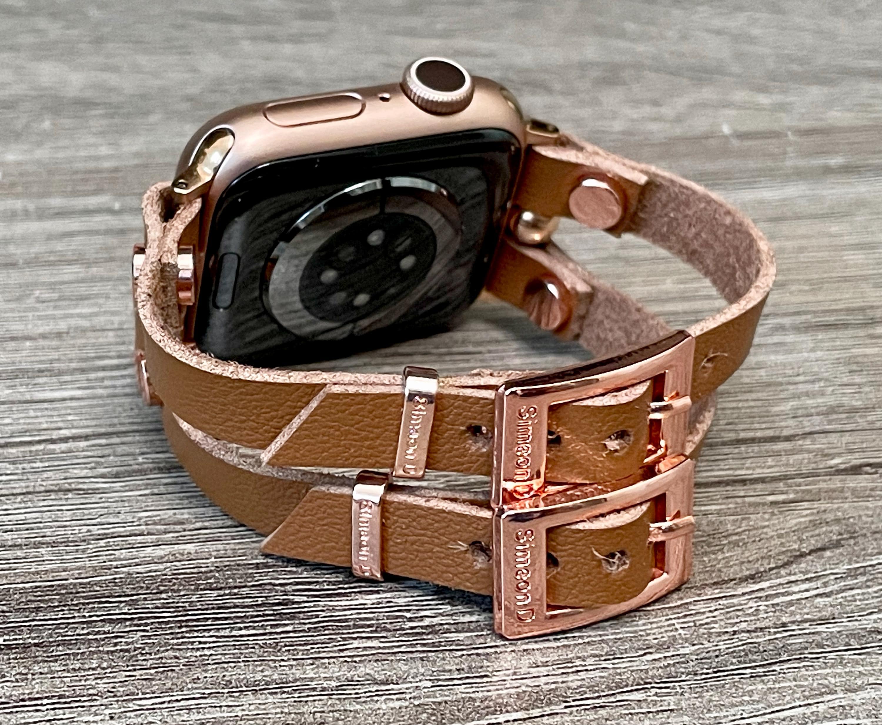 Double Straps Leather Apple Watch Band 42mm 46mm 49mm Rose Gold Bracelet.