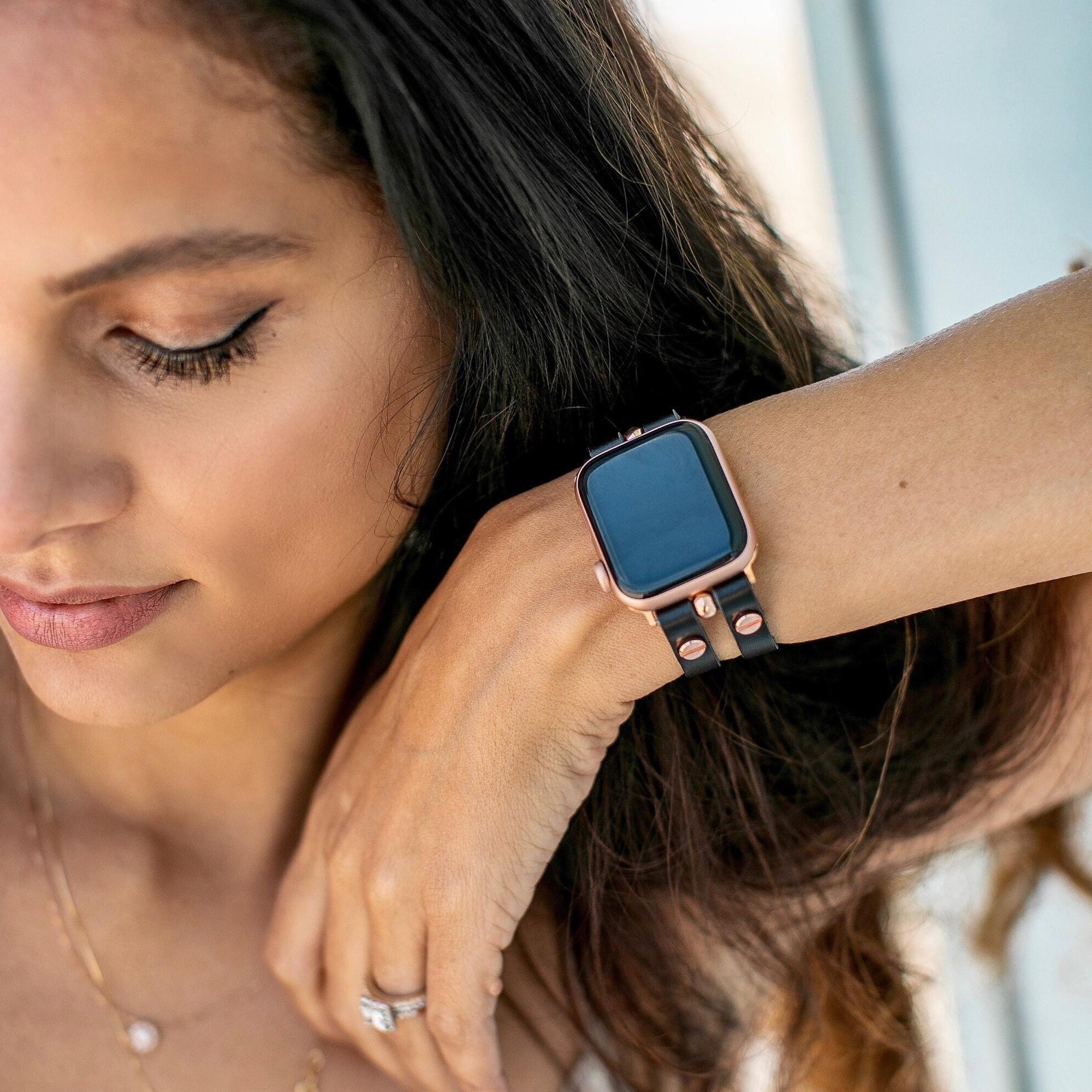 Women Apple Watch Band Black Leather Rose Gold Strap Bracelet