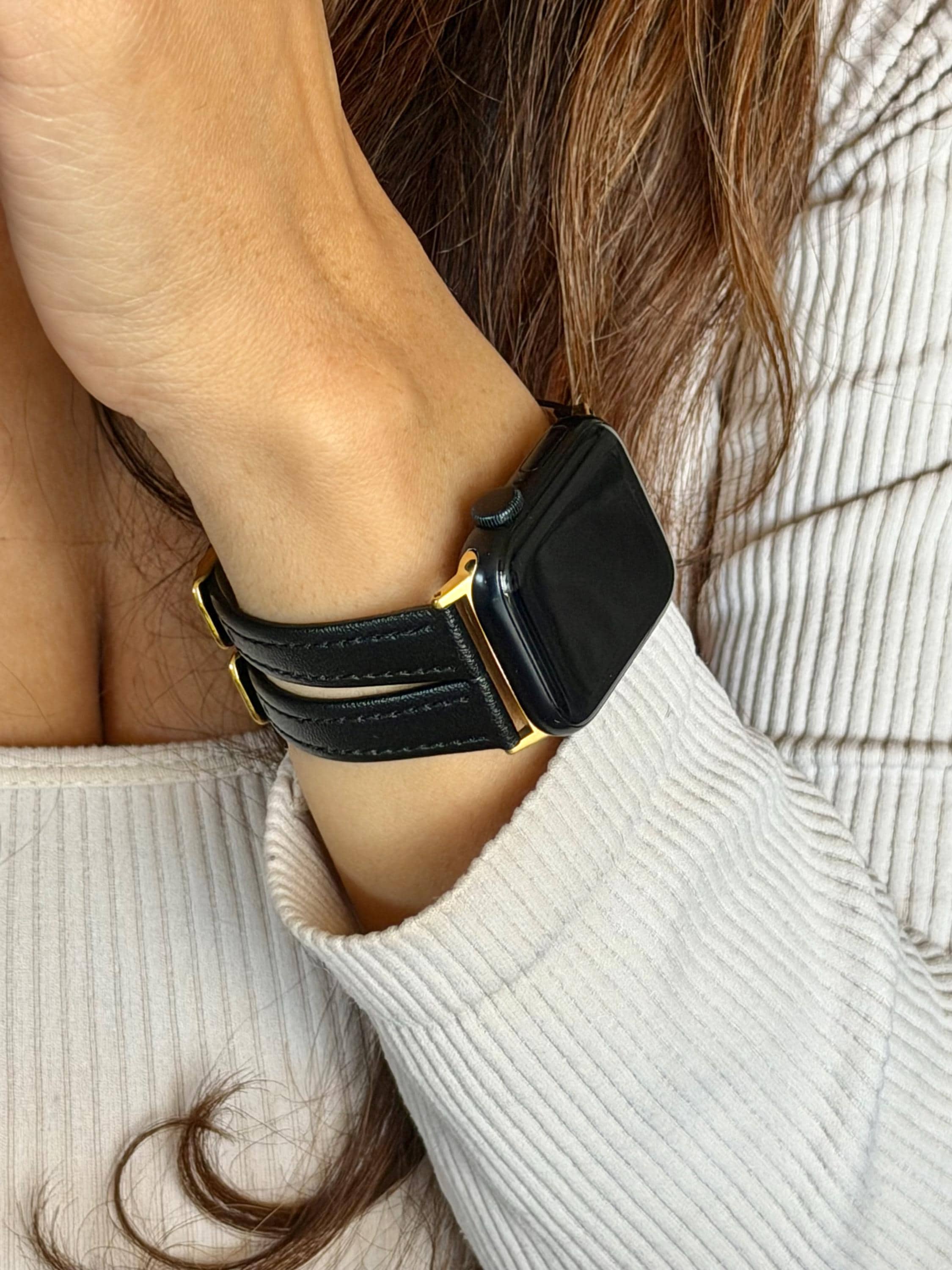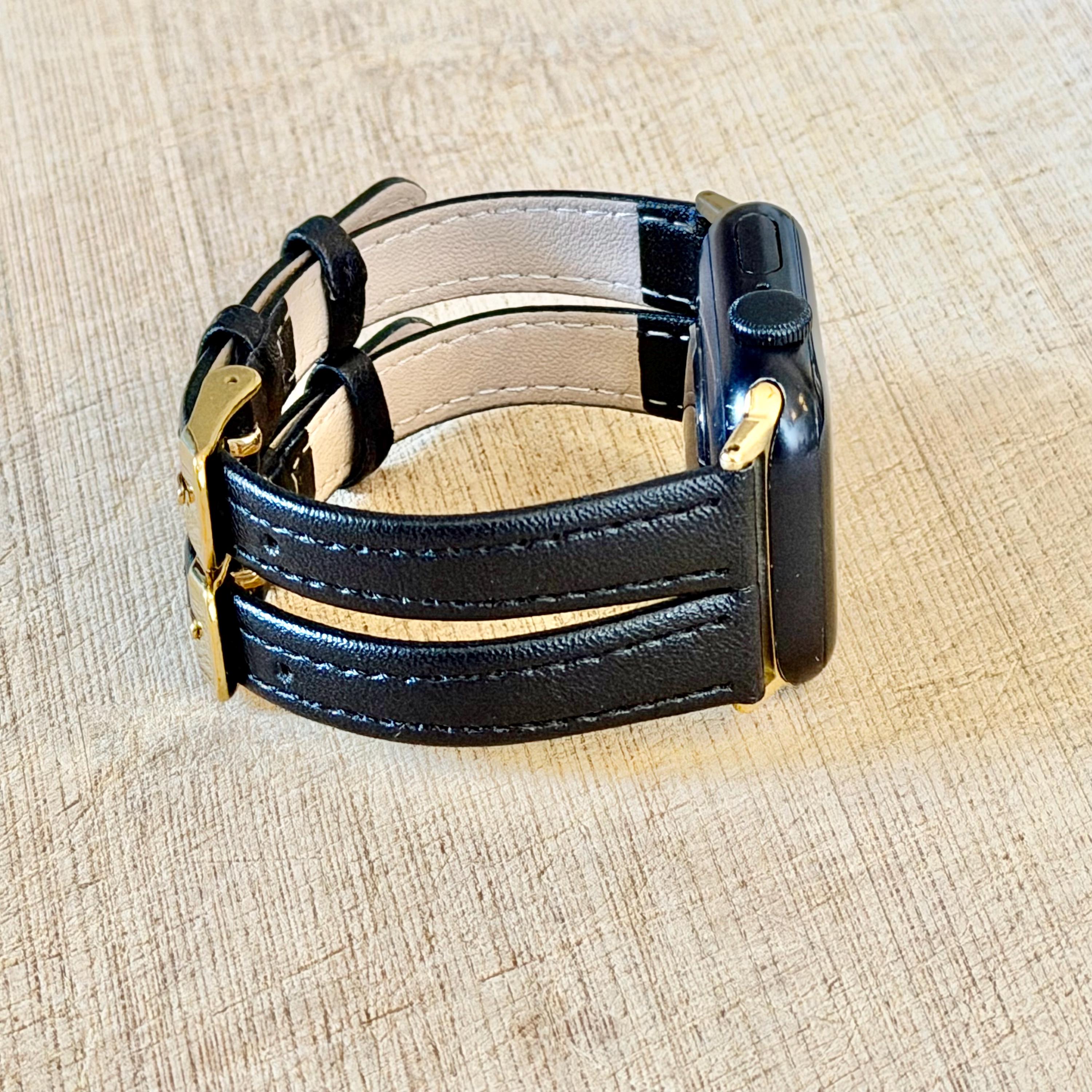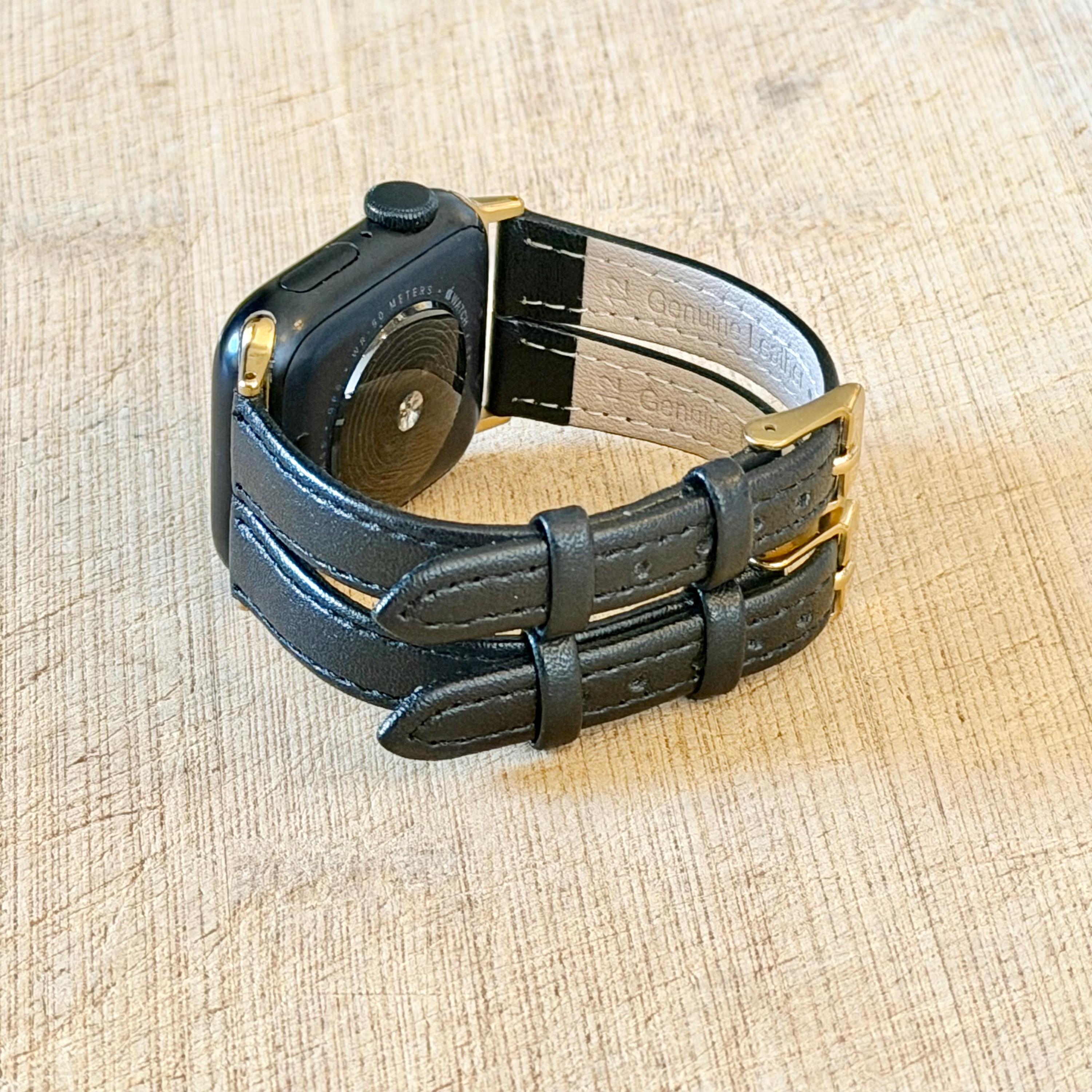 Double Straps Apple Watch Band Black Genuine Leather Cuff, Gold Accents