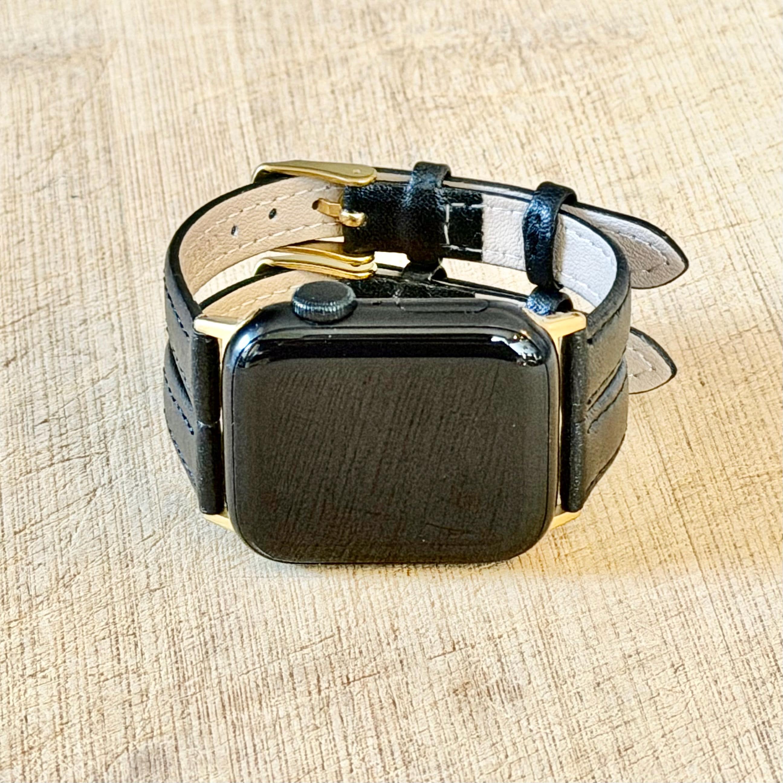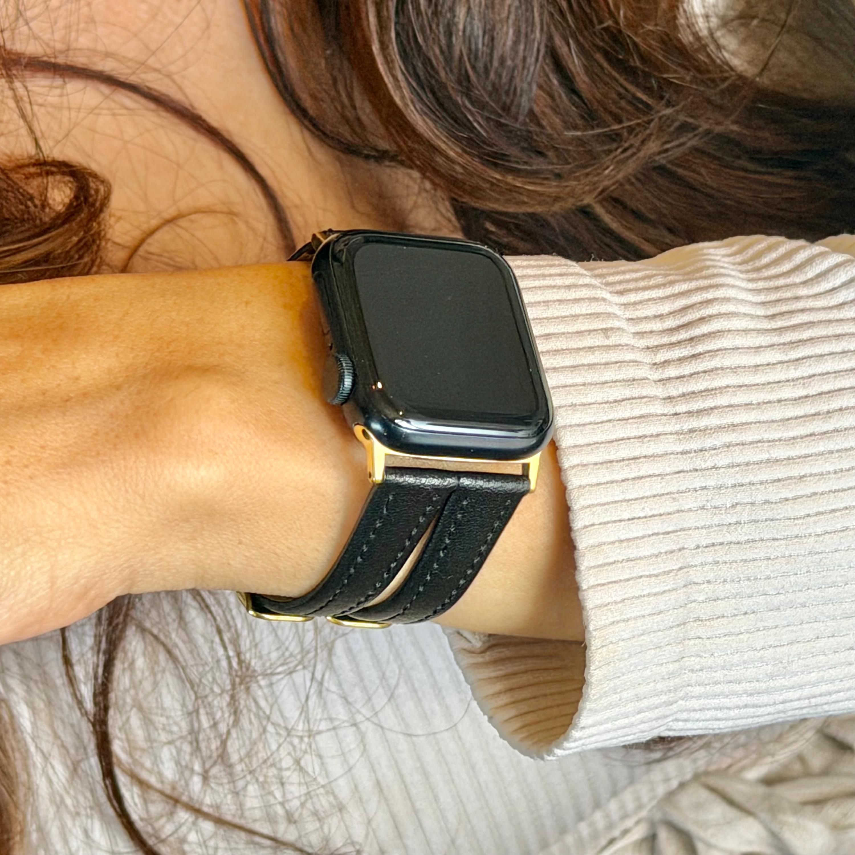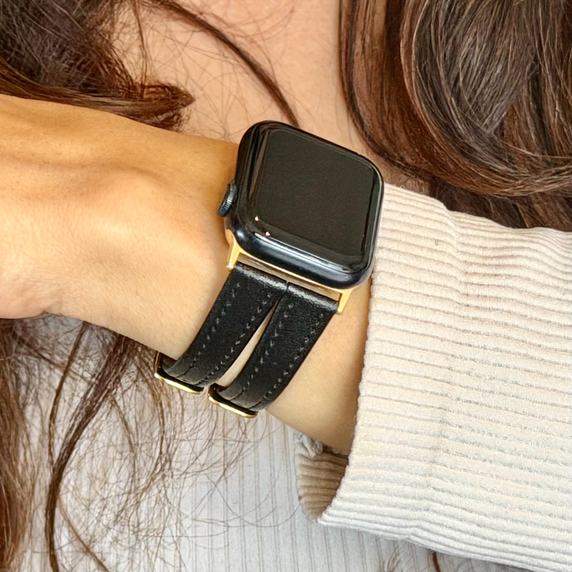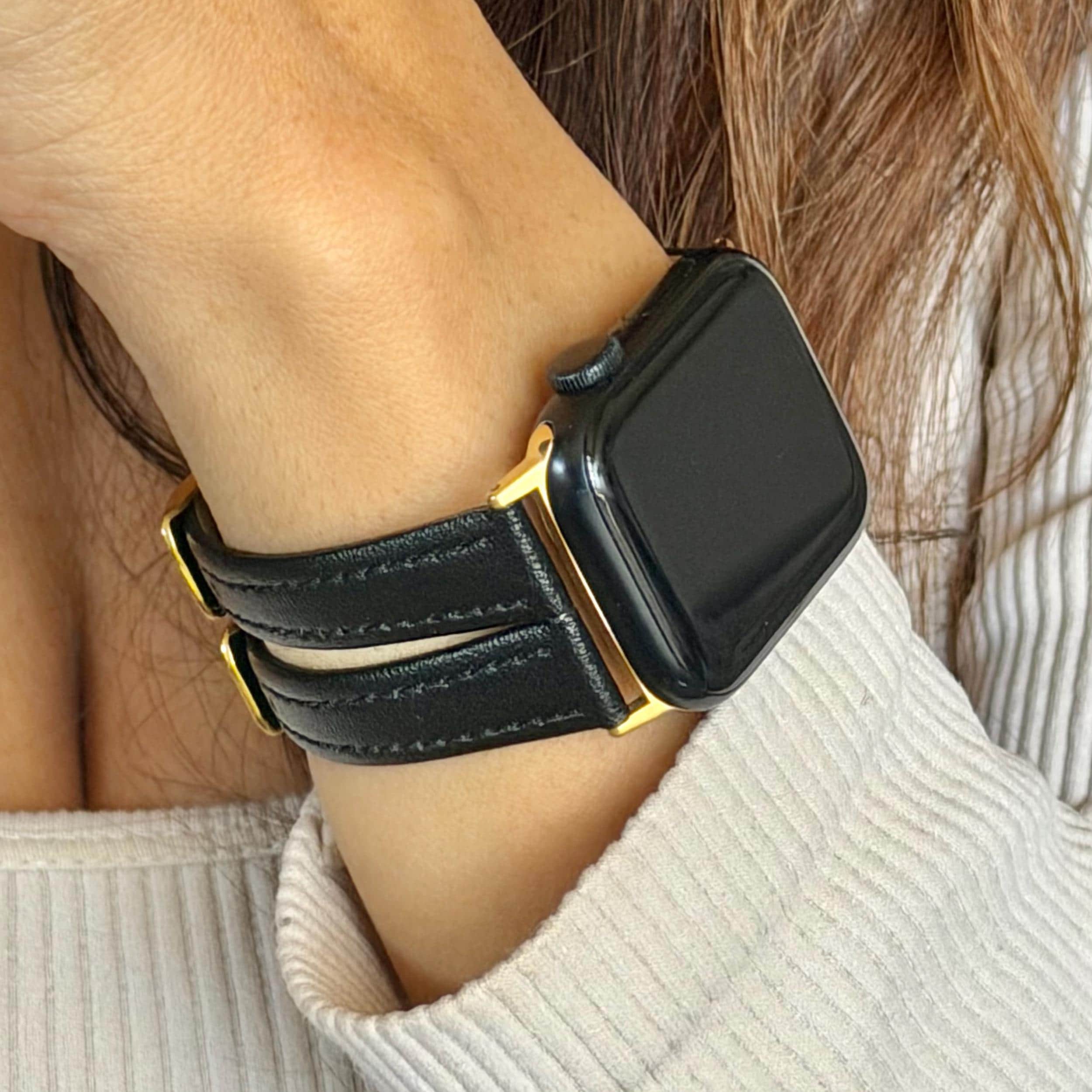 Double Straps Apple Watch Band Black Genuine Leather Cuff, Gold Accents