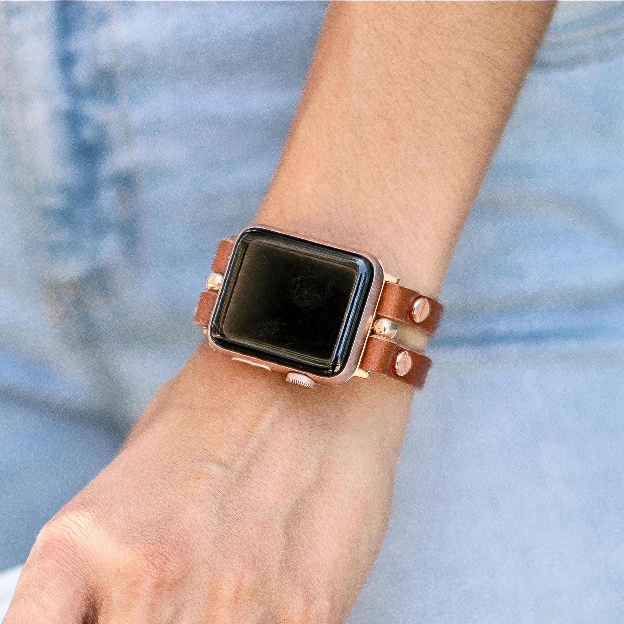 Brown Leather Apple Watch Band Rose Gold Clasp, Double Wrap Strap