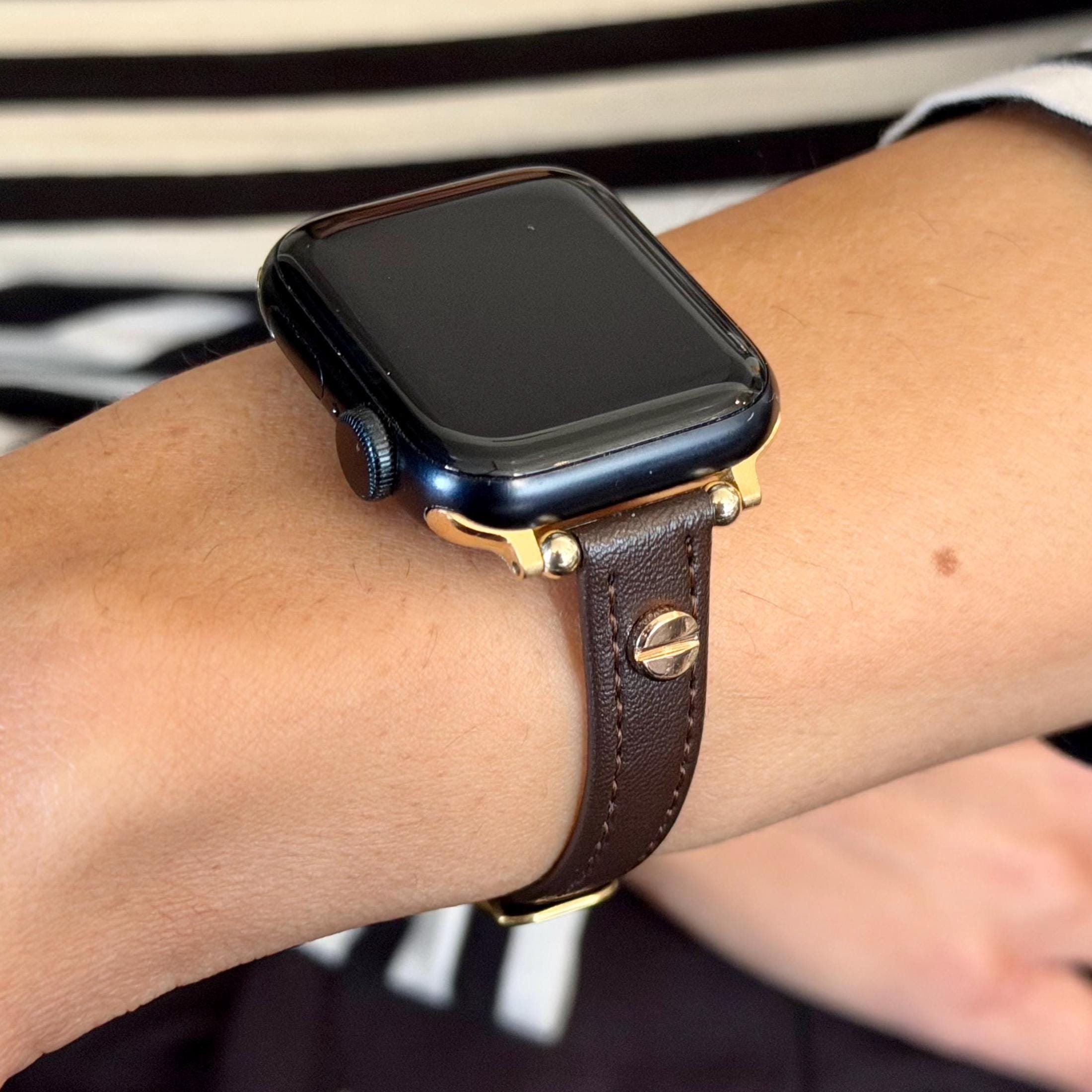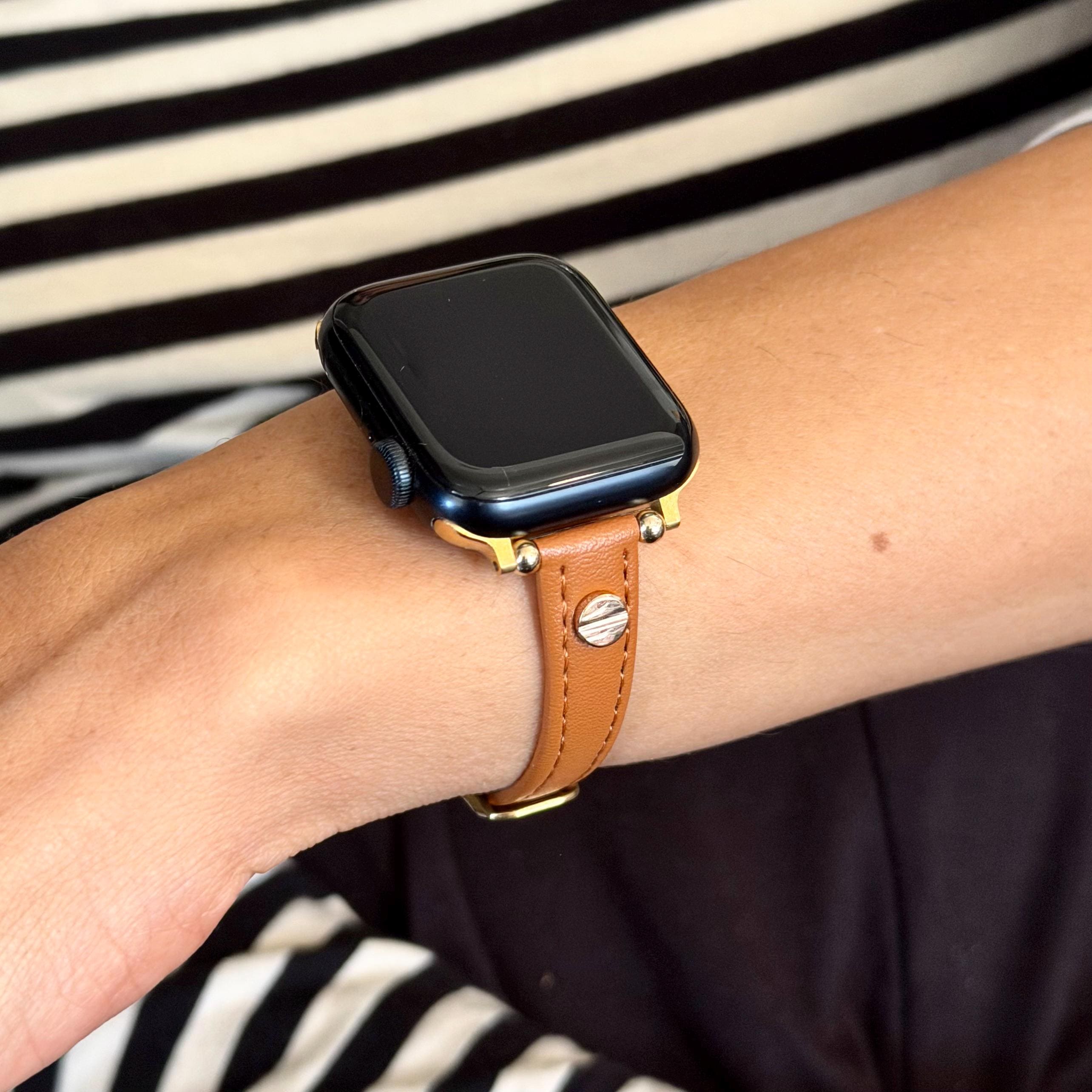Brown Leather Apple Watch Band Slim Women Strap 42mm 46mm 41mm 45mm Gold Bracelet.