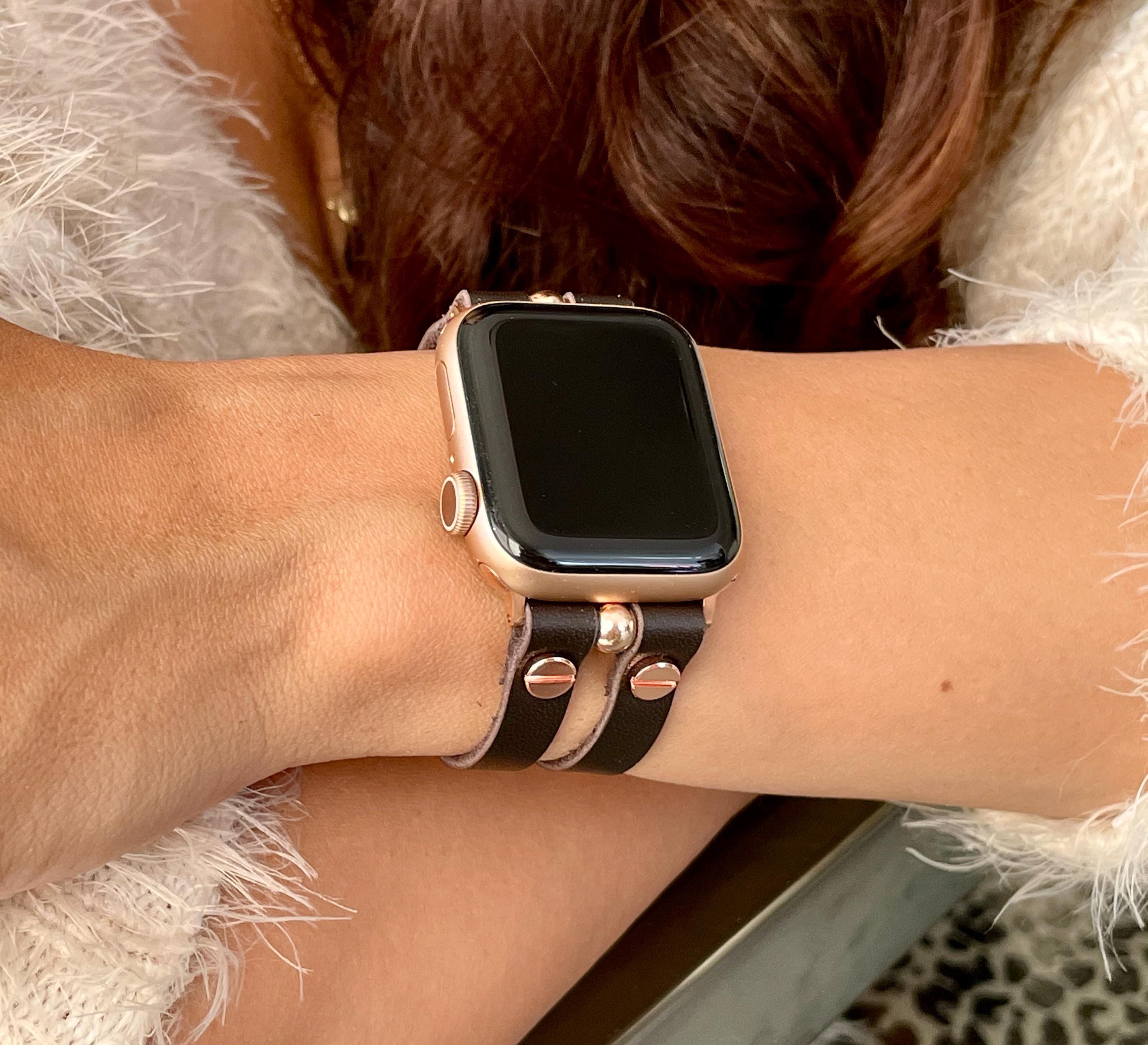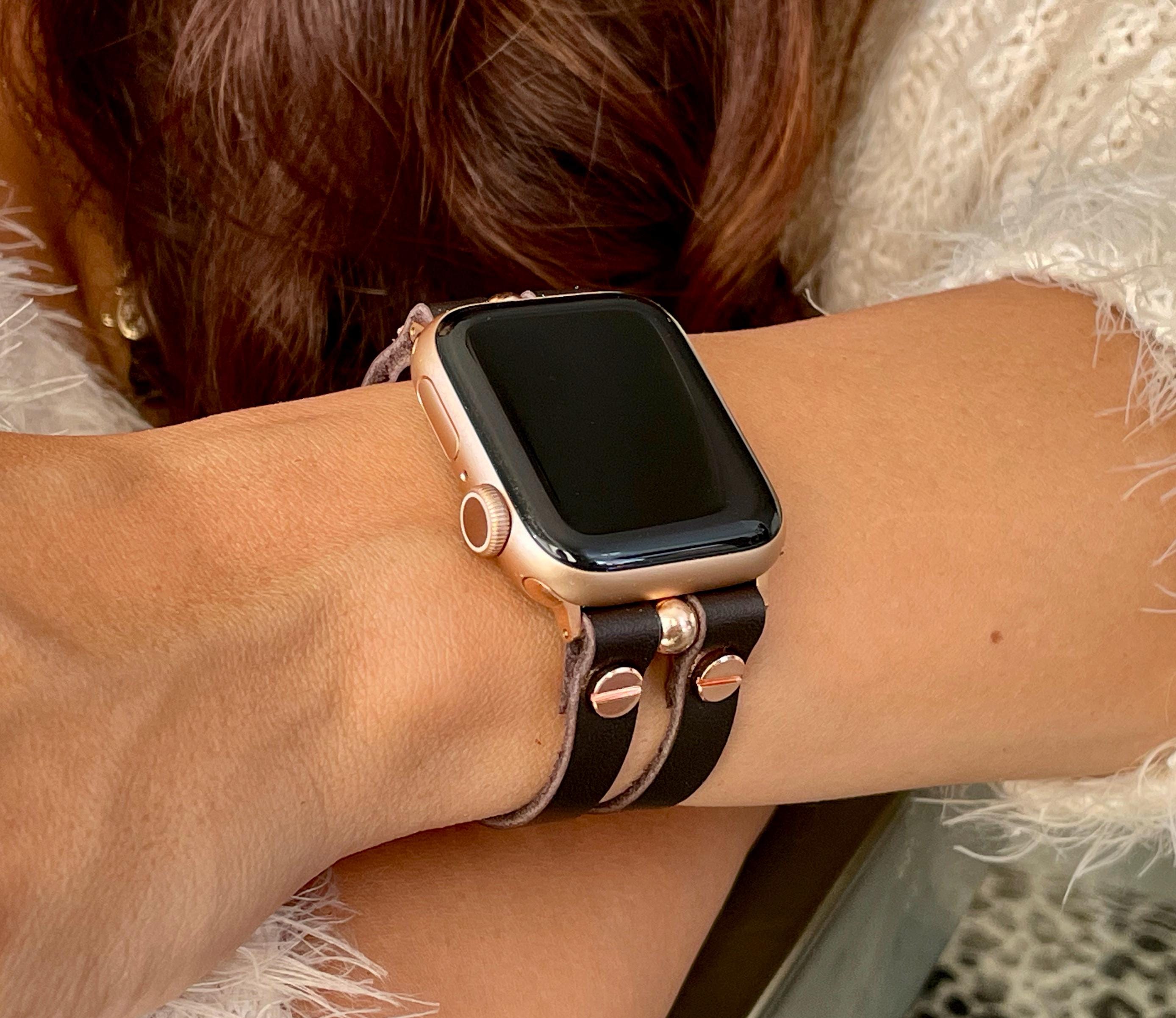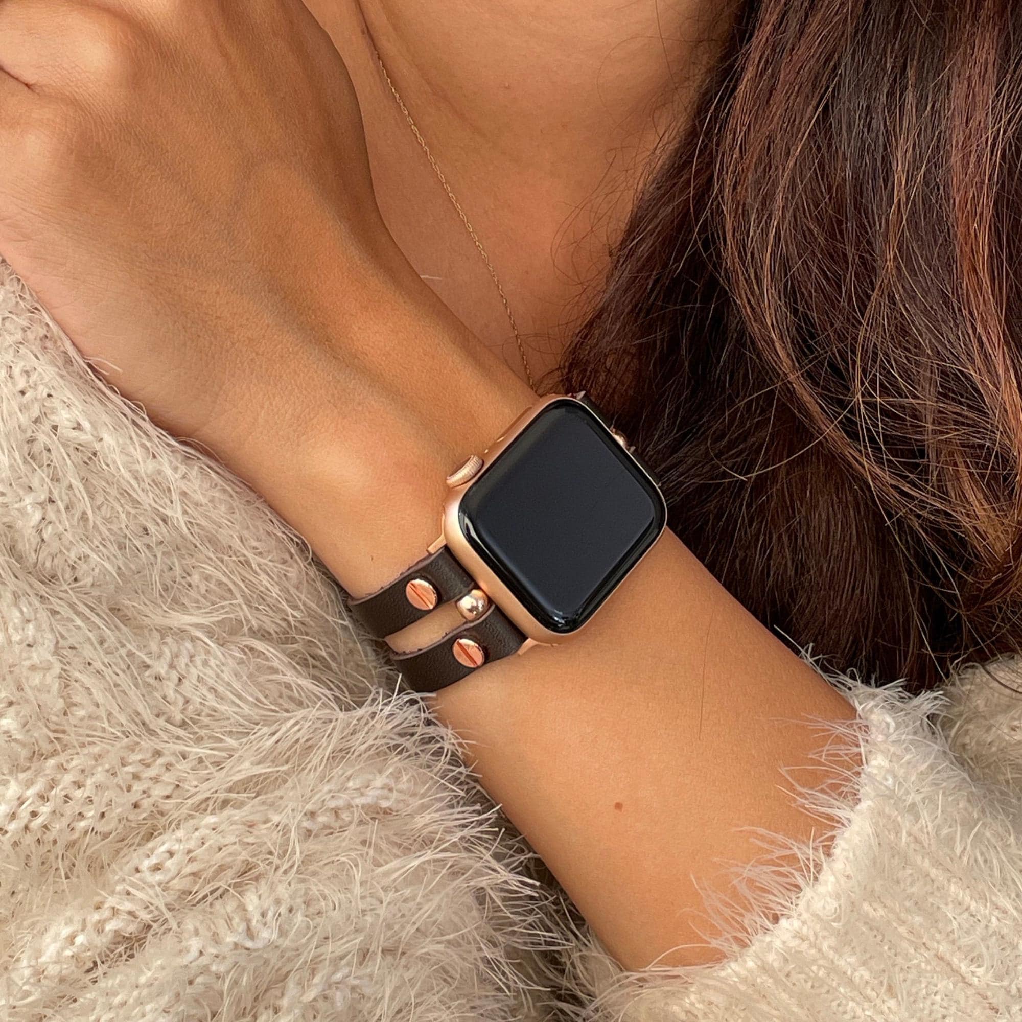 Dark Brown Leather Apple Watch Band, Double Strap Bracelet, Rose Gold Hardware, Slim, Handmade